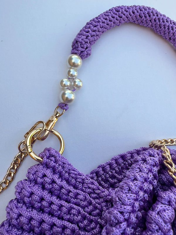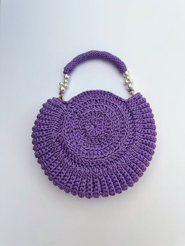 A 15" hand crocheted top handle embellished with pearl beads for a graceful touch