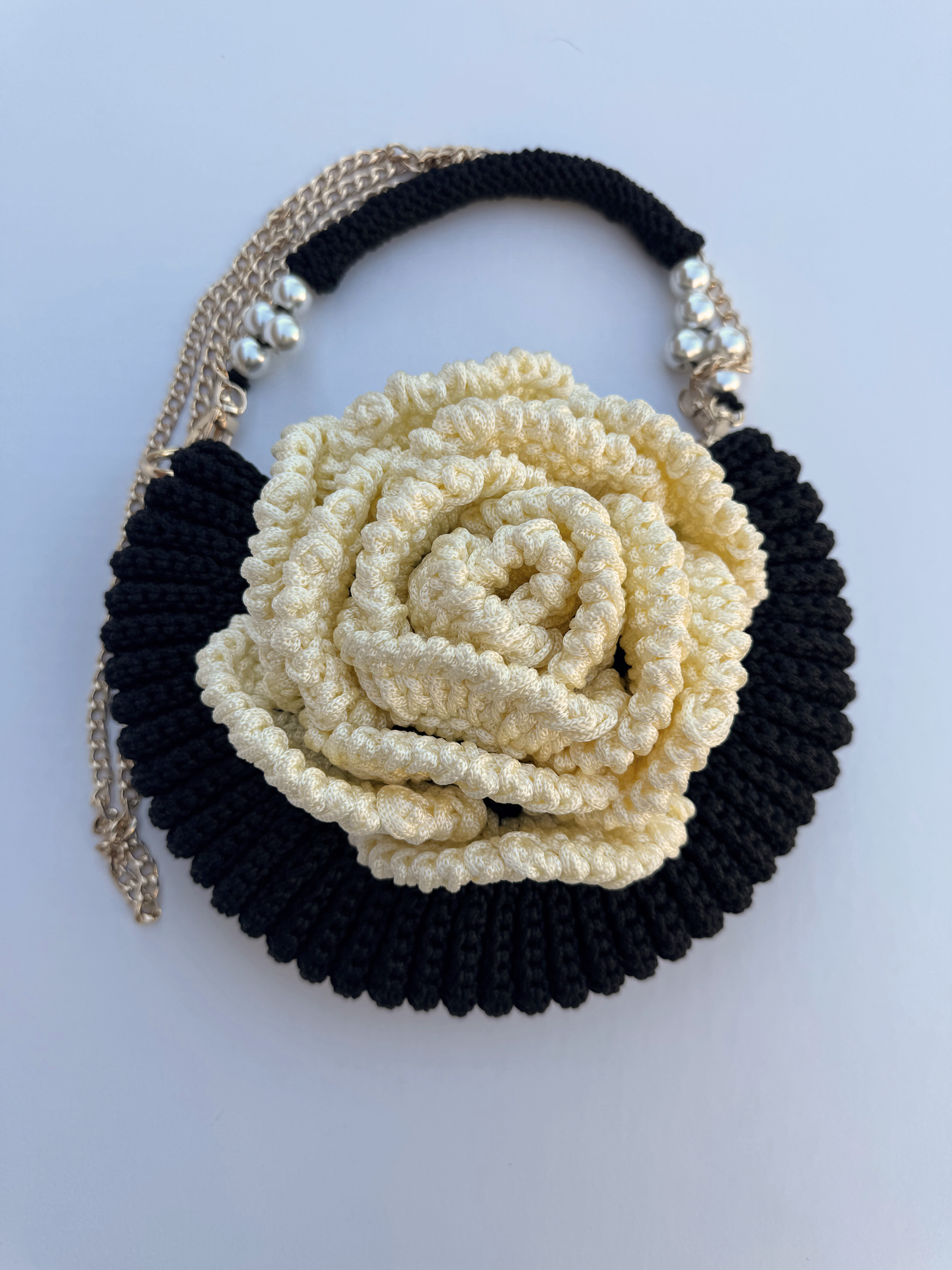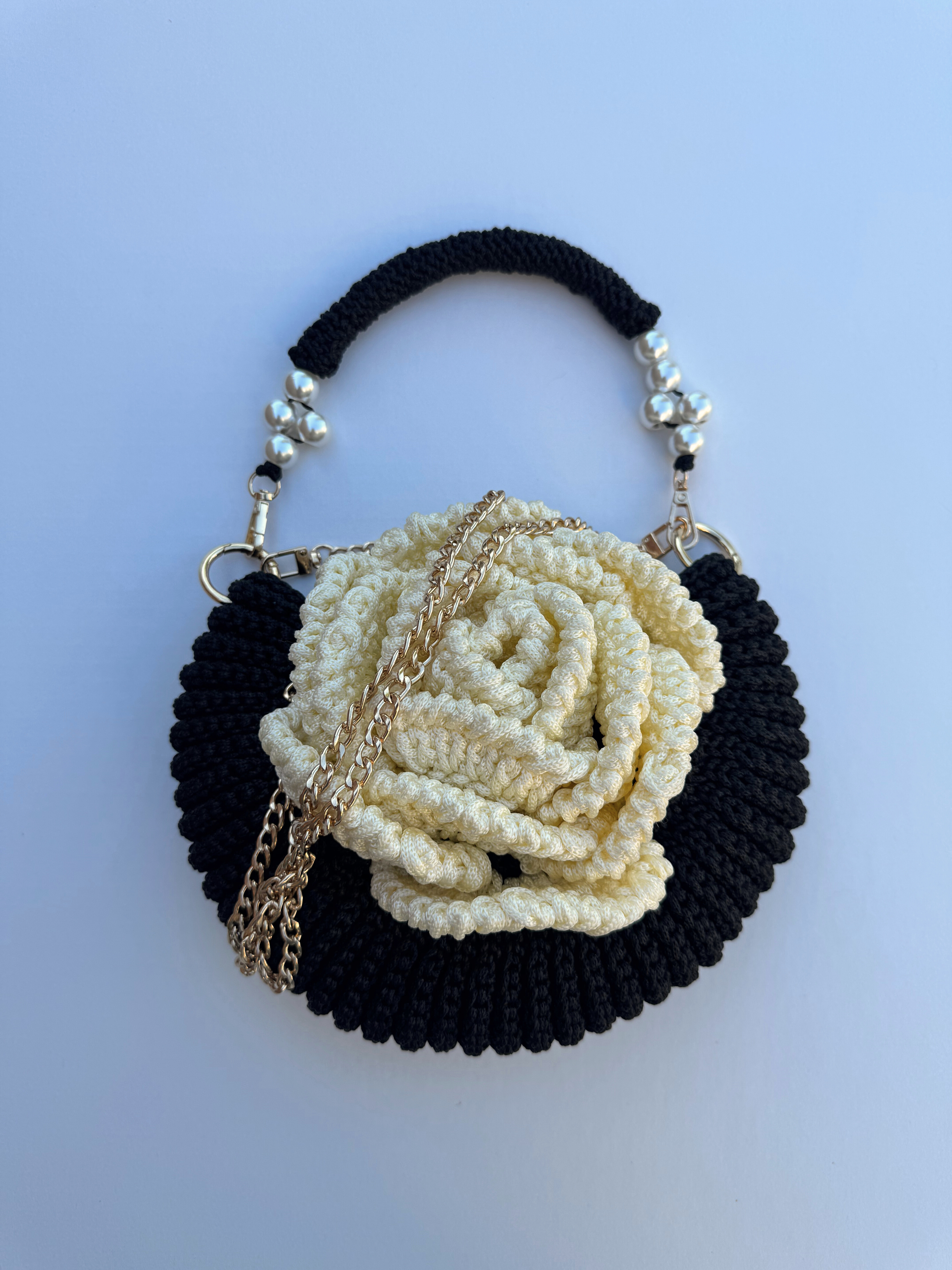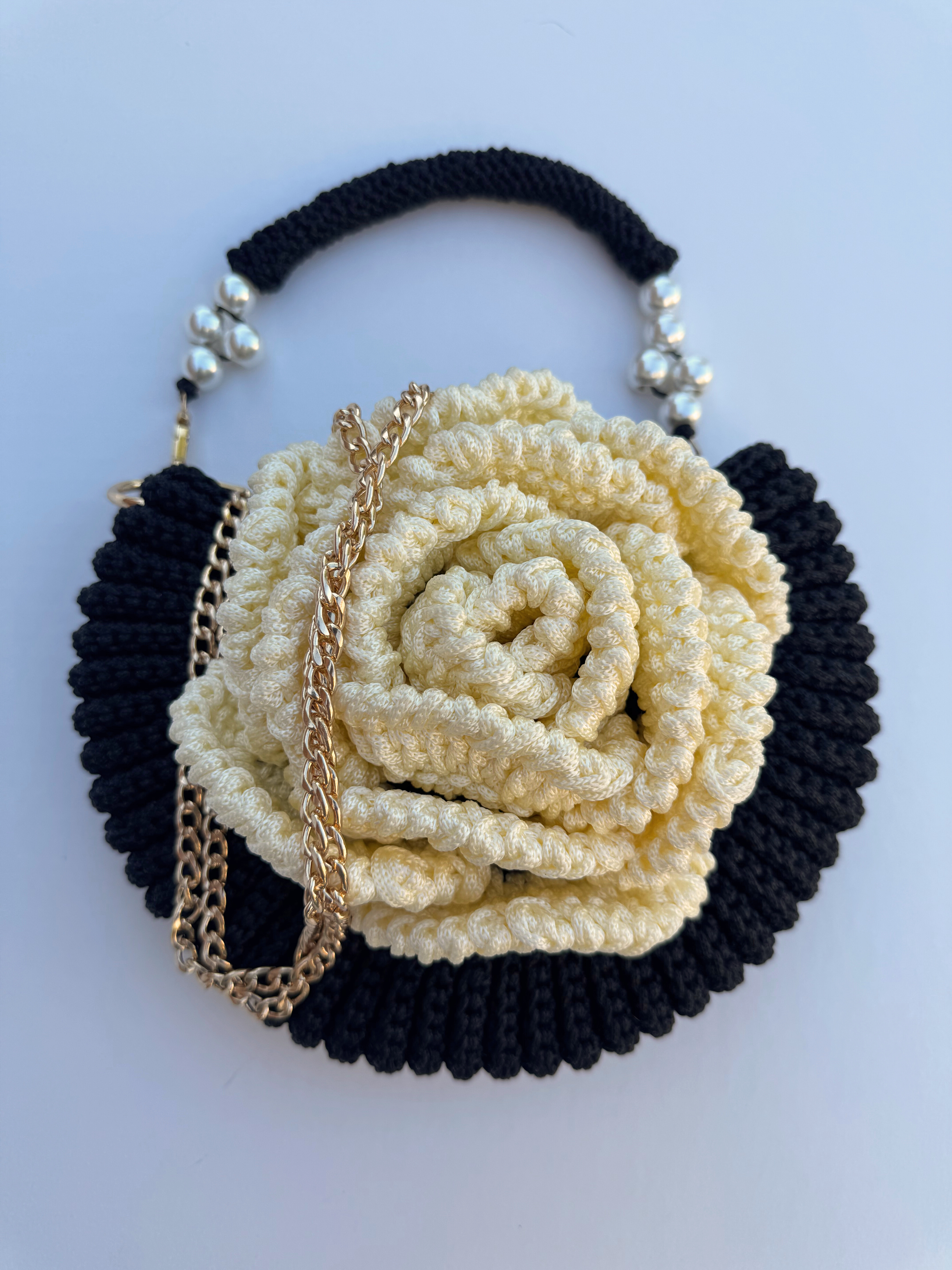 Elevate your style with this elegant handmade crochet bag featuring a stunning 3D ivory rose on a classic black base. Designed for both beauty and versatility