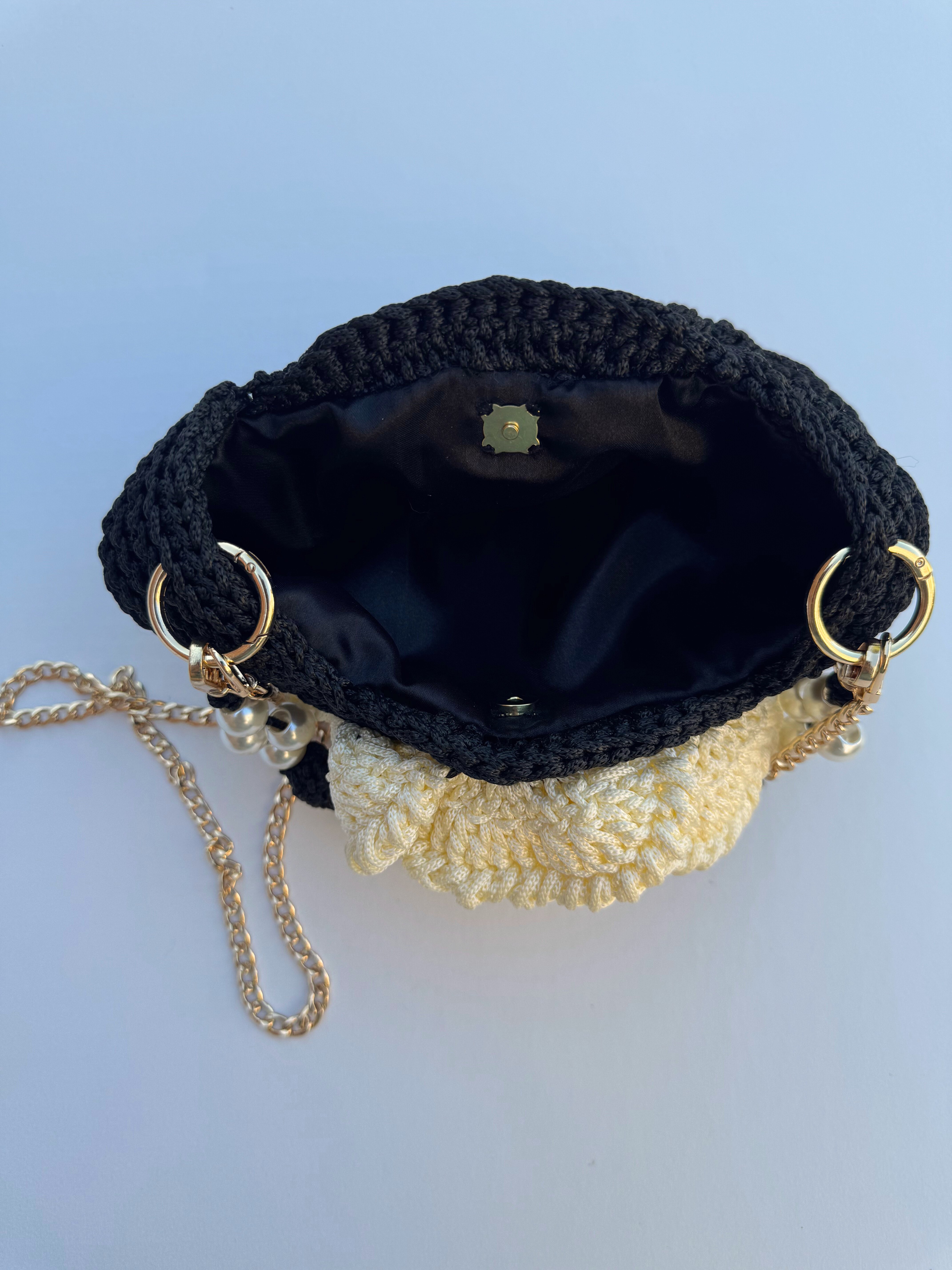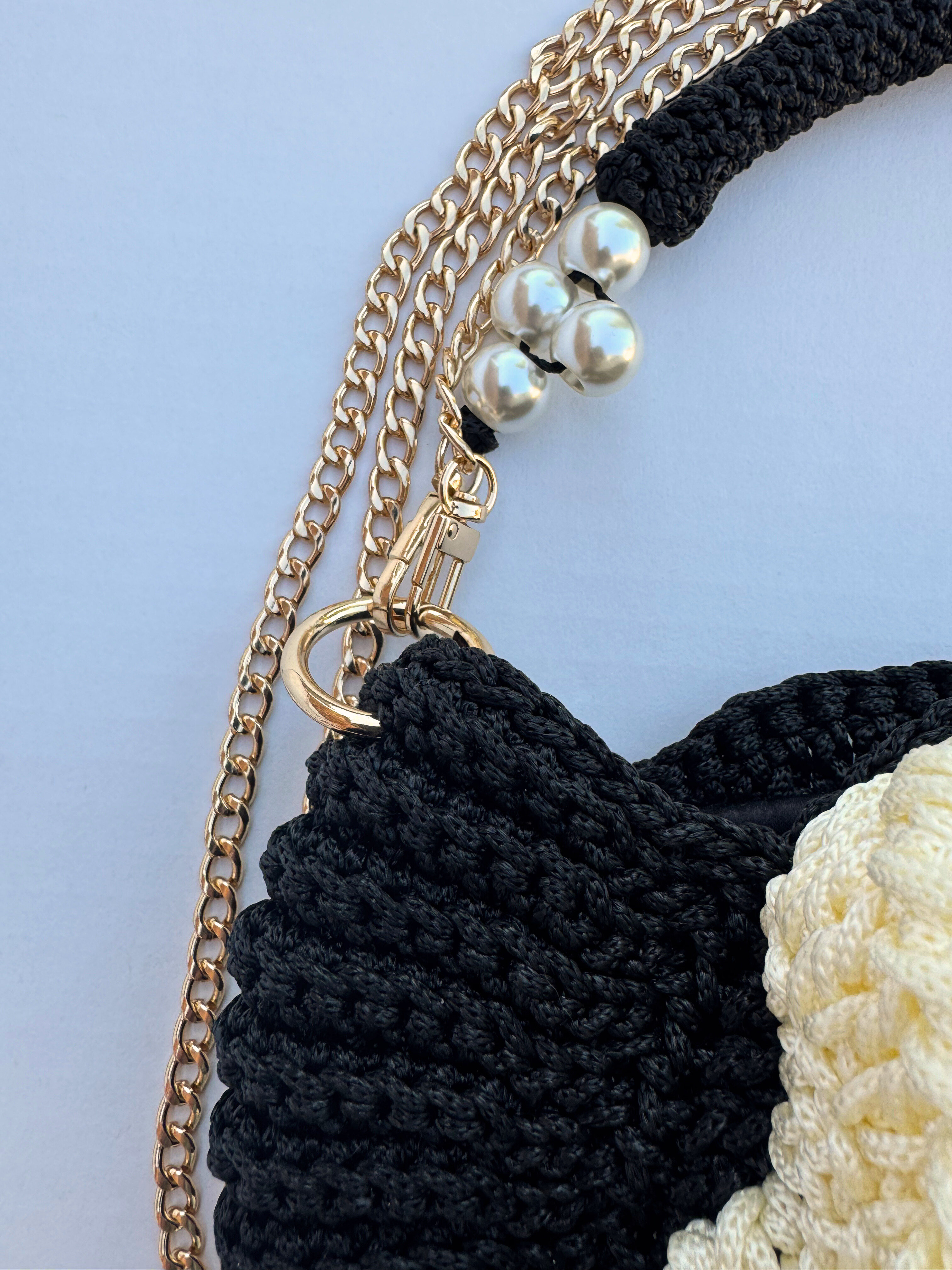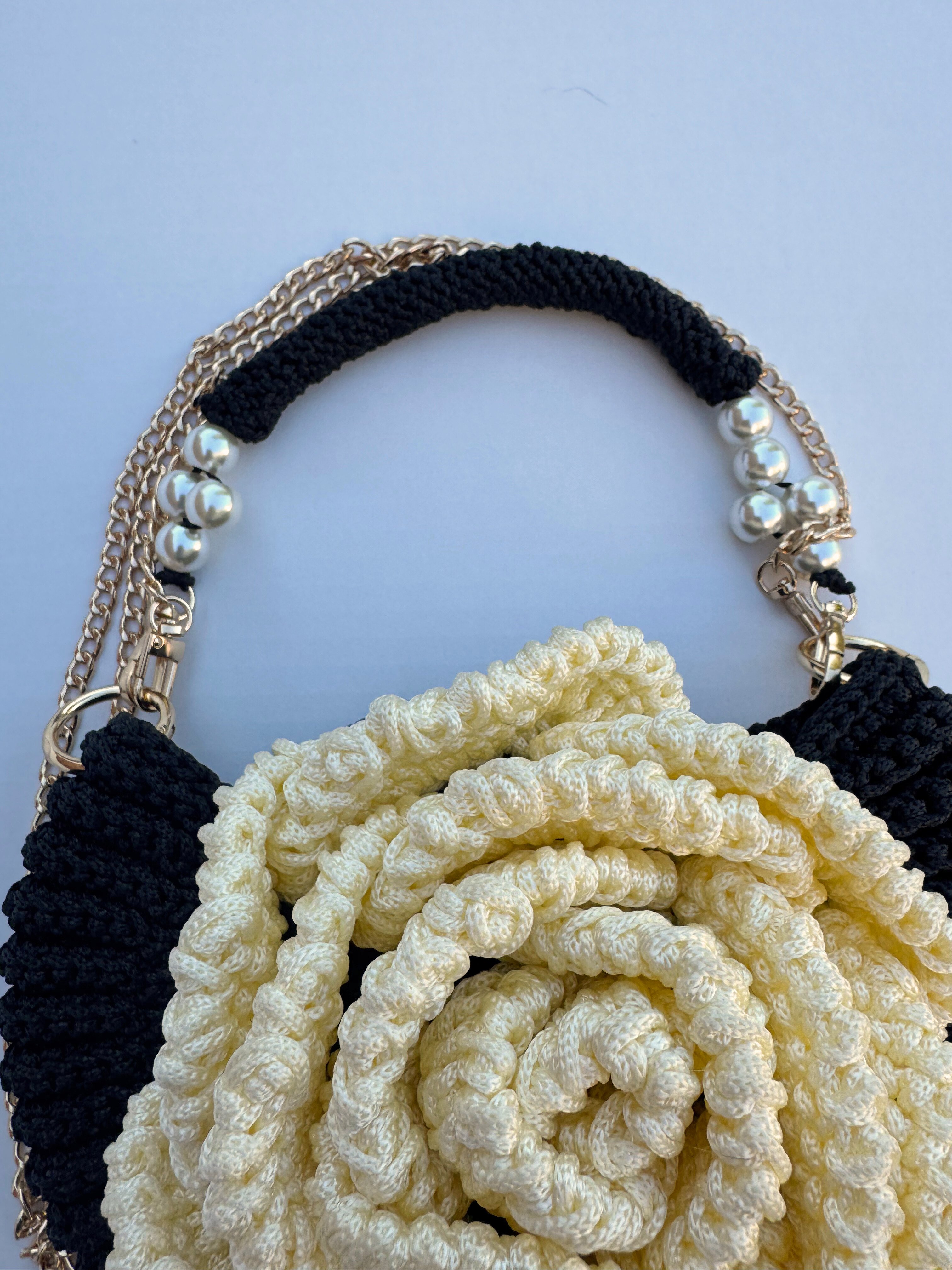 Elevate your style with this elegant handmade crochet bag featuring a stunning 3D ivory rose on a classic black base. Designed for both beauty and versatility
