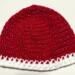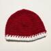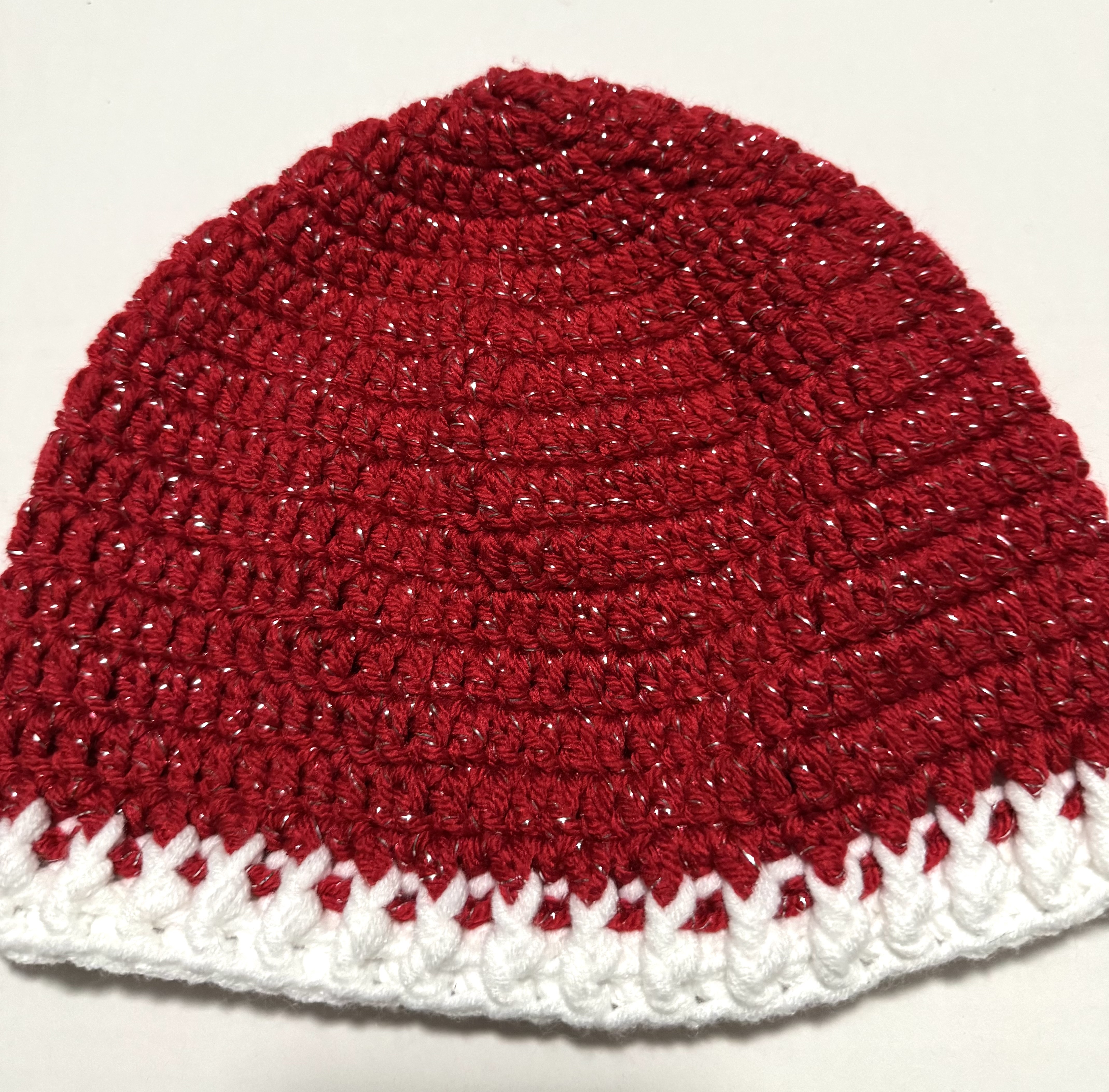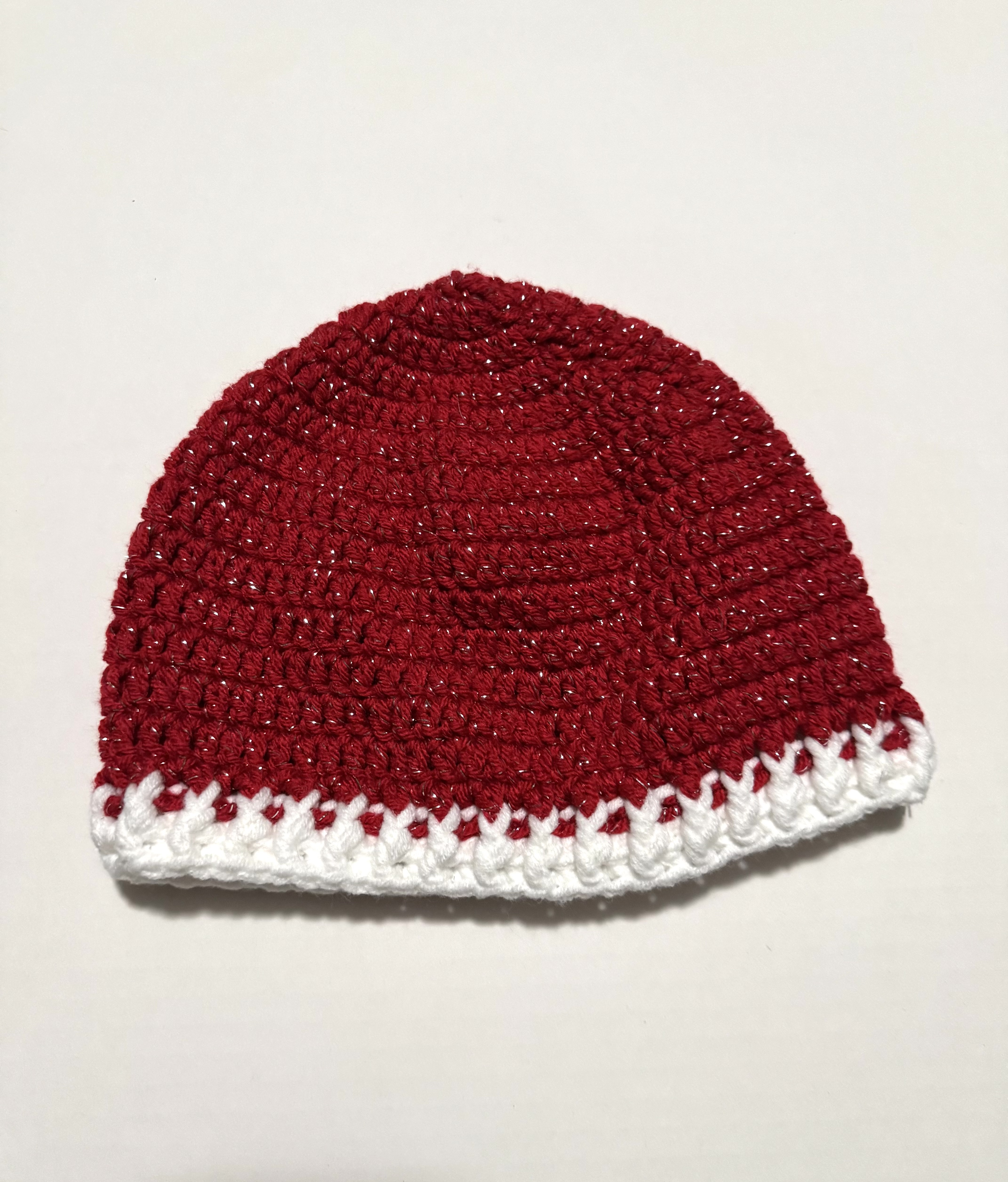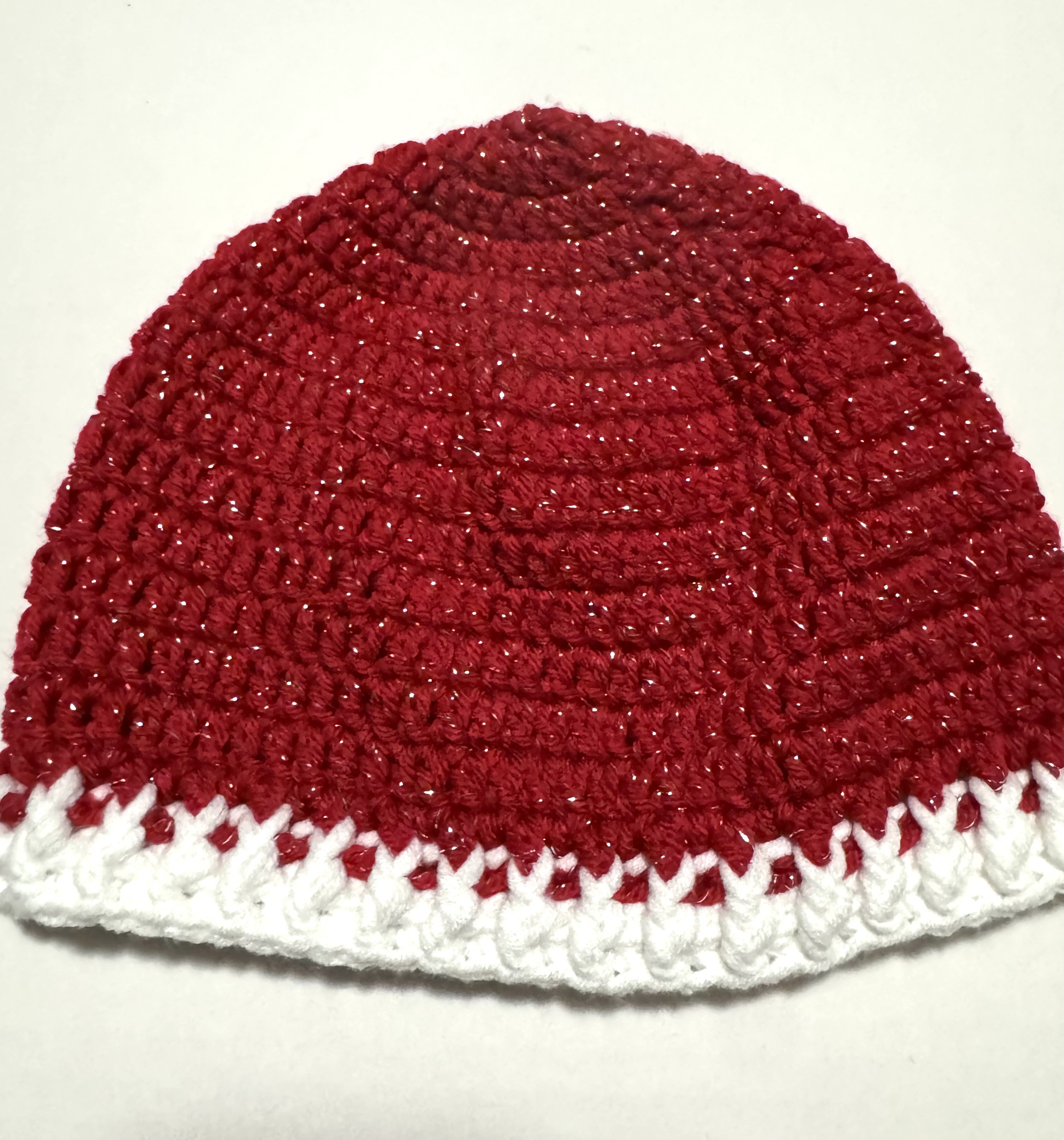This cozy hat features a rich red yarn with subtle sparkle and a soft white textured border, giving it the perfect holiday look. Lightweight, stretchy, and comfortable for everyday wear in winter.