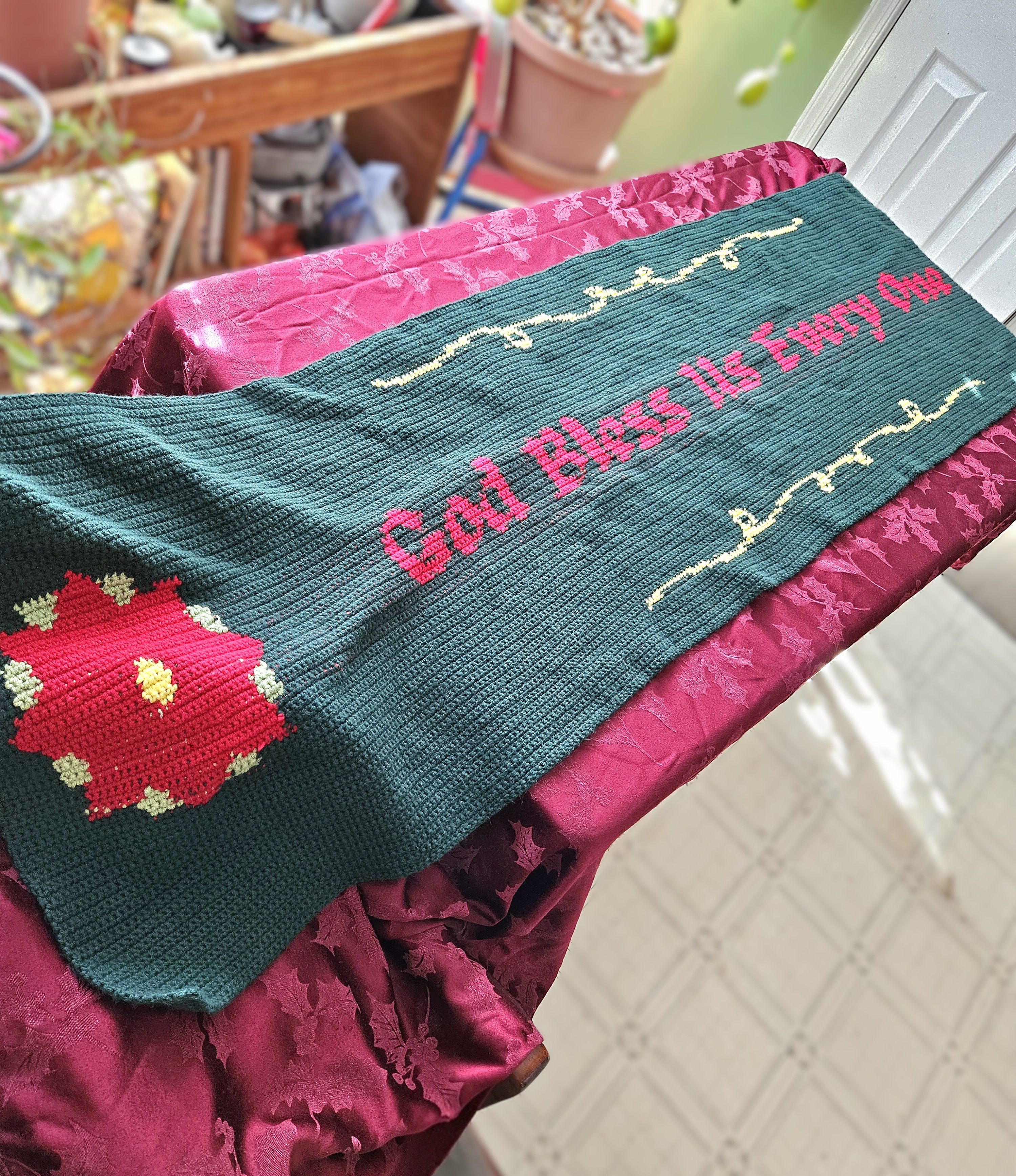 Celebrate Christmas with the joy and gratitude of the Cratchet family with this EruvandiCrafts original design, inspired by the classic book, A Christmas Carol by Charles Dickens. This crochet Christmas table runner, handmade in traditional red and green, and featuring a quote from Tiny Tim in the center and red pointsettias on either end, would make the perfect centerpiece for any family gathering during the holiday season. It could also work as a dresser runner, or even a banner that you hang on the wall. Keep it for yourself, or give it as a gift to your favorite book lover, it’s up to you! The runner was photographed on a 6 foot long white folding table.