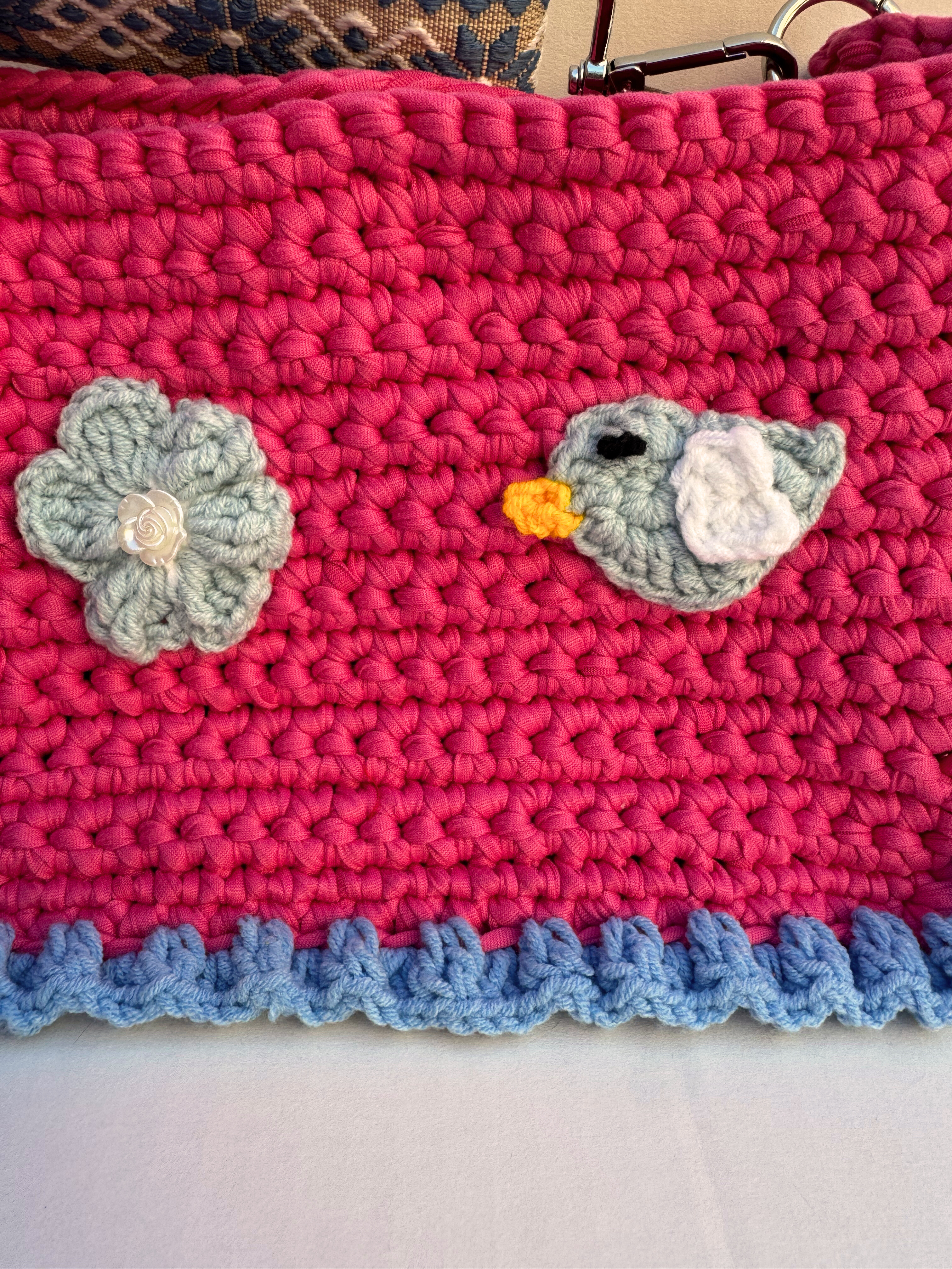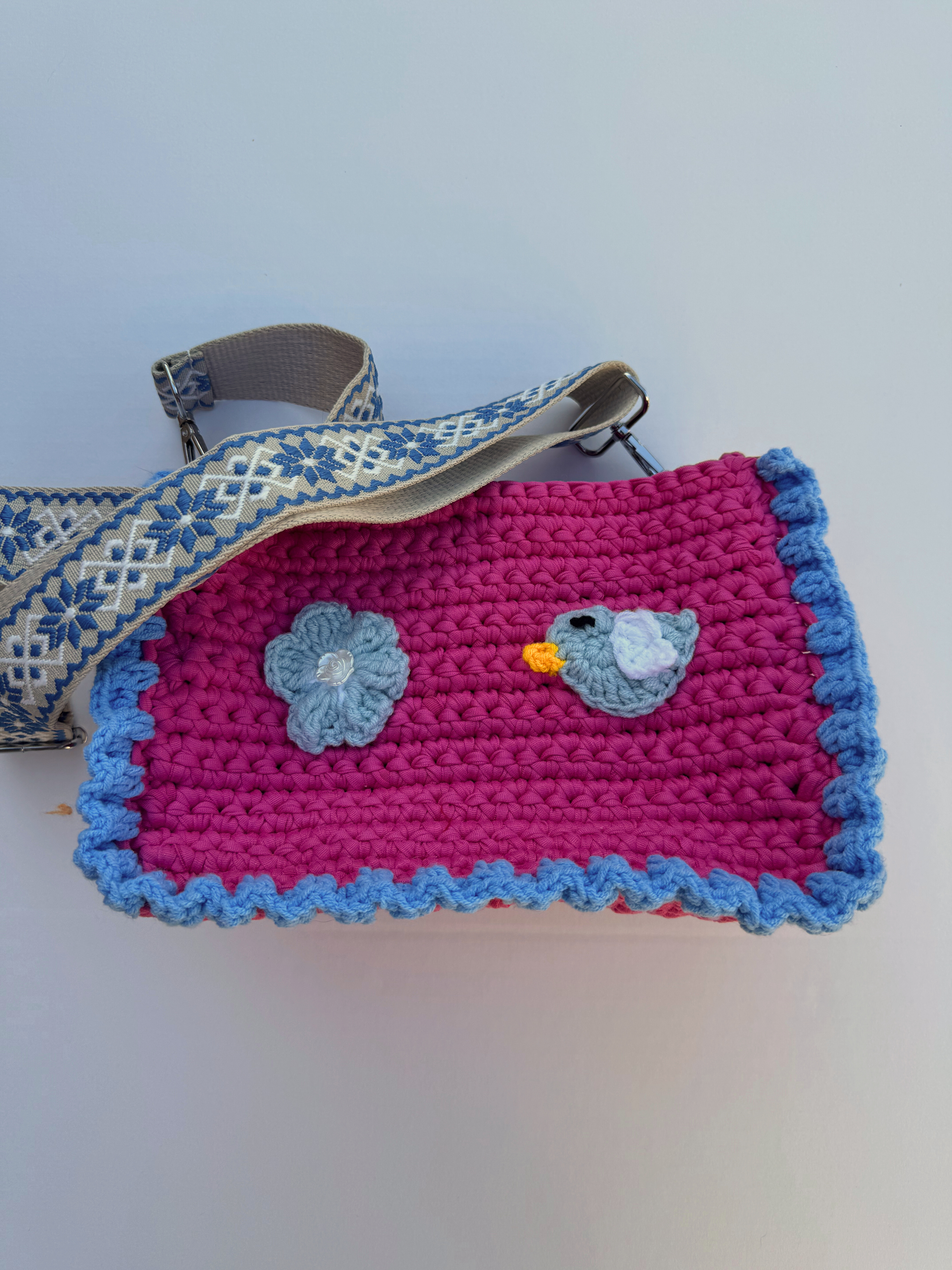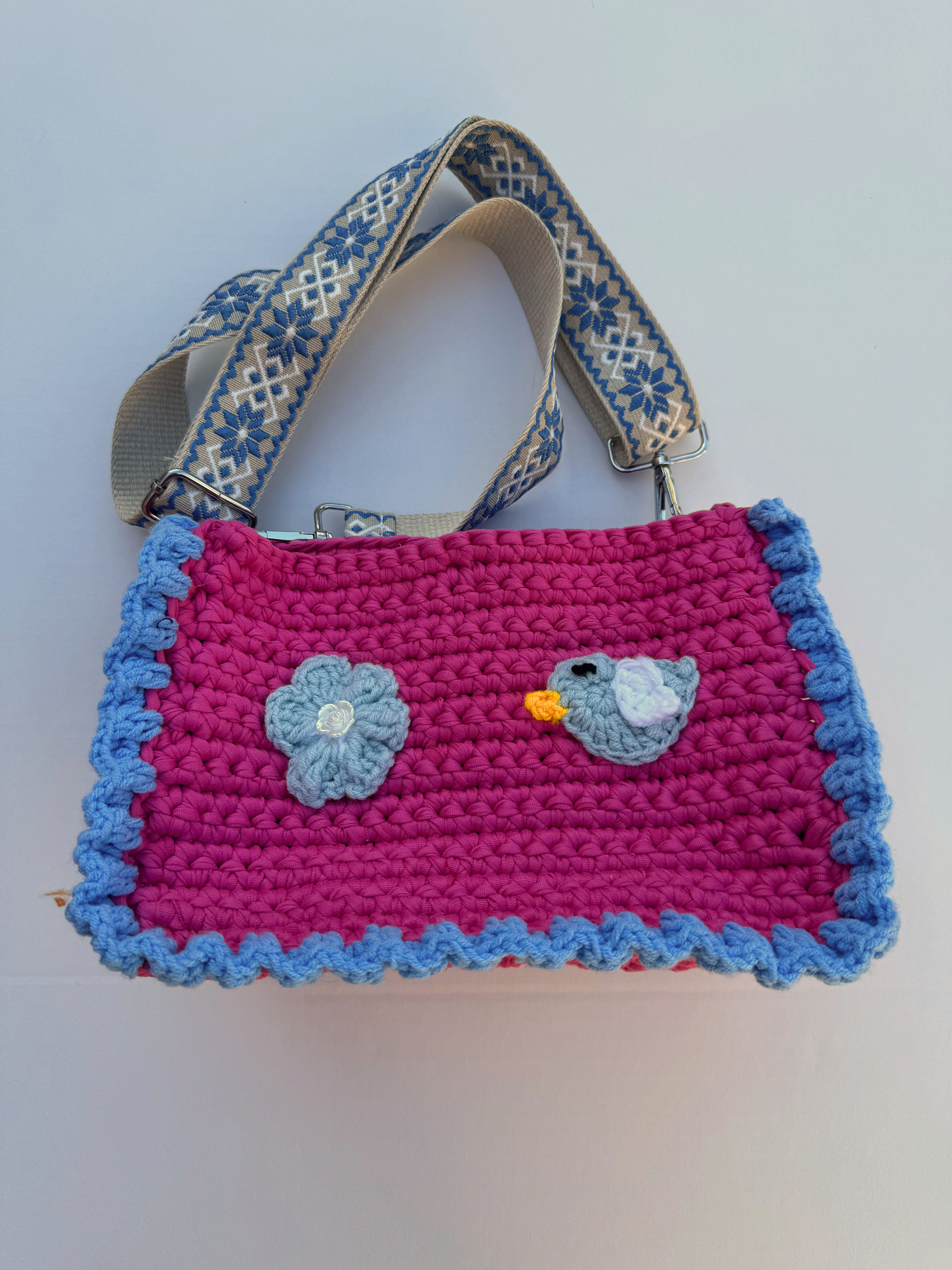 This unique bag is handcrafted with a vibrant magenta body, beautifully framed with a soft sky-blue ruffled border, and decorated with a crochet bird and flower applique for a playful, happy look.