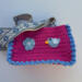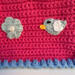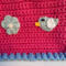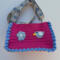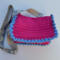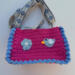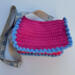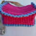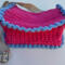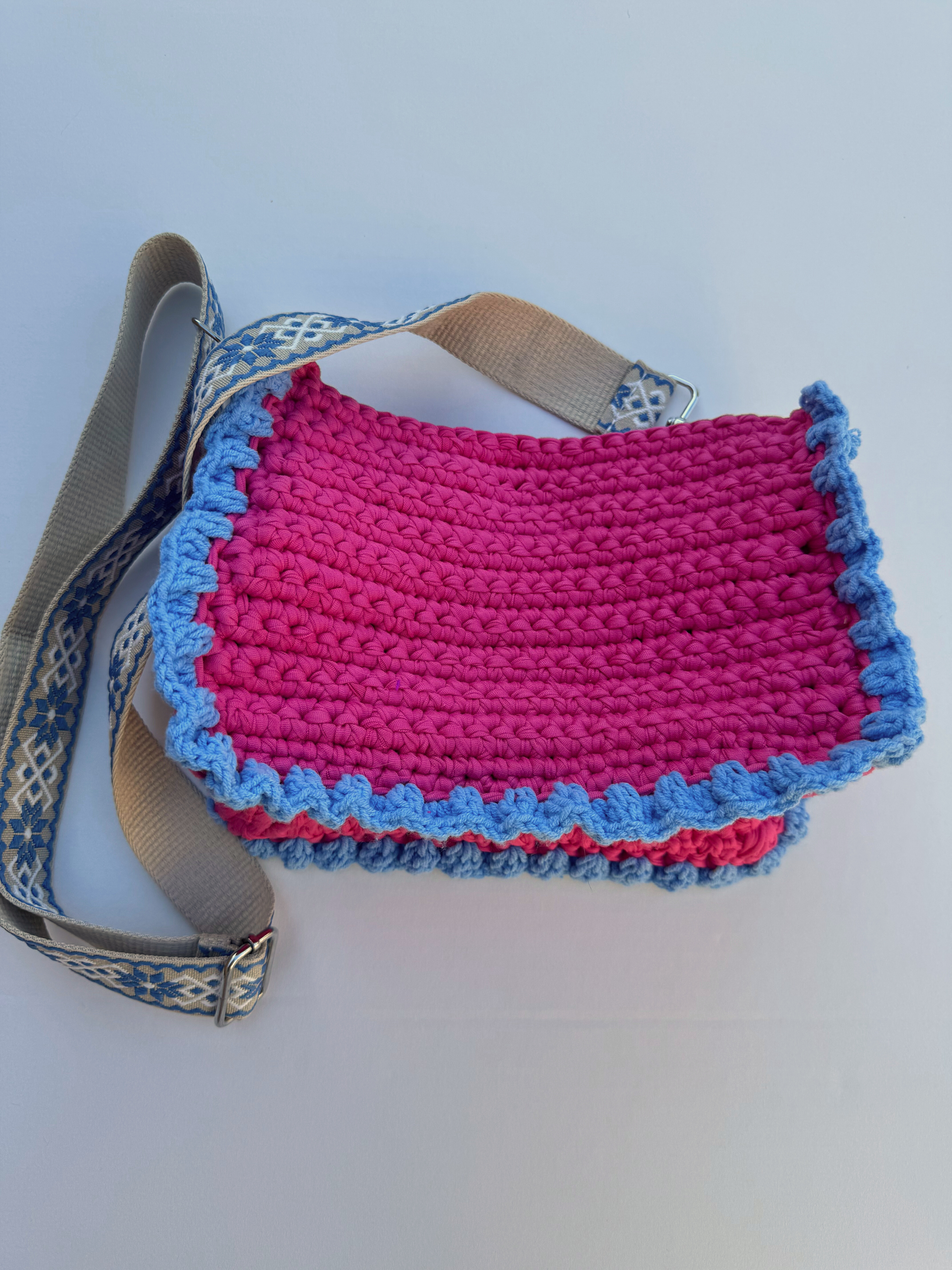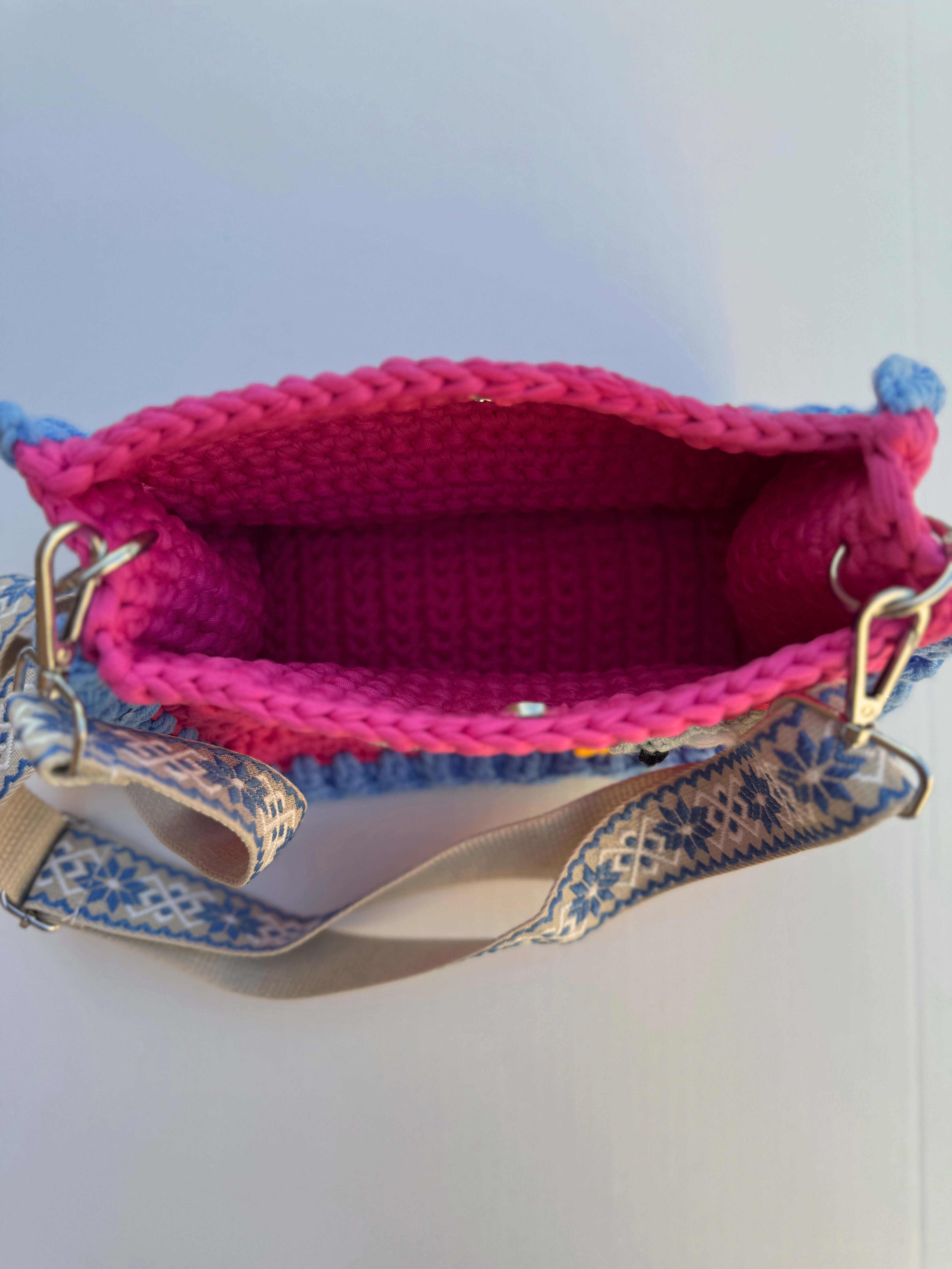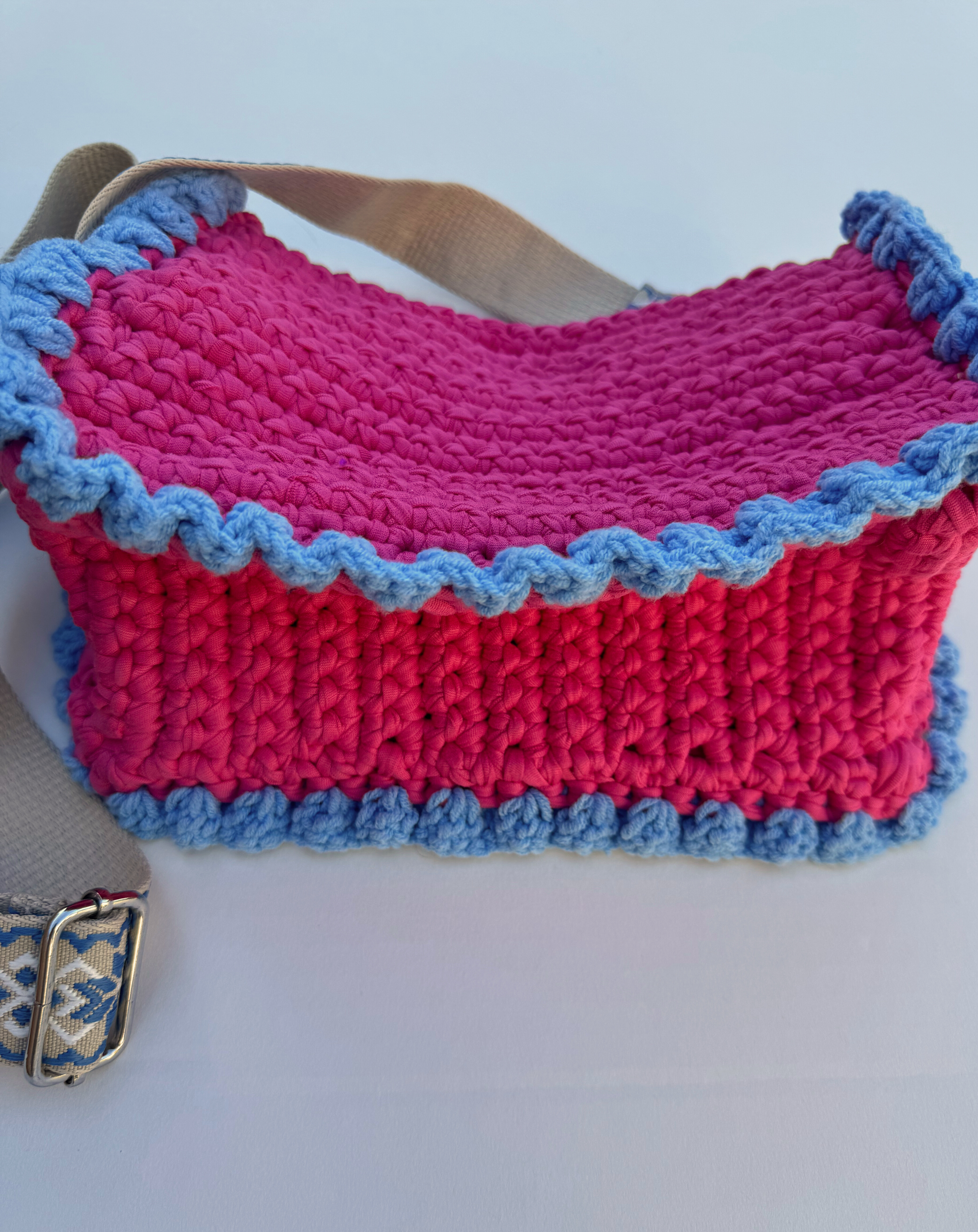 This unique bag is handcrafted with a vibrant magenta body, beautifully framed with a soft sky-blue ruffled border, and decorated with a crochet bird and flower applique for a playful, happy look.