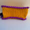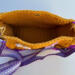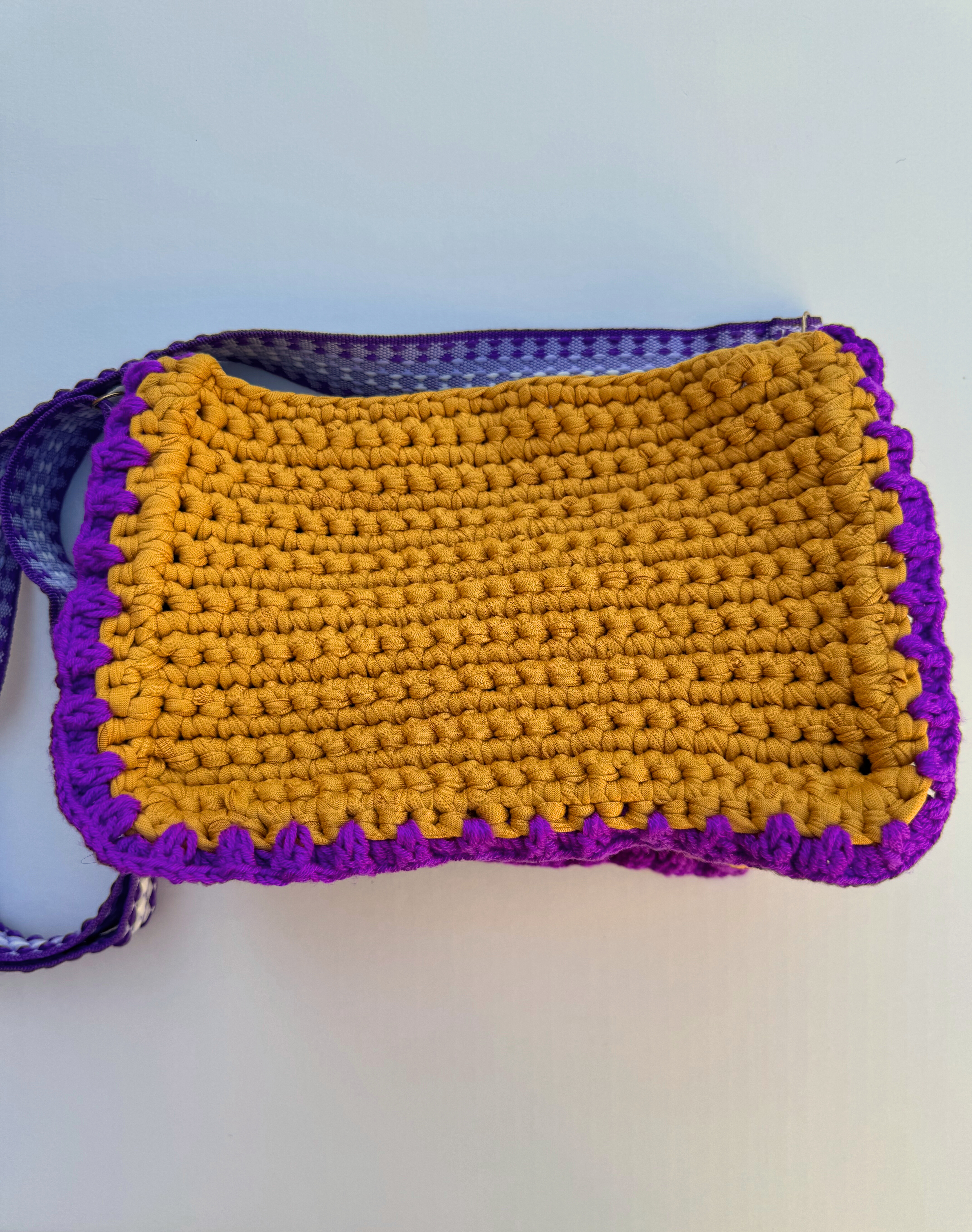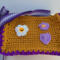 The bag features a warm mustard base with a vibrant purple border, decorated with three adorable appliques: