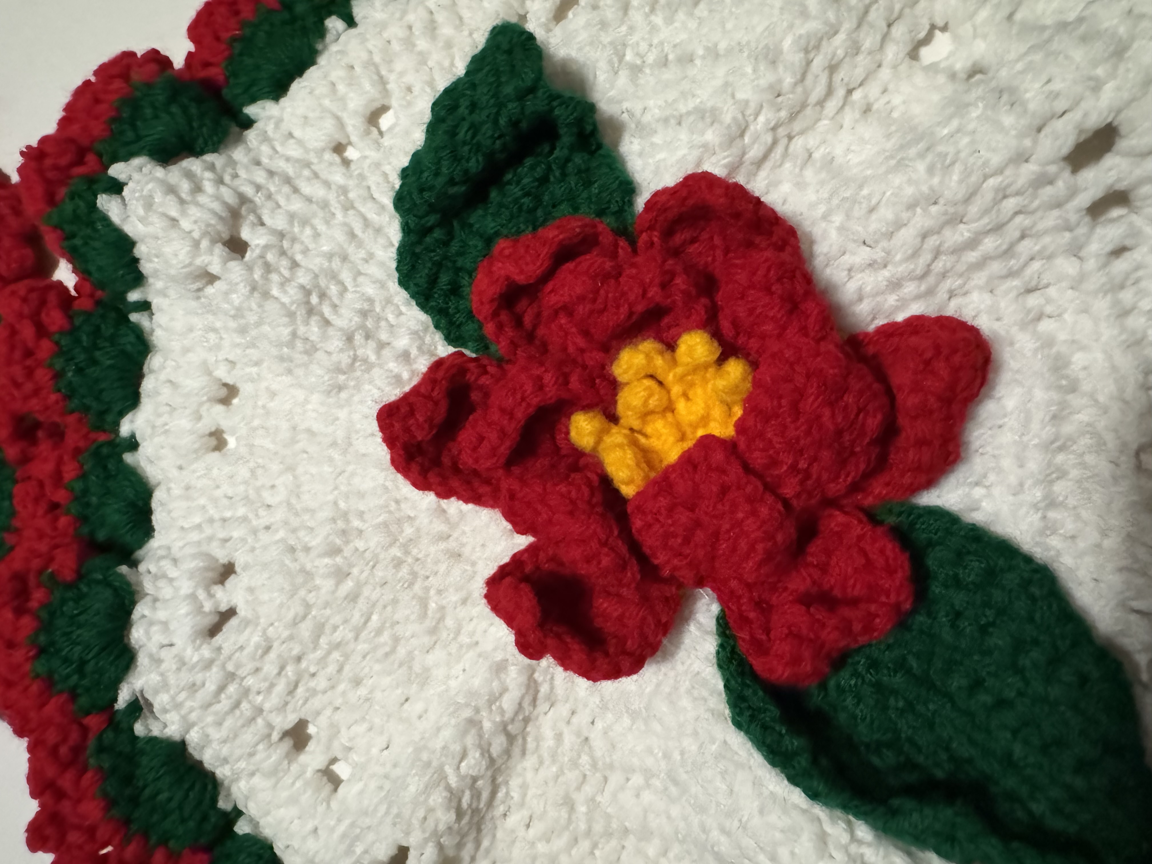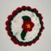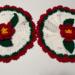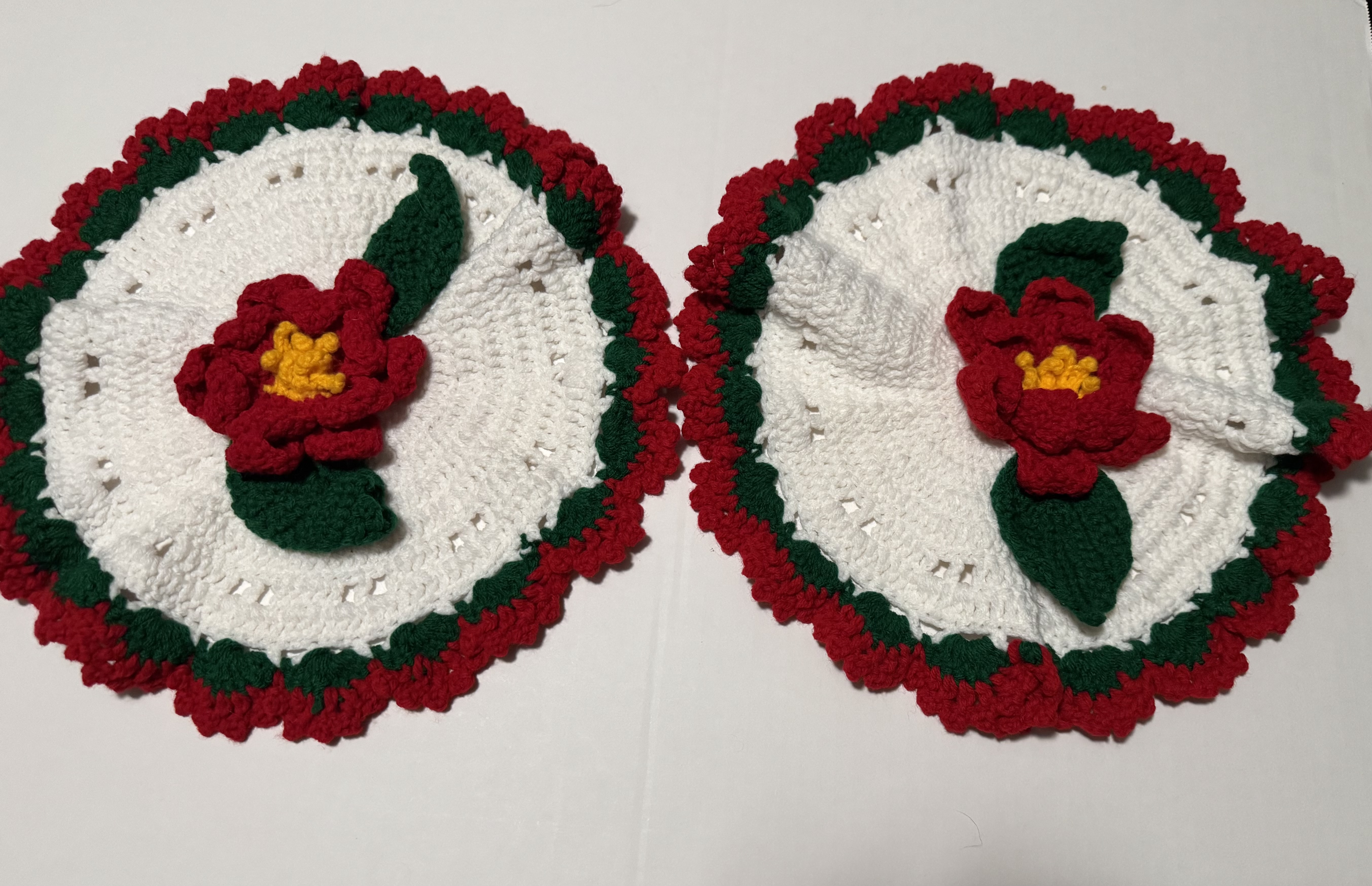 Each doily features a beautifully textured red flower with green leaves, framed by festive red and green scalloped edges. Made with high-quality cotton yarn, these pieces are perfect for decorating coffee tables, dining rooms, kitchens, entryways, or gifting during the holiday season.