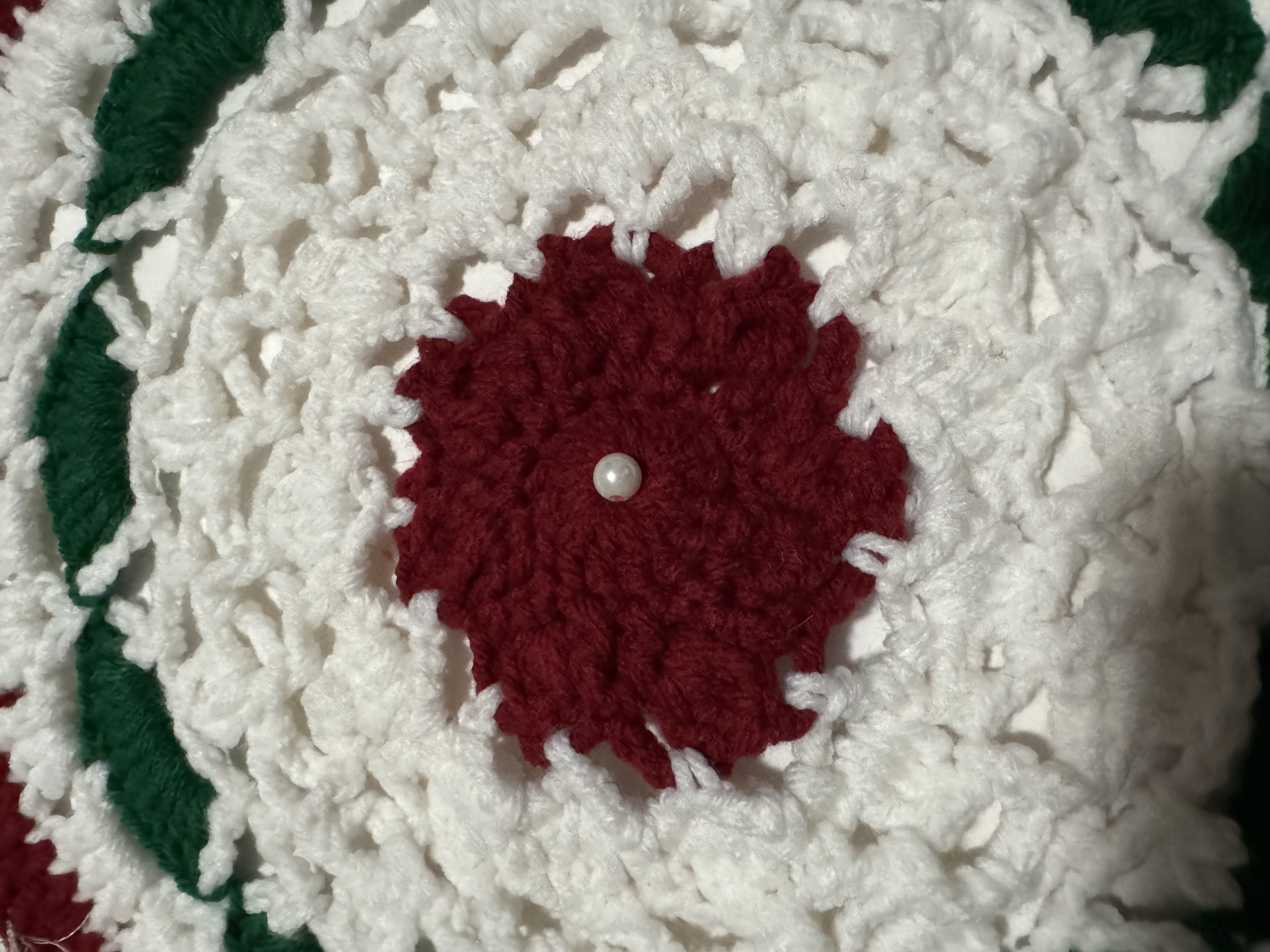 Bring a touch of handmade Christmas charm into your home with these Festive Holiday Bloom Crochet Doilies. Each doily is crafted with soft, high-quality yarn in classic holiday colors, deep red, evergreen, and crisp white, creating a beautiful, layered petal design that brightens any space.