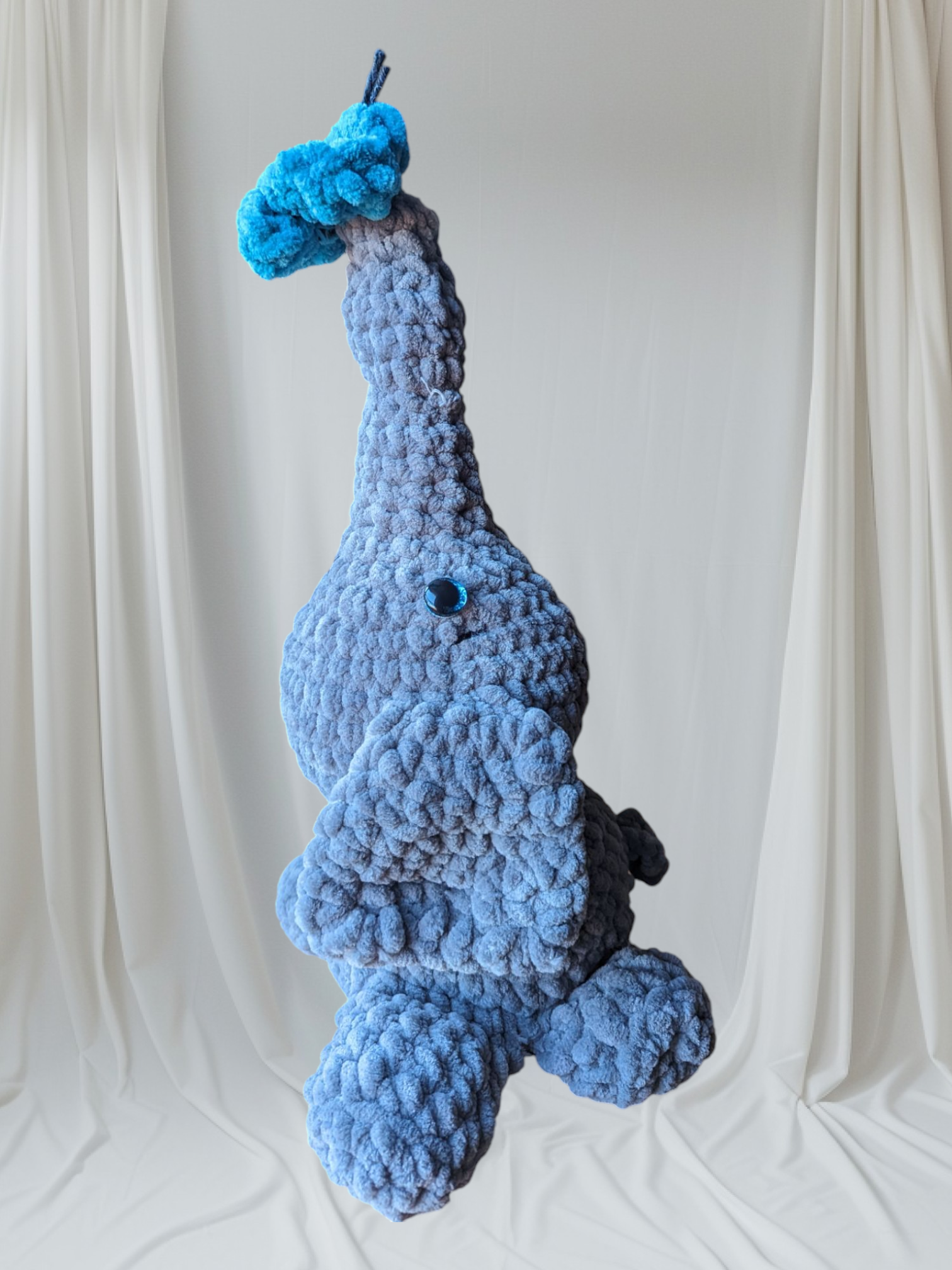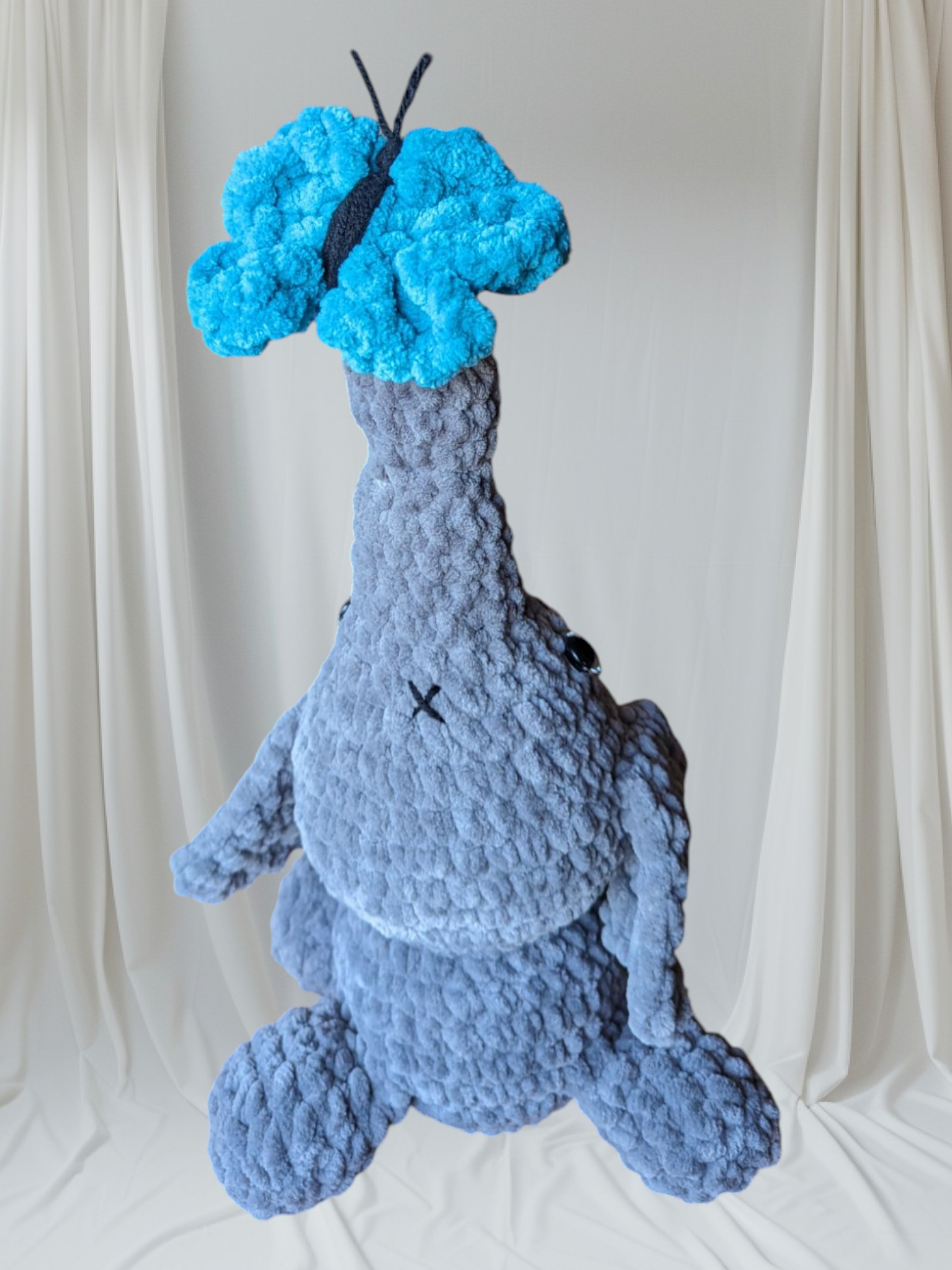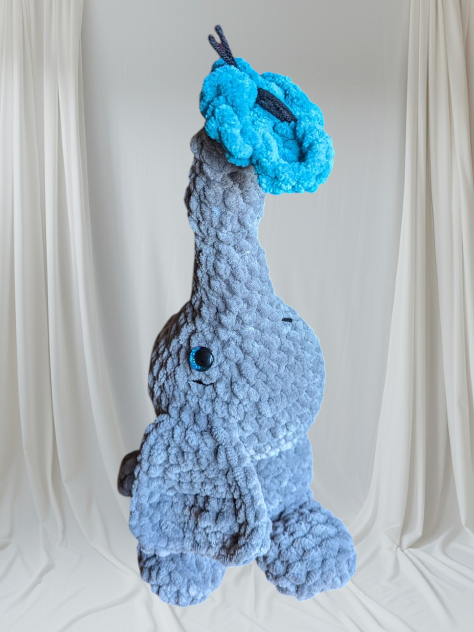 Adorable elephant with butterfly plush. Measures 16" tall. This plush features safety eyes, which are not recommended for children under the age of 3. Baby safe version can be made upon request.