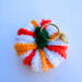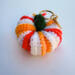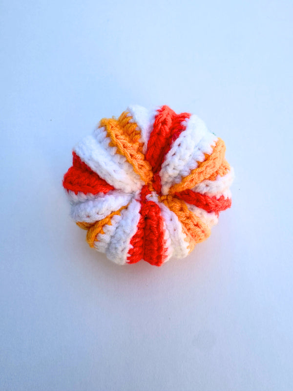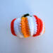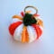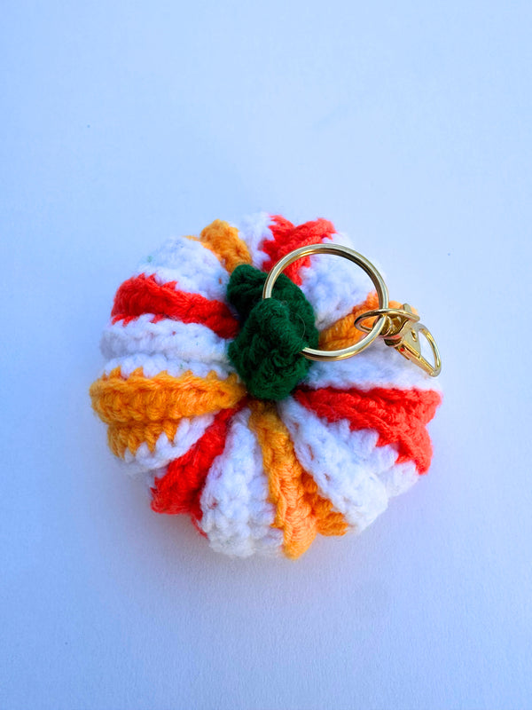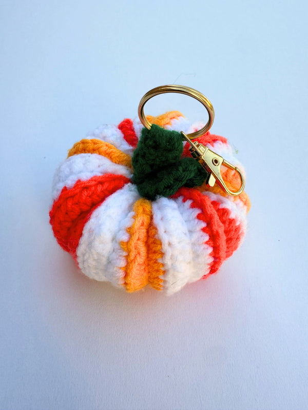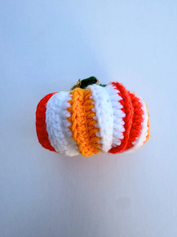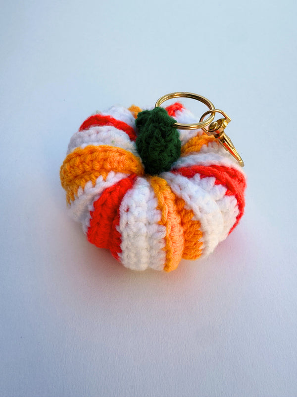 Add a playful pop of color to your bag, keys, or gift packaging with this handcrafted pumpkin-shaped crochet keychain. Designed in vibrant autumn-inspired stripes of vibrant orange tones and white , this adorable keychain is topped with a leafy green crochet stem and finished with a sturdy gold-tone keyring and clasp for easy attachment.