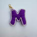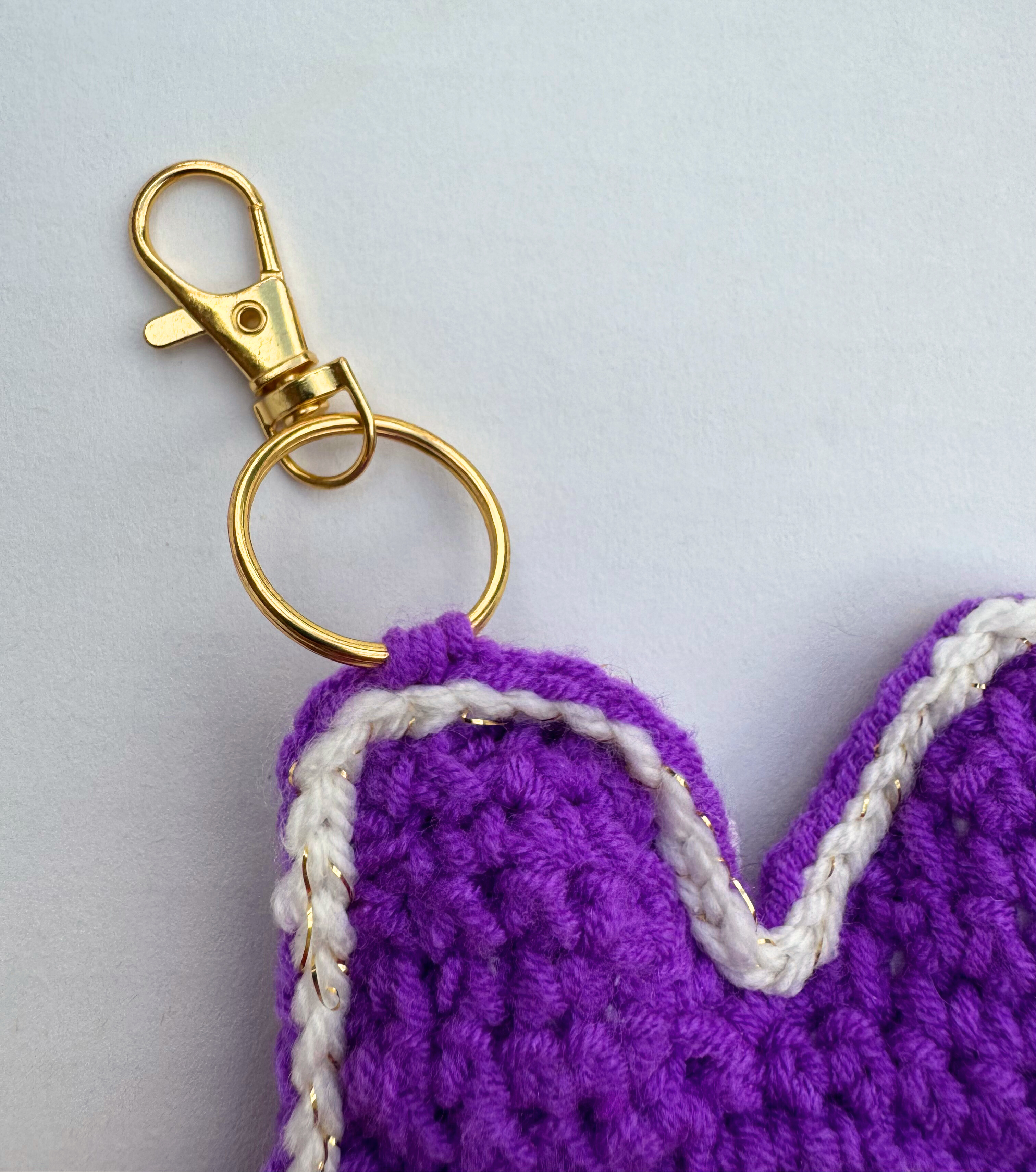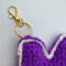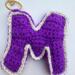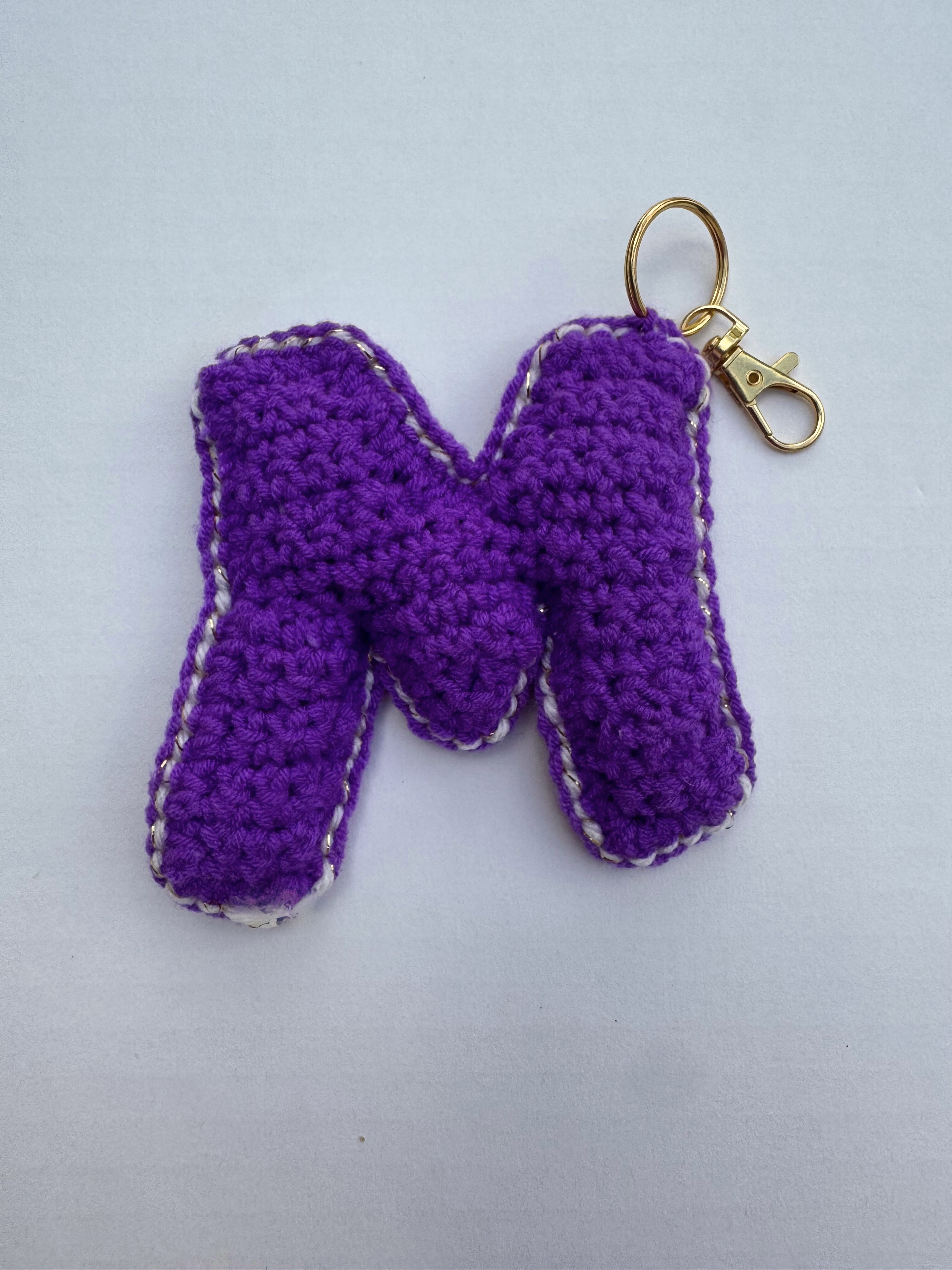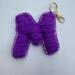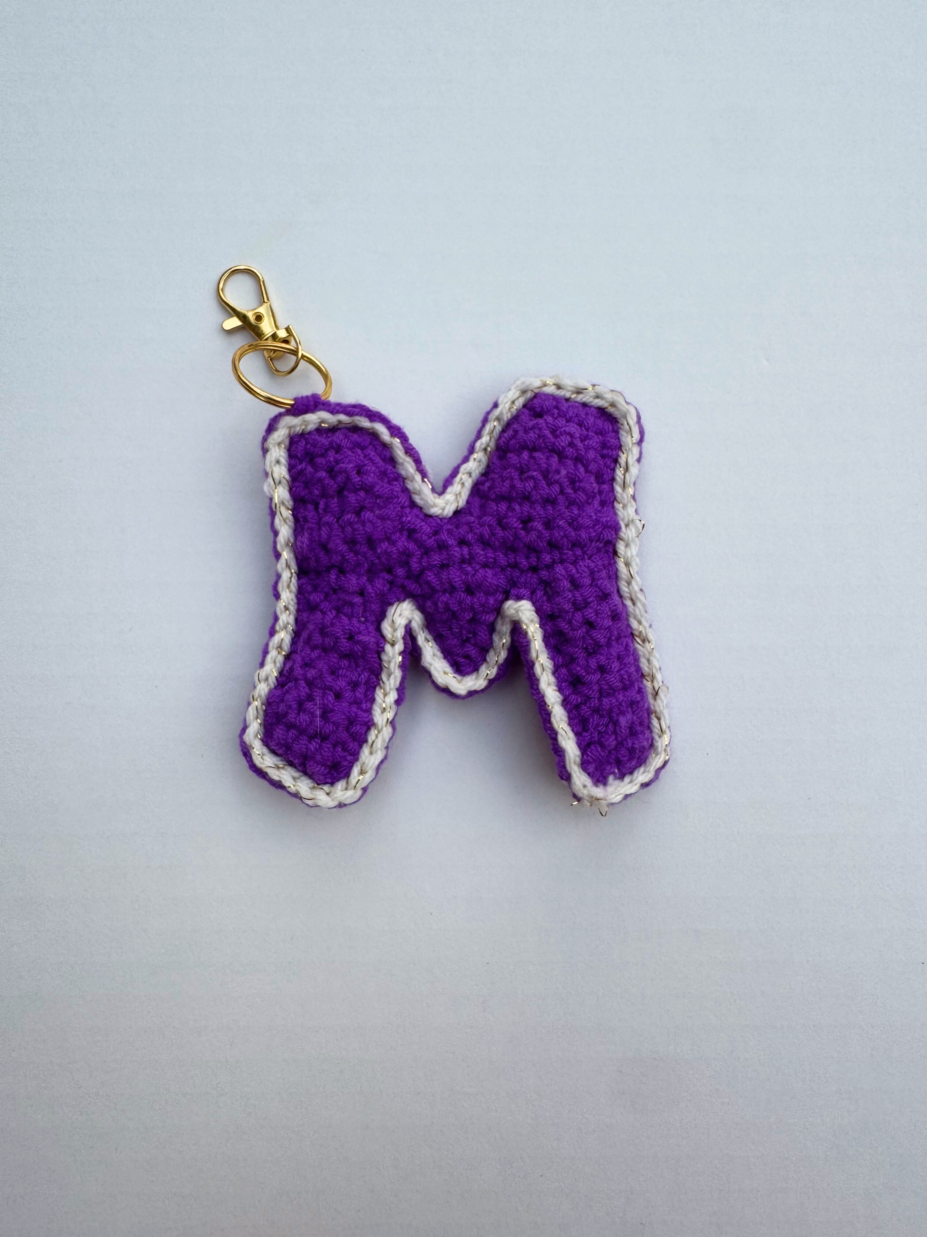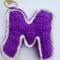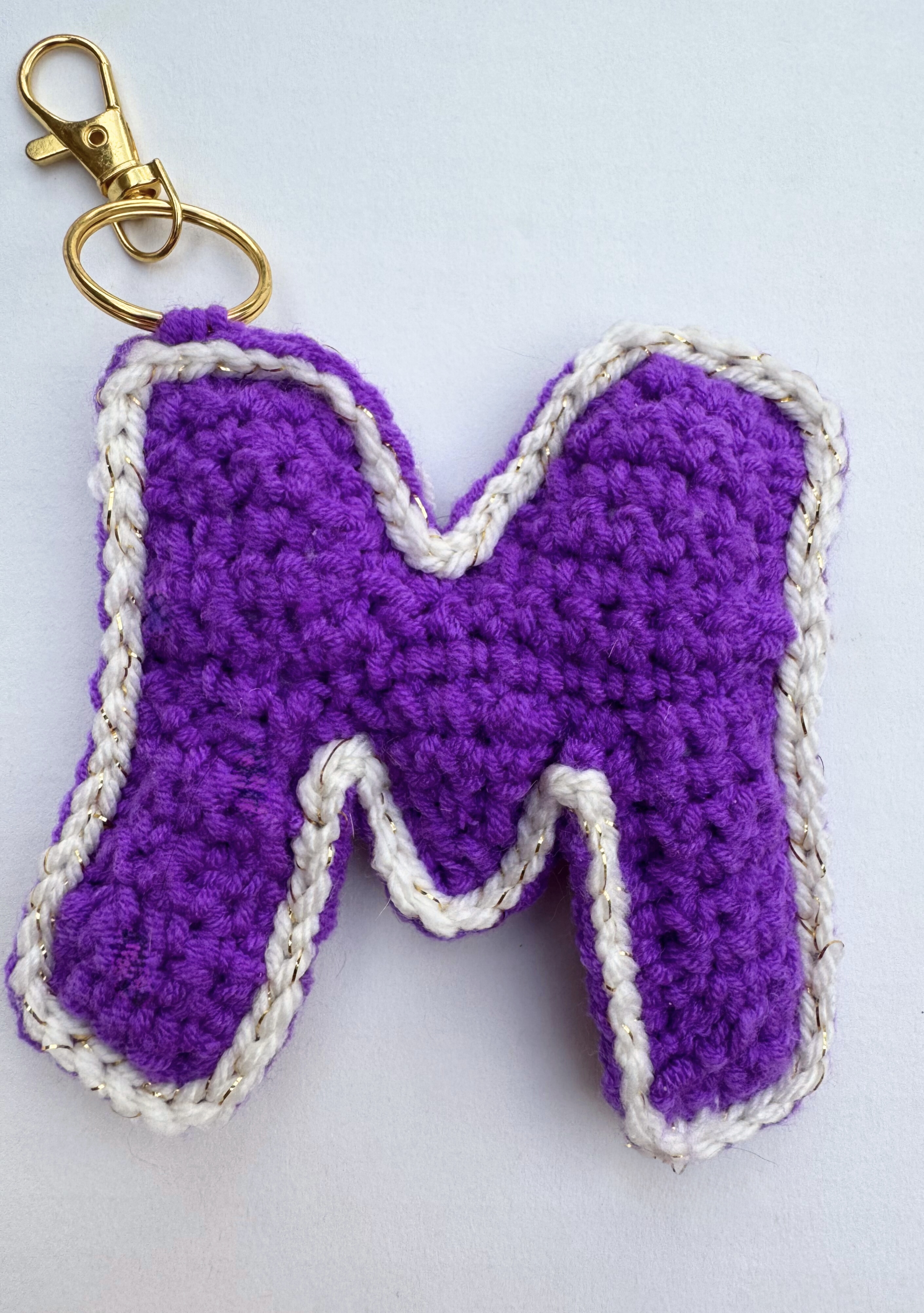 This keychain features the letter M in vibrant purple with a white border and decorated gold color, made with soft acrylic yarn and securely attached to a sturdy gold clasp.