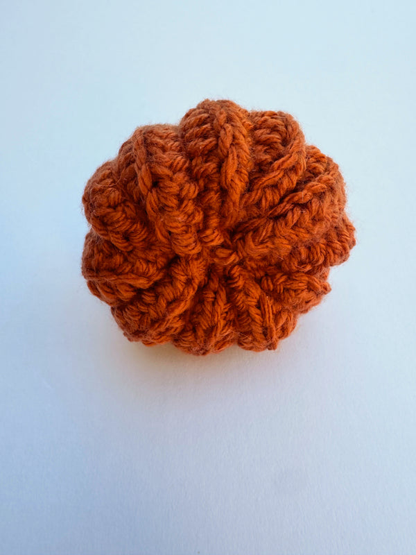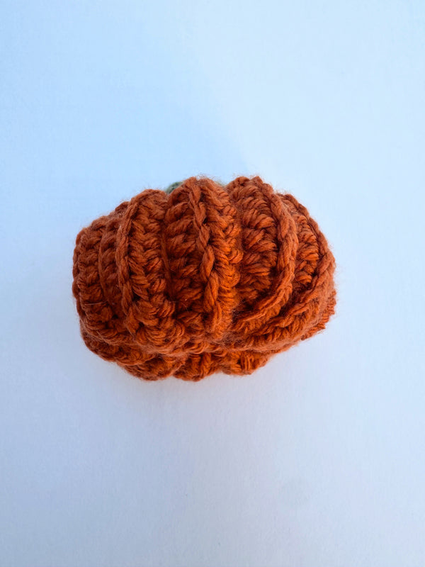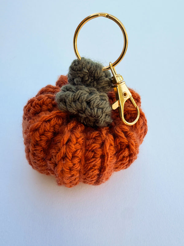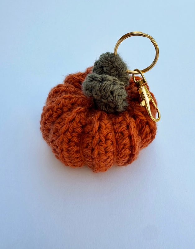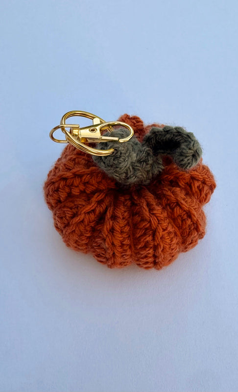 Add a touch of cozy autumn charm to your everyday accessories with this adorable handmade pumpkin keychain. Lovingly crocheted in warm , earthy tones, it features a classic ribbed pumpkin shape with a curly green leave and stem and a shiny gold-tone clasp for easy attachment to your keys, bag, or backpack.