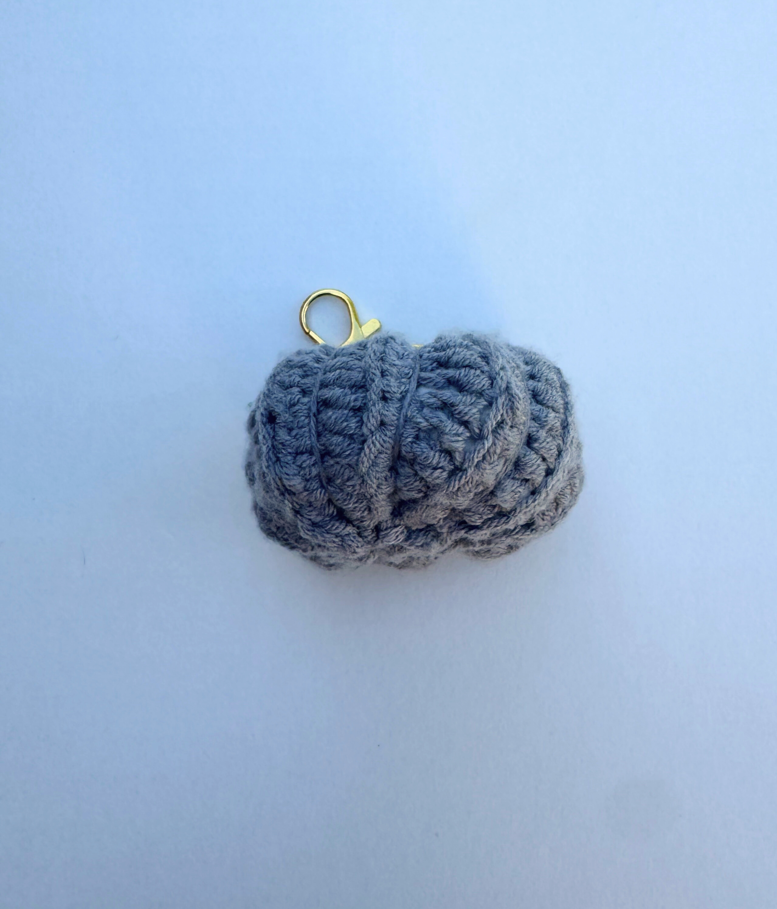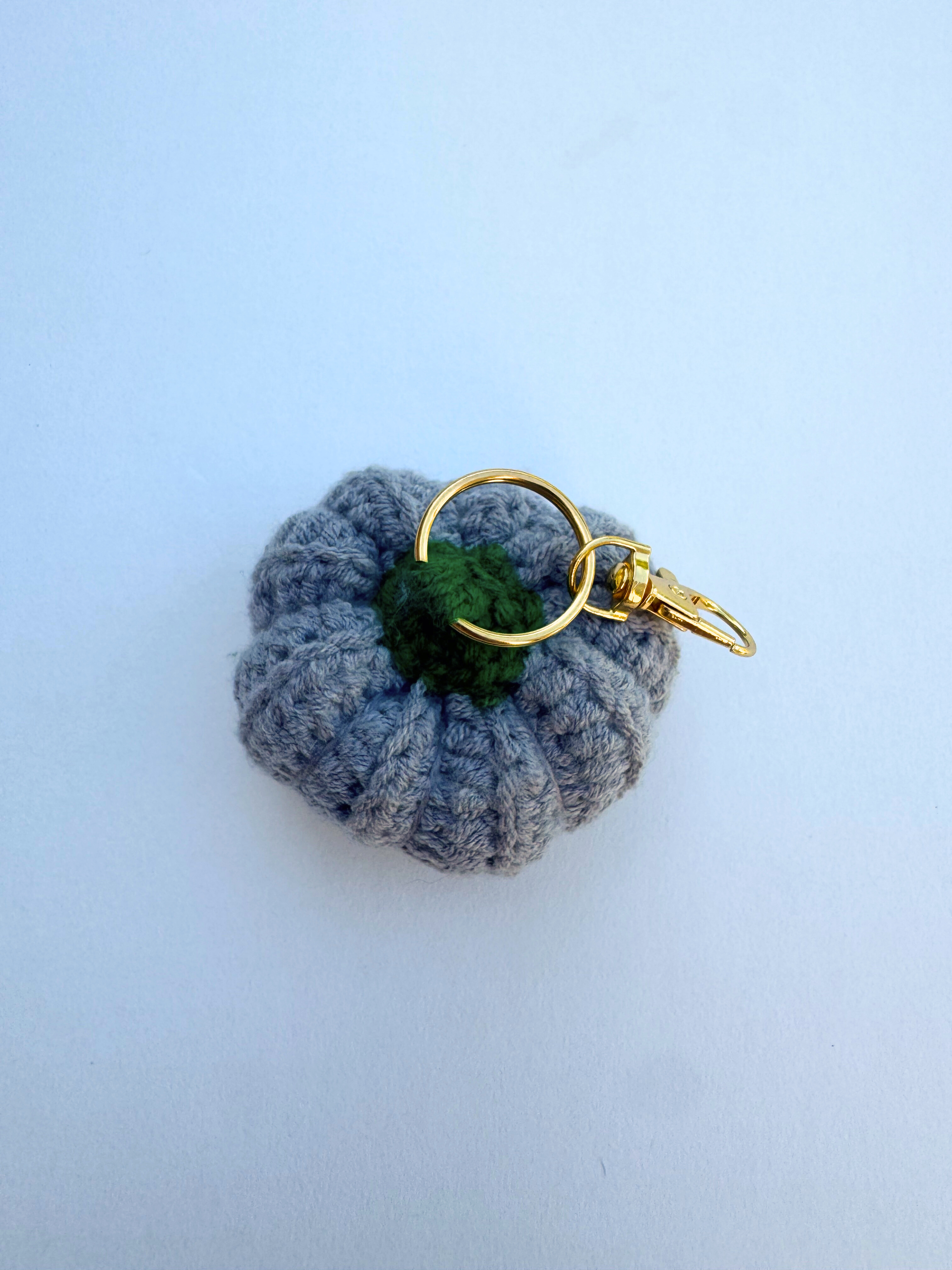 Add a touch of handmade charm to your everyday essentials with this cozy keychain. Crocheted with soft grey yarn and topped with a forest-green stem, this miniature pumpkin captures the warmth and coziness of autumn in a pocket-sized accessory. Finished with a sleek gold-tone keyring and clasp, it's perfect for securing your keys, decorating your bag, of gifting to a friend who loves unique, handmade treasures.