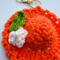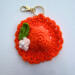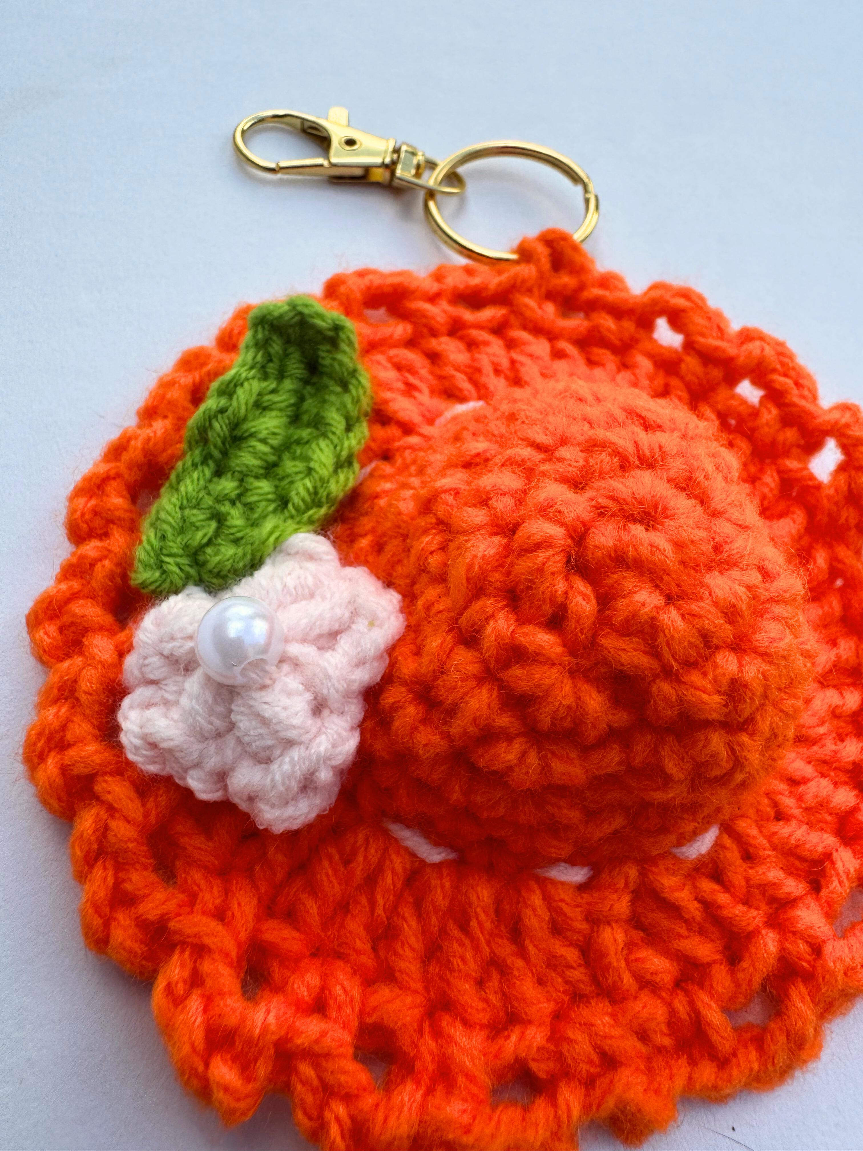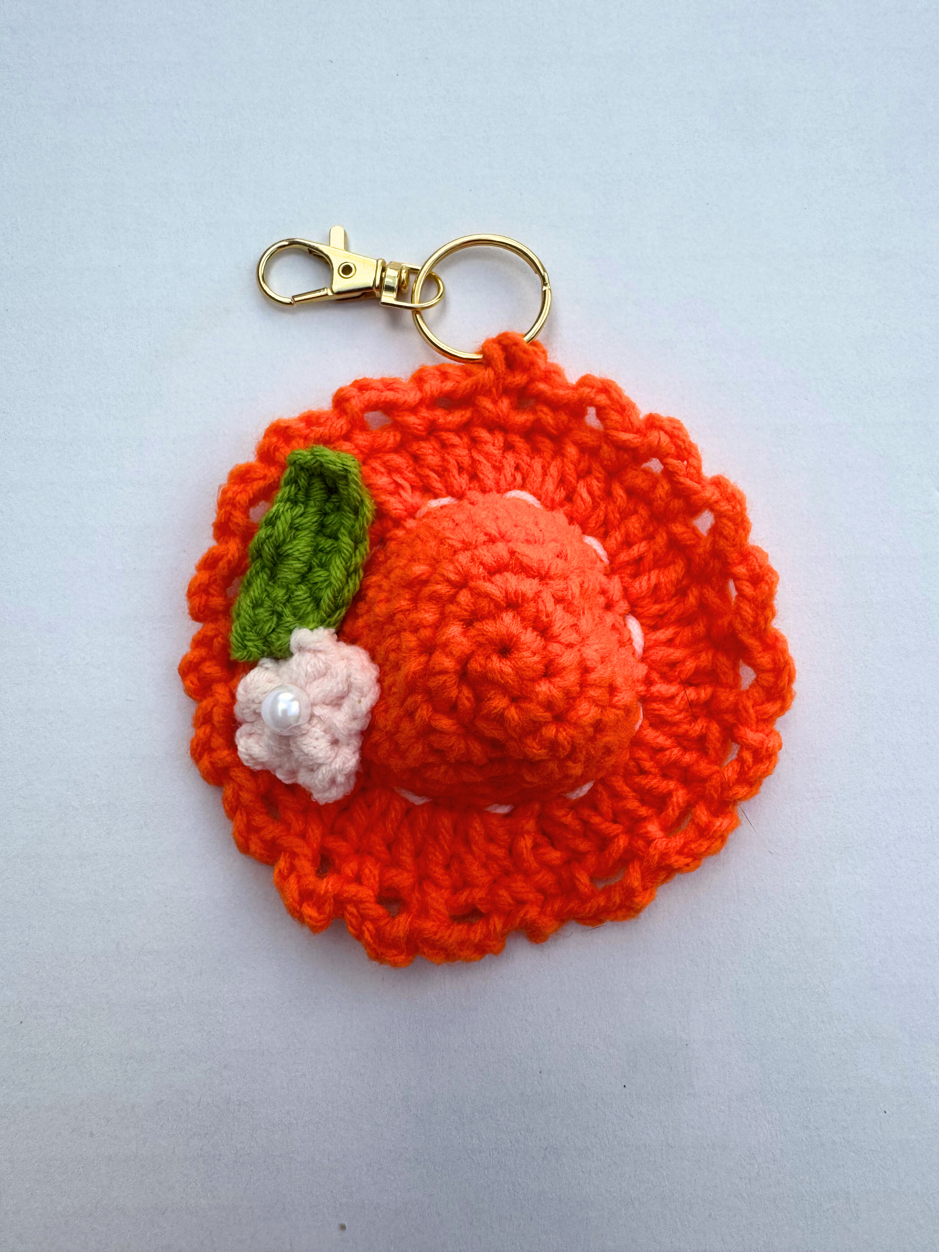 This cheerful keychain is crafted in bright orange yarn, accented with a soft pink crochet flower, green leaf, and a tiny pearl bead for extra charm.