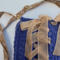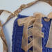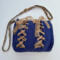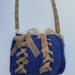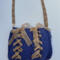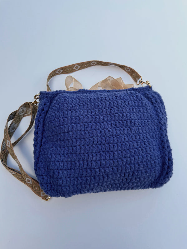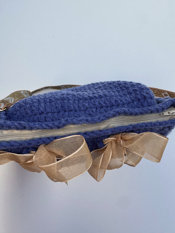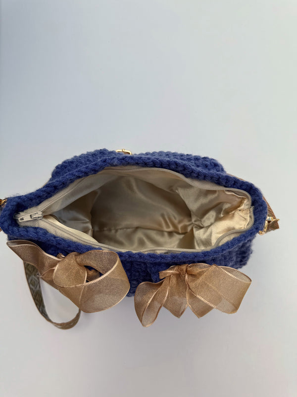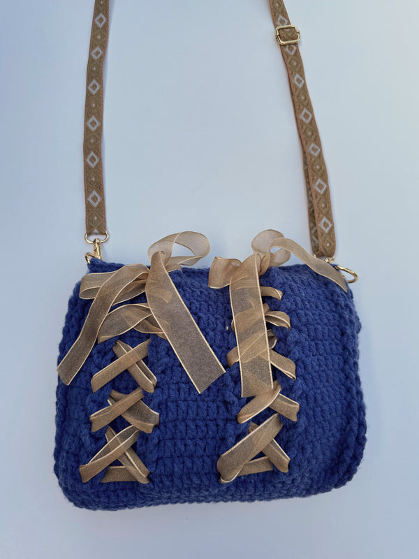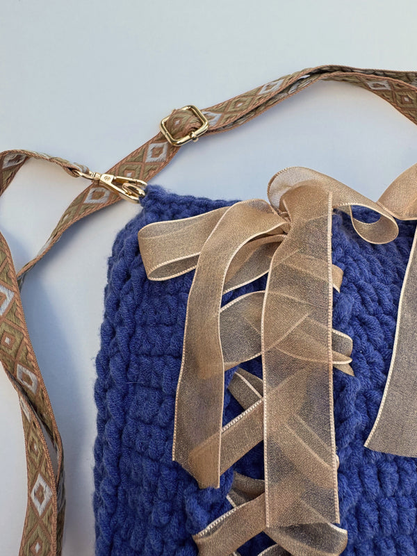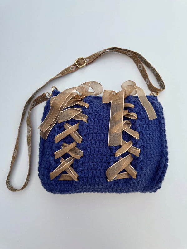 Add a charming twist to your accessory collection with this beautifully handcrafted crochet bag. Featuring a deep navy blue body and adorned with elegant champagne ribbon bows in a lace-up design, this piece brings together texture and style in a unique , eye-catching way.