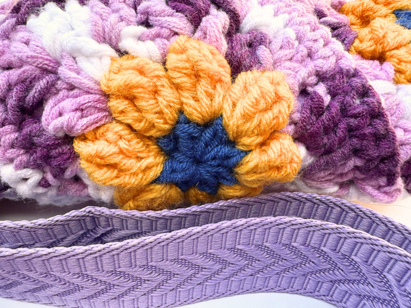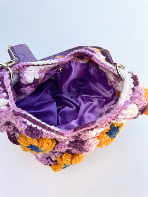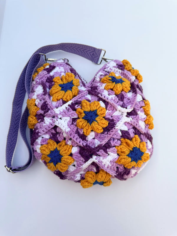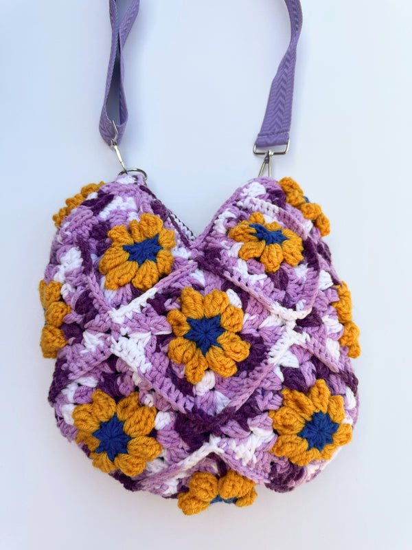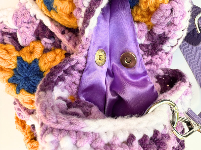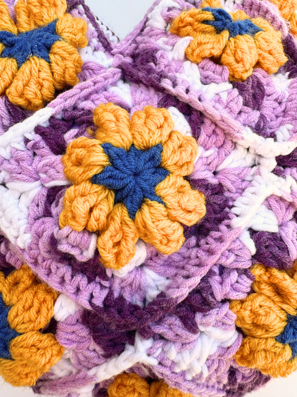 This eye-catching granny square tote bag is a perfect blend of vintage charm and modern function . Handcrafted with bold floral crochet squares in vibrant shades of purple , mustard, white and navy, it features a soft tote style that makes it both roomy and stylish .