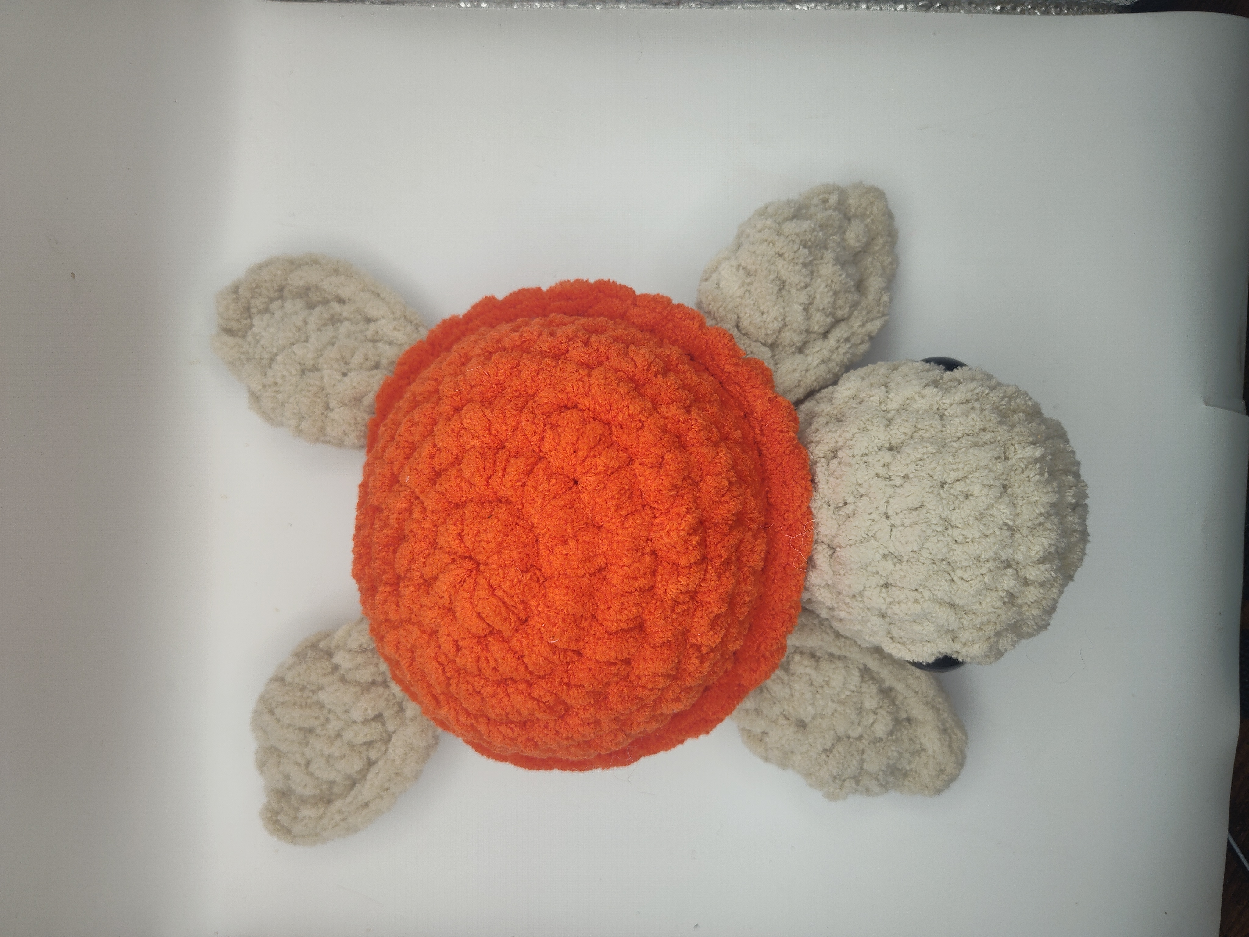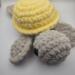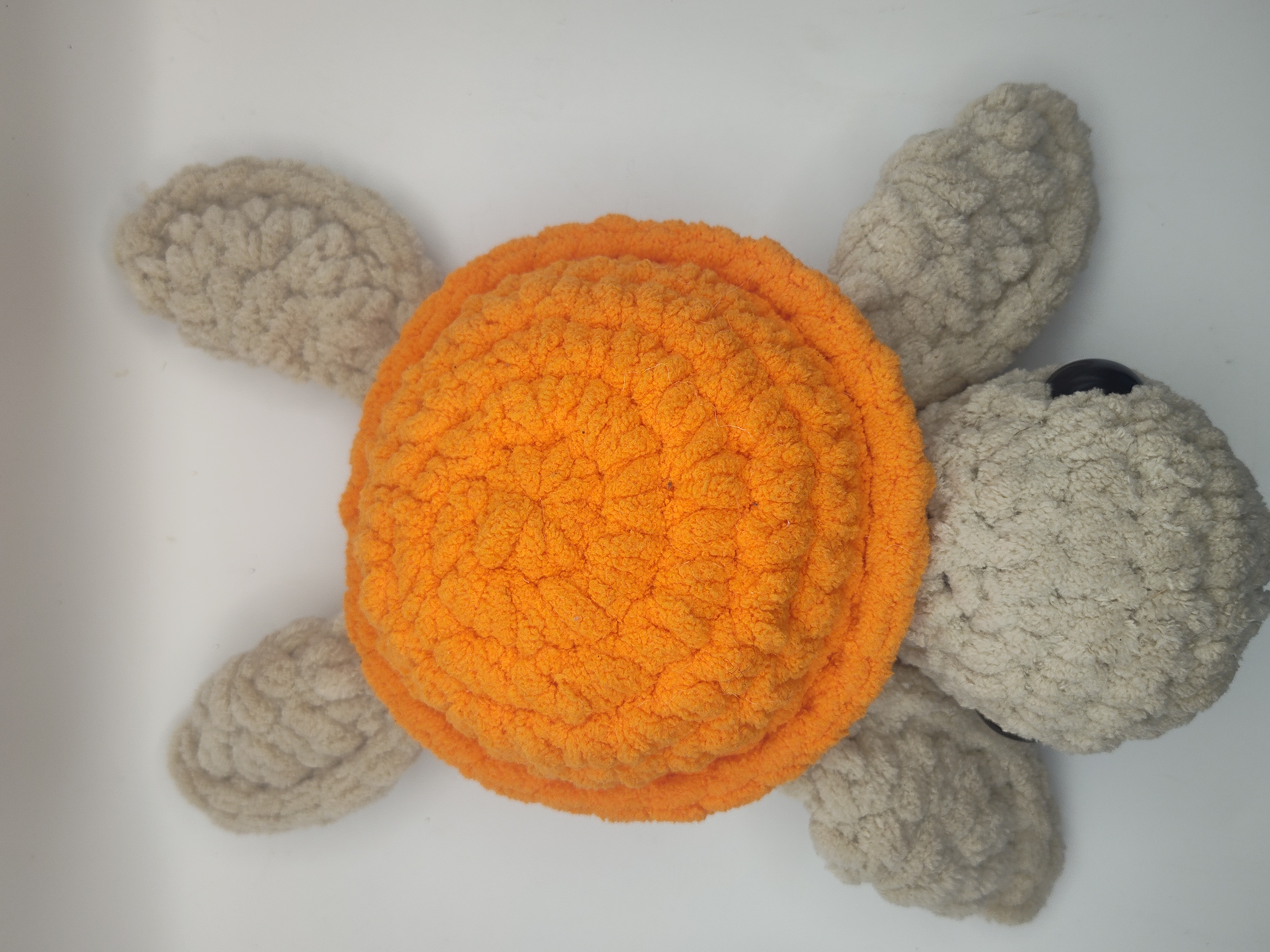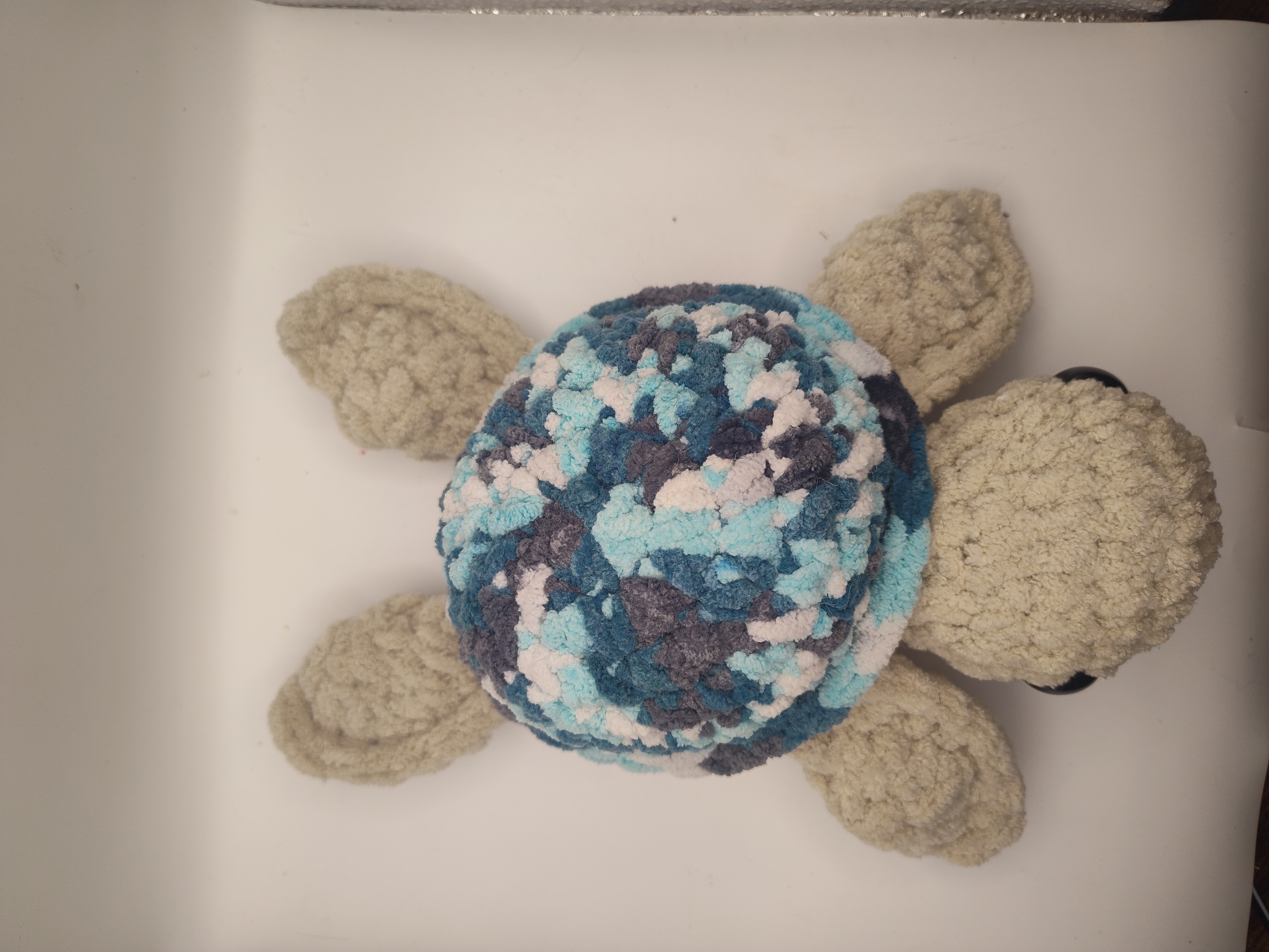 This crochet turtle is handmade with Bernet blanket yarn. The turtle is 12 " long from the head to the bottom of the fin.