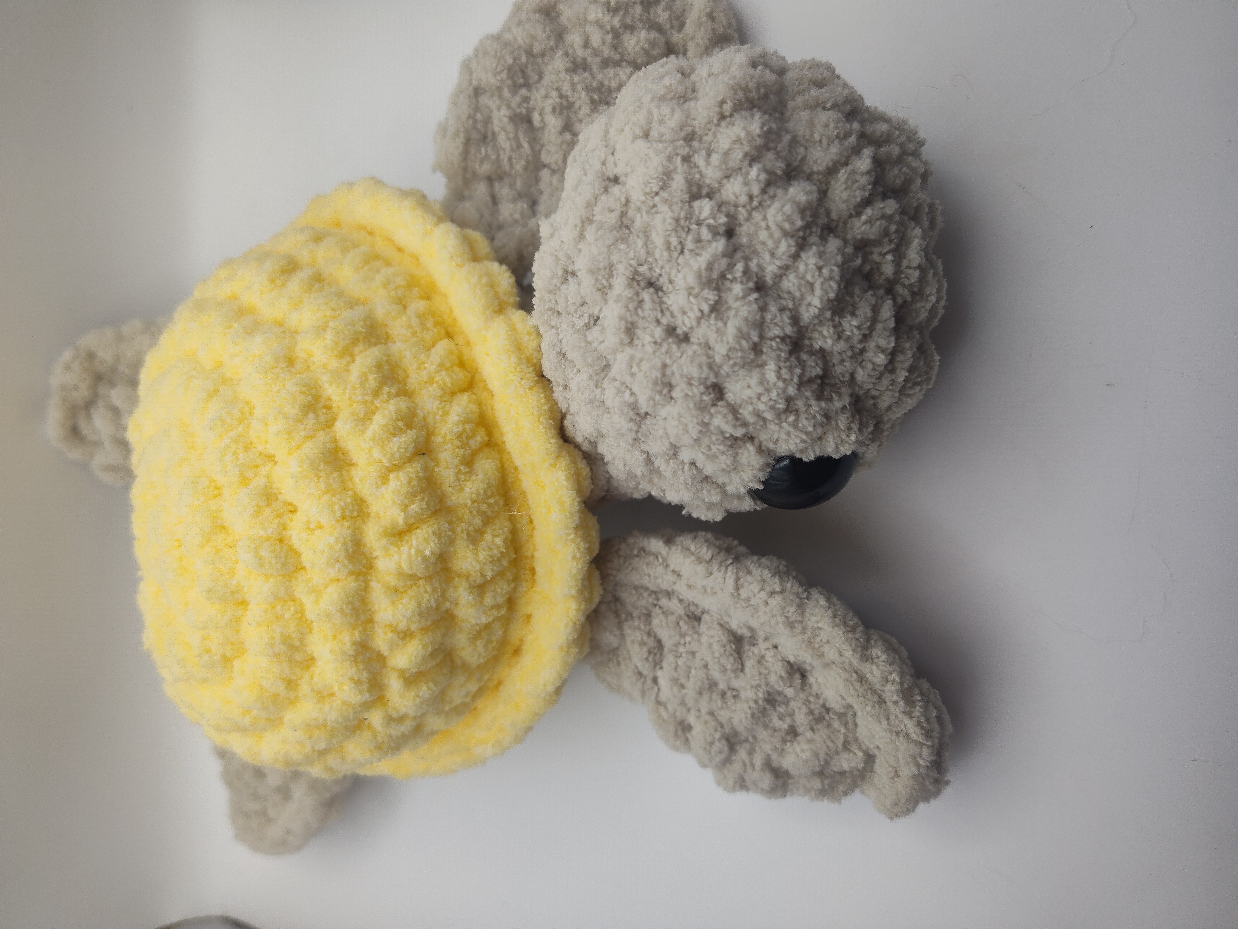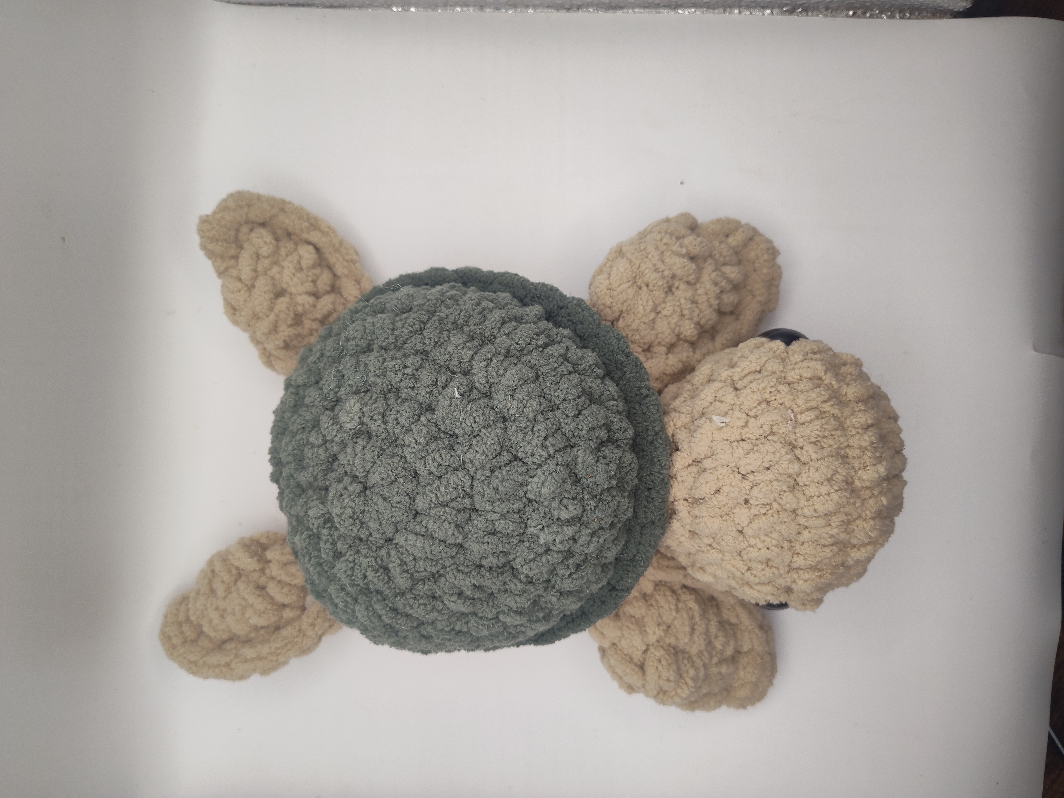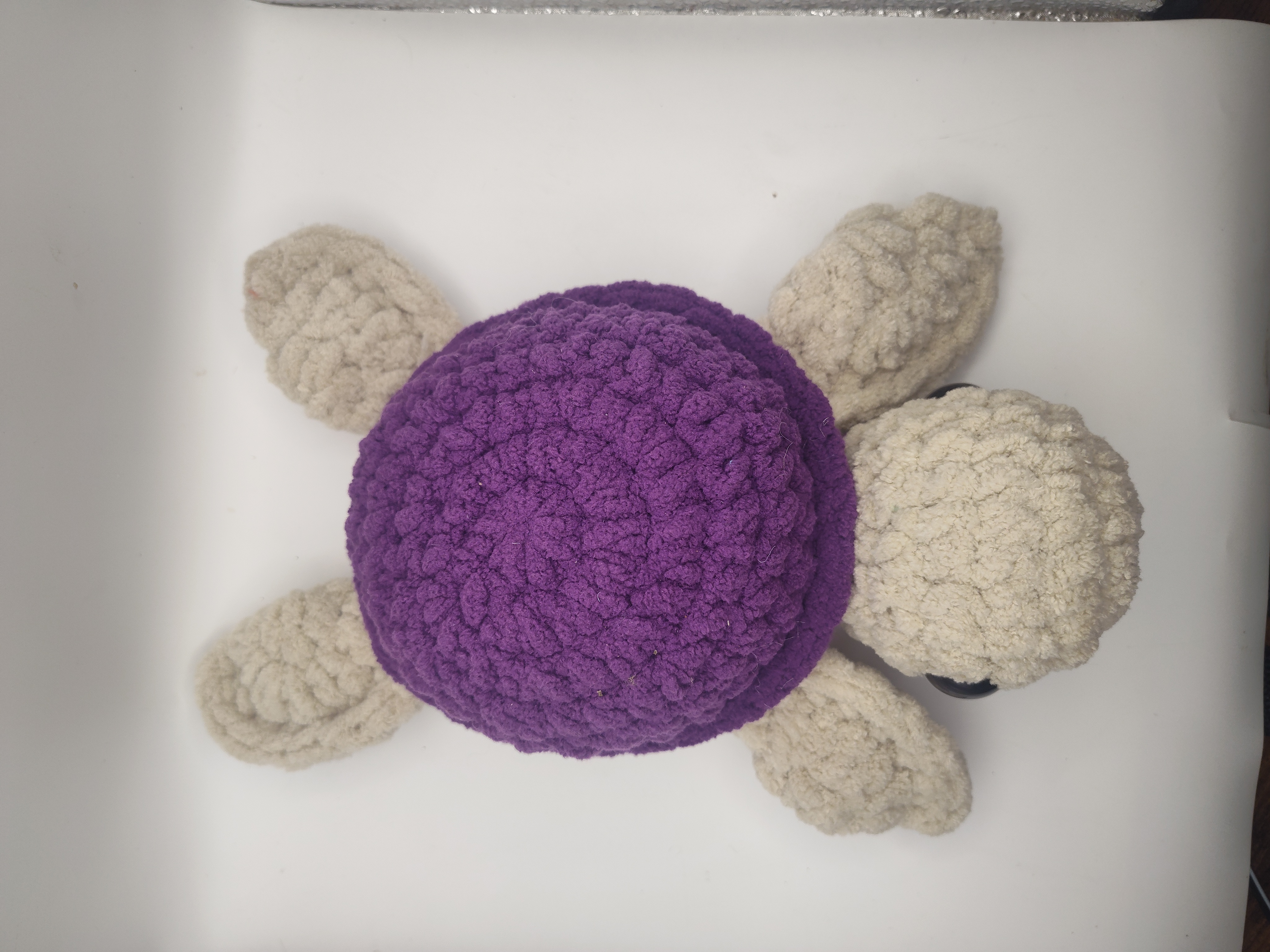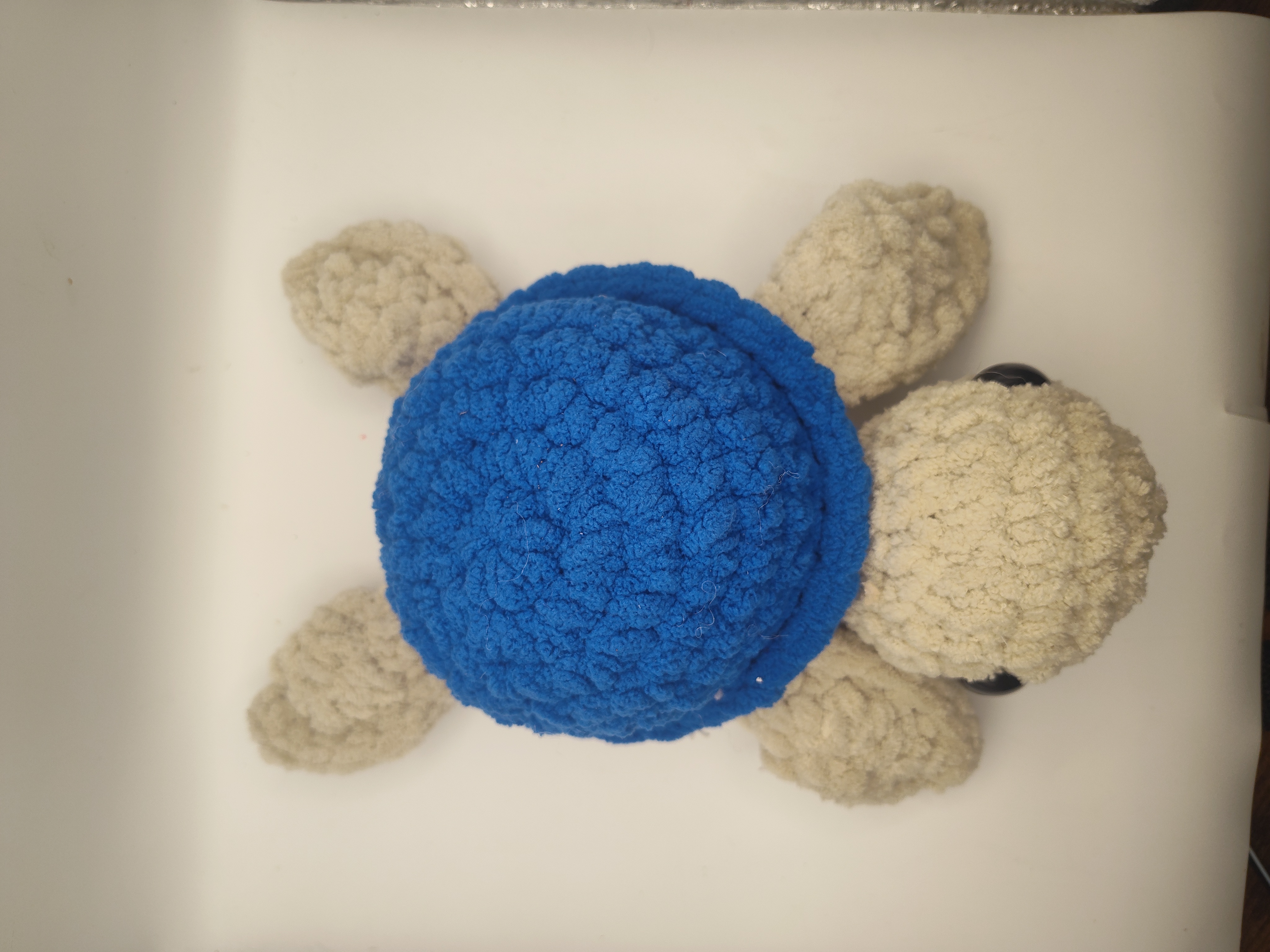 This crochet turtle is handmade with Bernet blanket yarn. The turtle is 12 " long from the head to the bottom of the fin.