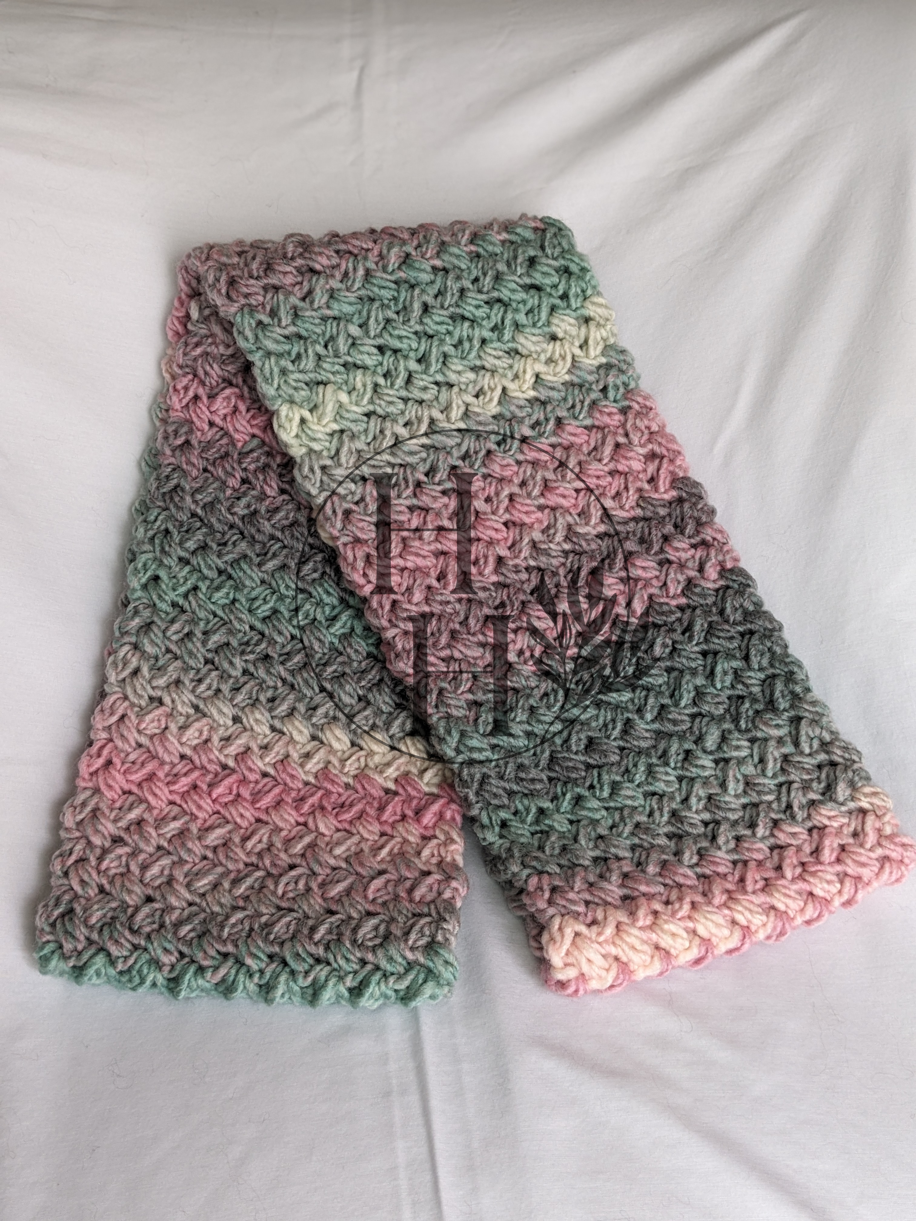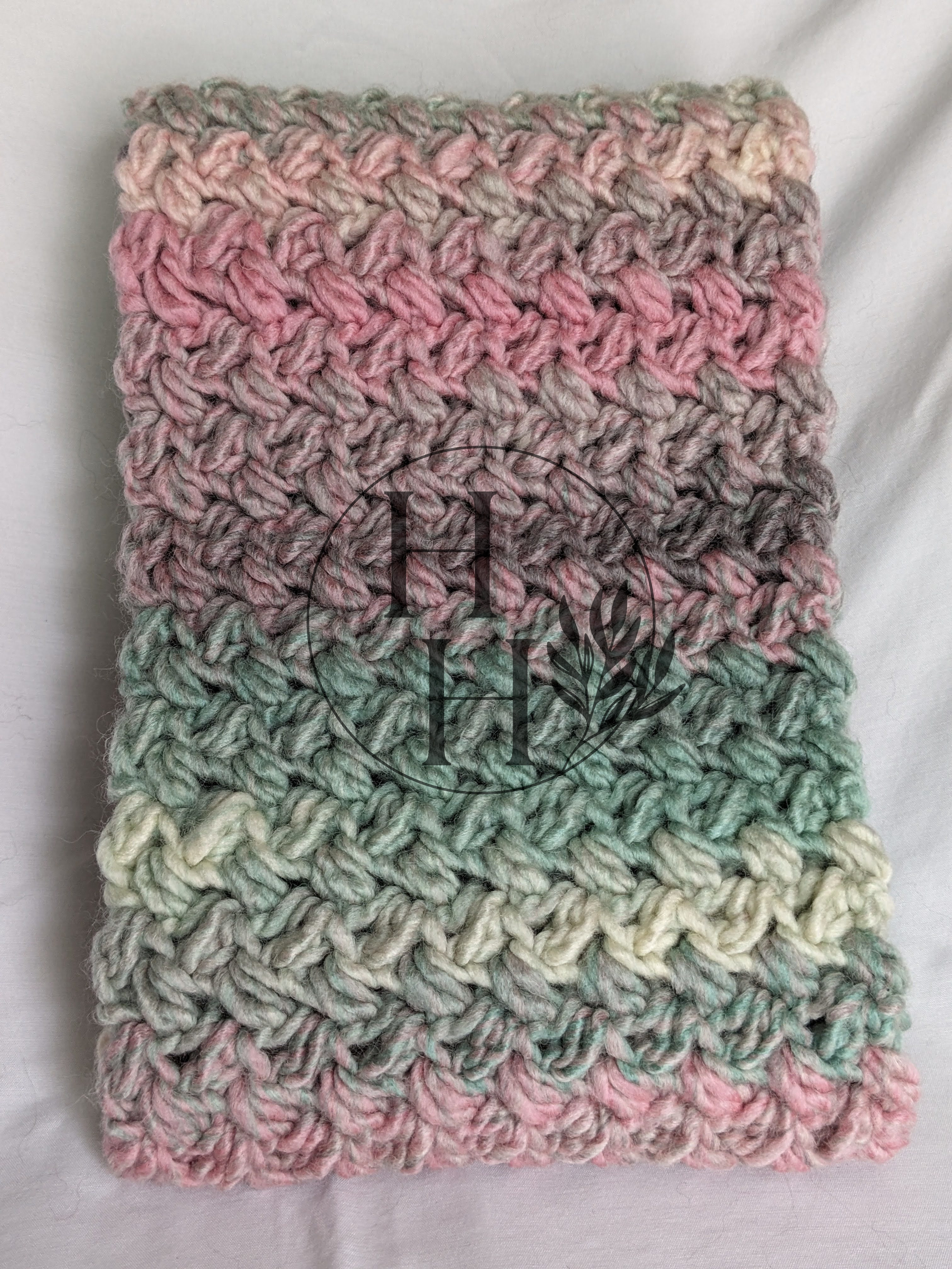 Crochet infinity loop style scarf using a soft wool/acrylic blend. 7" wide, 27" long.