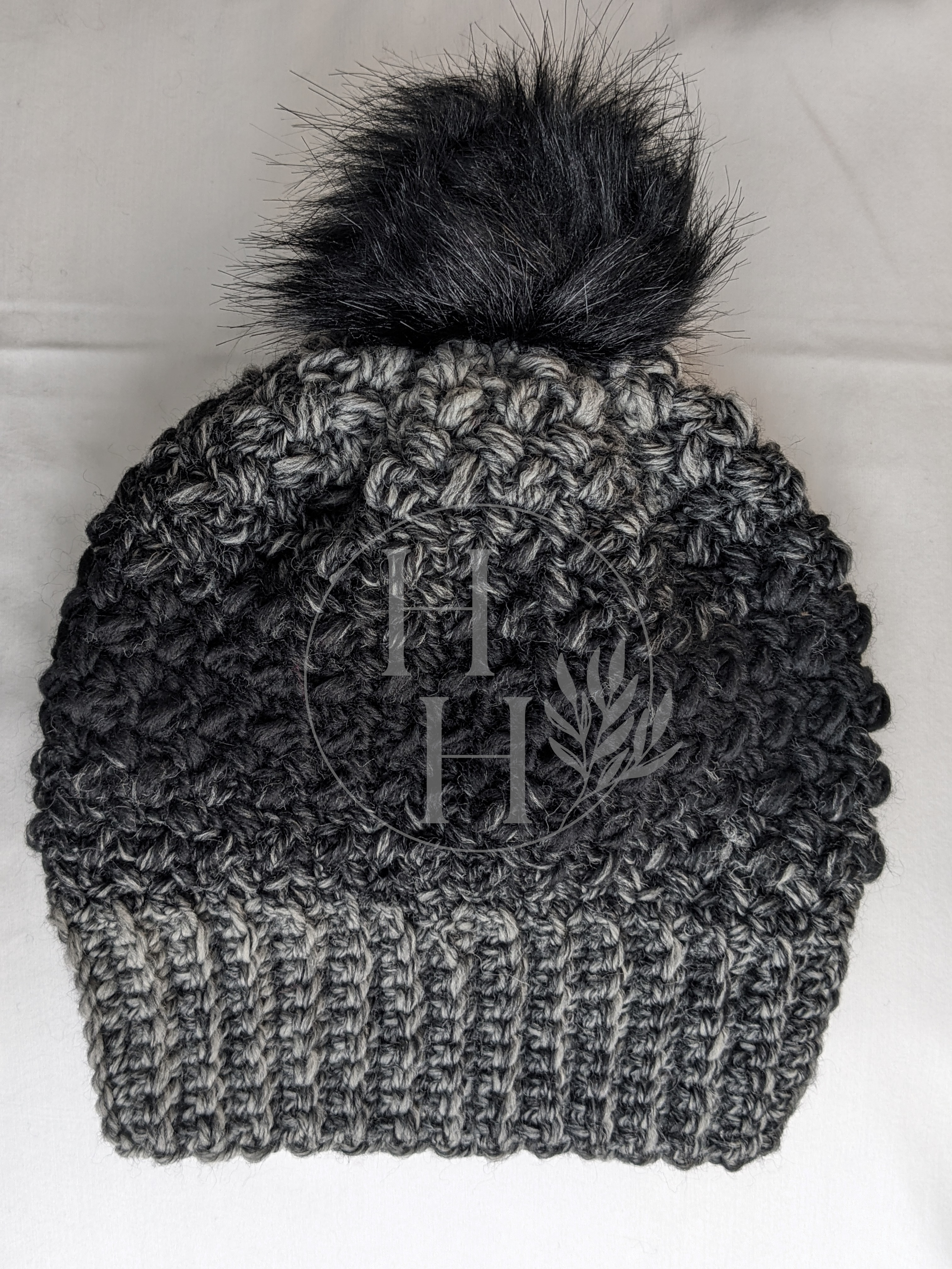 Crochet hat made with a soft wool/acrylic blend yarn and removable faux fur pom. Fits heads up to 24" and has 1-2" of stretch.