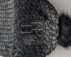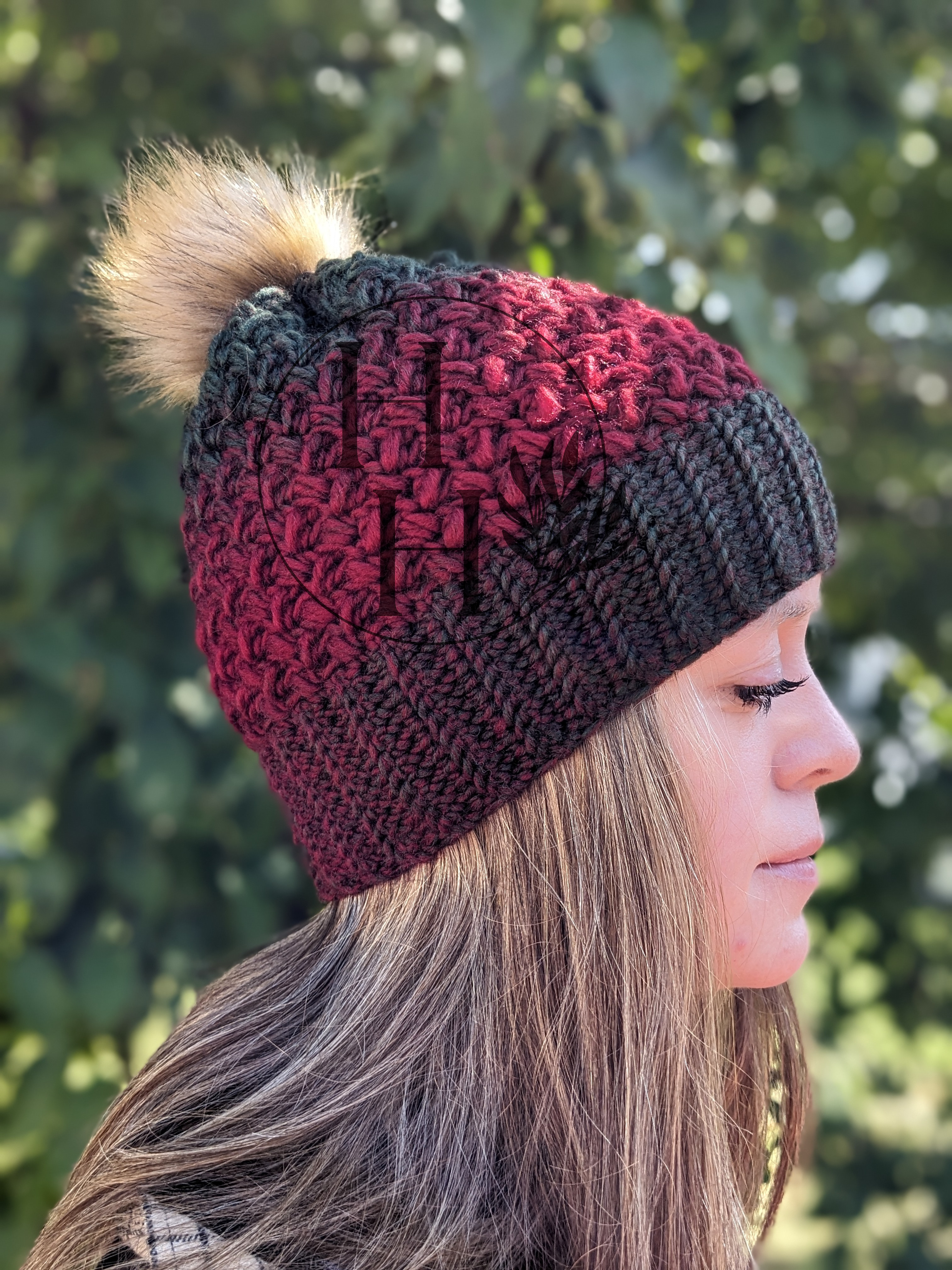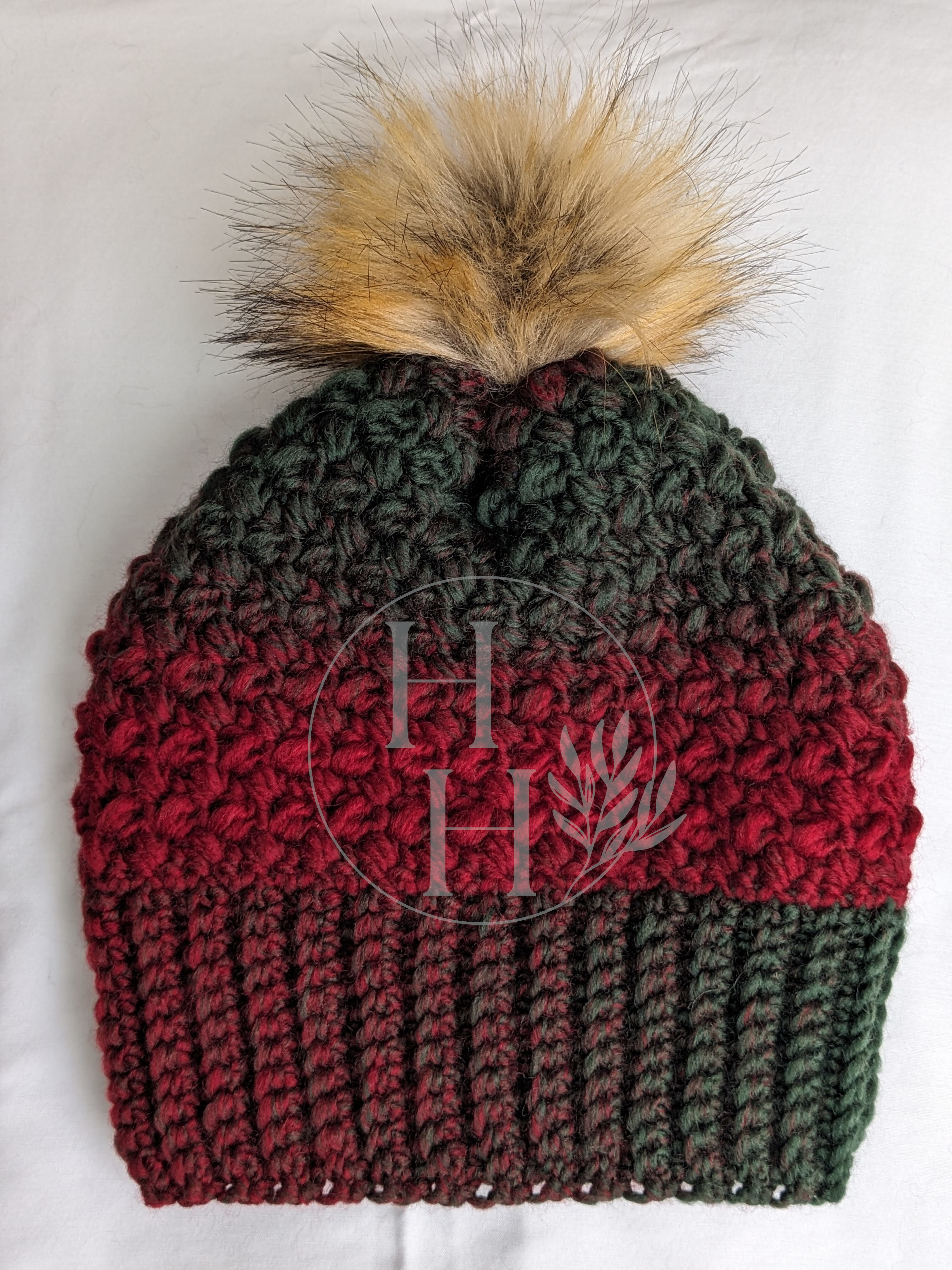 Crochet hat made with a soft wool/acrylic blend yarn and removable faux fur pom. Fits heads up to 24" and has 1-2" of stretch.