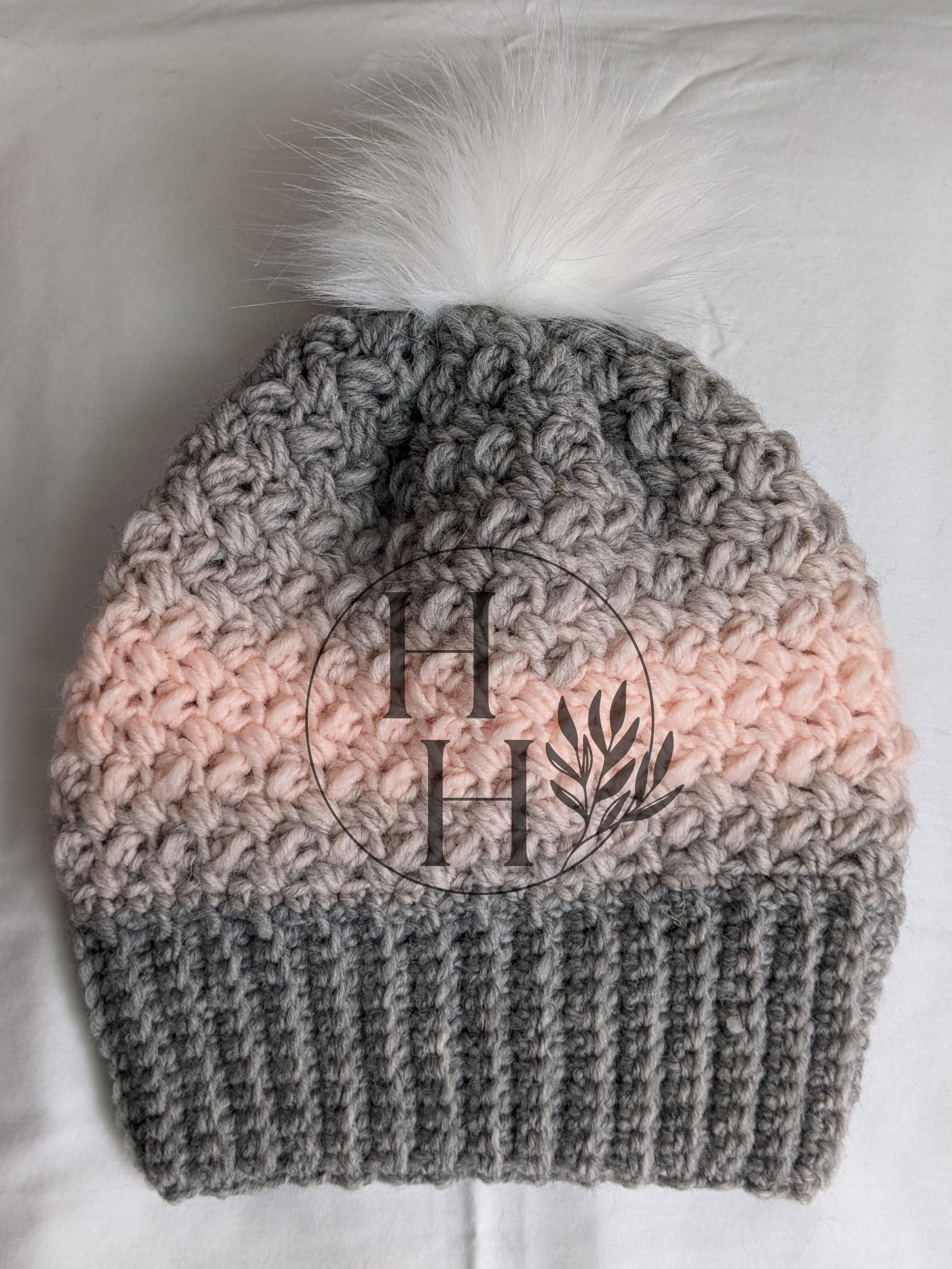 Crochet hat made with a soft wool/acrylic blend yarn and removable faux fur pom. Fits heads up to 24" and has 1-2" of stretch.