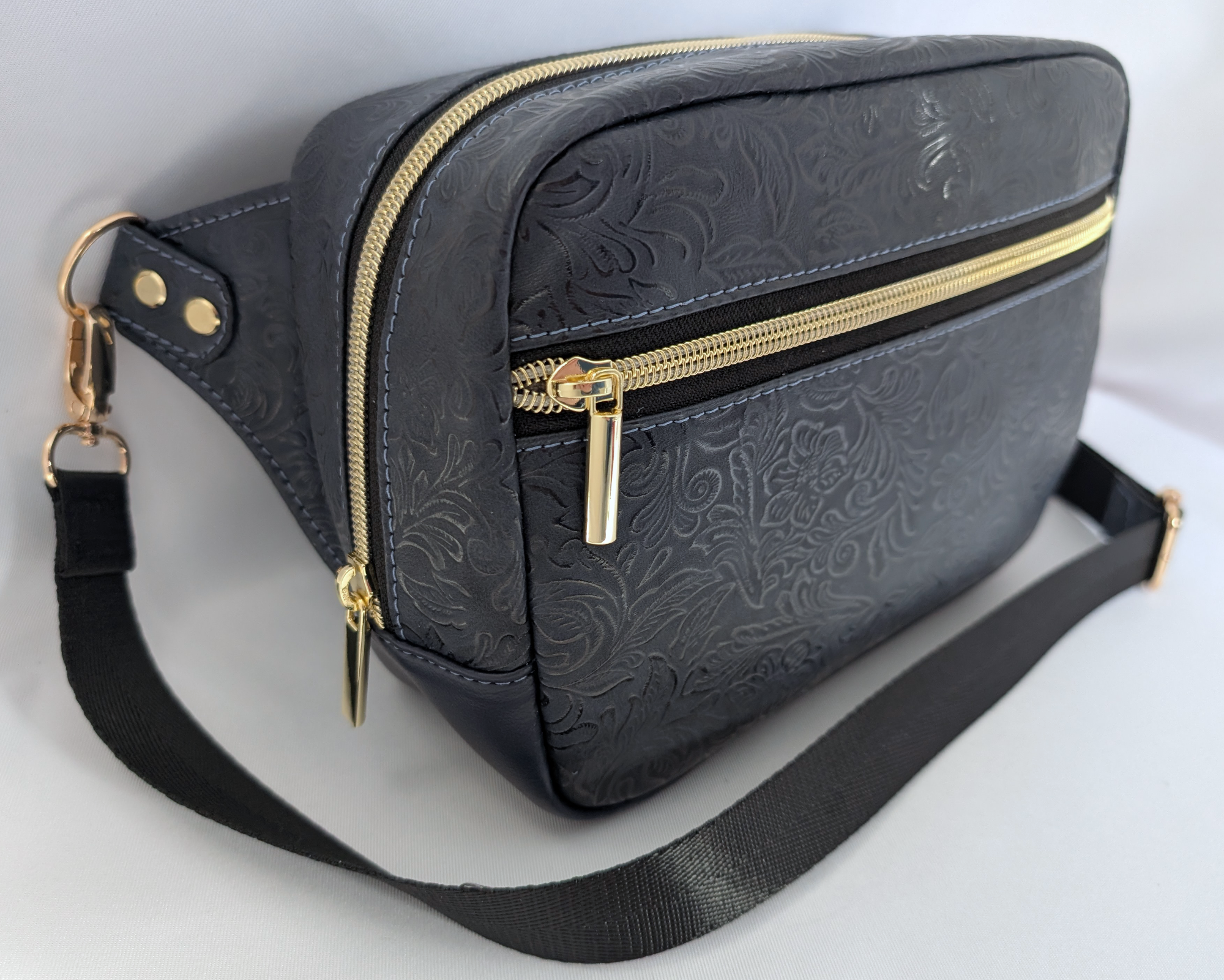 The Rayna is a lightweight crossbody or waist bag perfect for carrying your essentials and leaving your hands free. I made this one from dark blue embossed floral vinyl with gold colored hardware. The front zip pocket is large enough for your phone and inside is a roomy slip pocket. It measures 8.75" wide x 6" high x 3.25" deep. The nylon strap is adjustable from 24" to 43.5". Fully lined with polyester ripstop.
