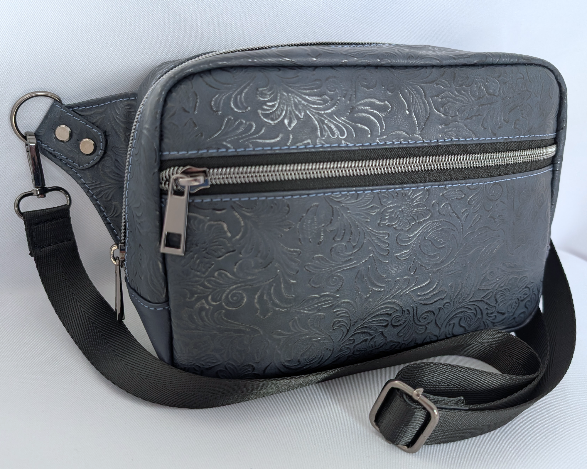 The Rayna is a lightweight crossbody or waist bag perfect for carrying your essentials and leaving your hands free. I made this one from dark blue embossed floral vinyl with gun metal colored hardware. The front zip pocket is large enough for your phone and inside is a roomy slip pocket. It measures 8.75" wide x 6" high x 3.25" deep. The nylon strap is adjustable from 24" to 43.5". Fully lined with polyester ripstop.