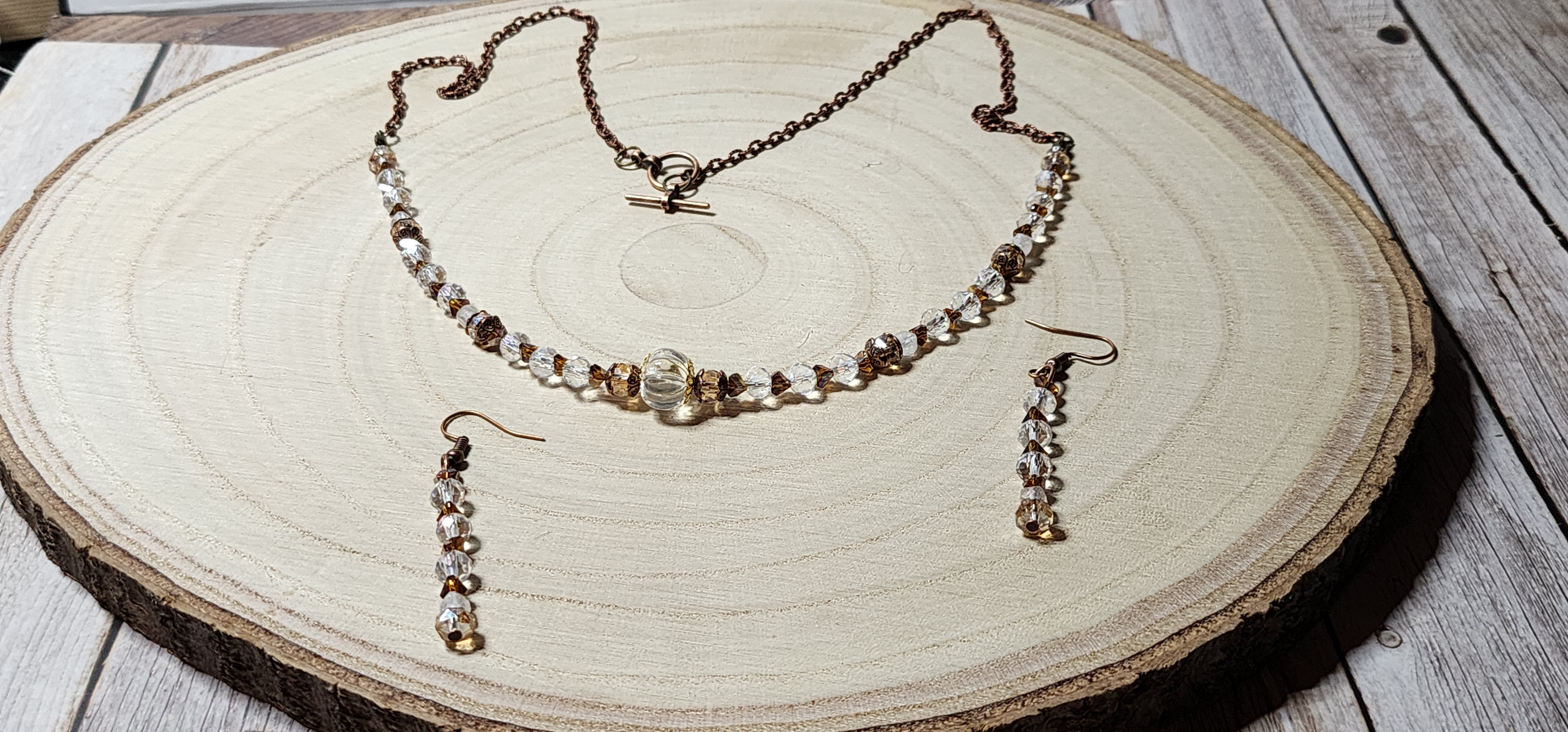 Give the gift of warmth and sparkle with this handcrafted crystal and amber Czech glass jewelry set. This elegant necklace and matching earrings pair shimmering clear beads with rich copper accents, creating a timeless design perfect for gatherings, winter celebrations, or heartfelt gift-giving.