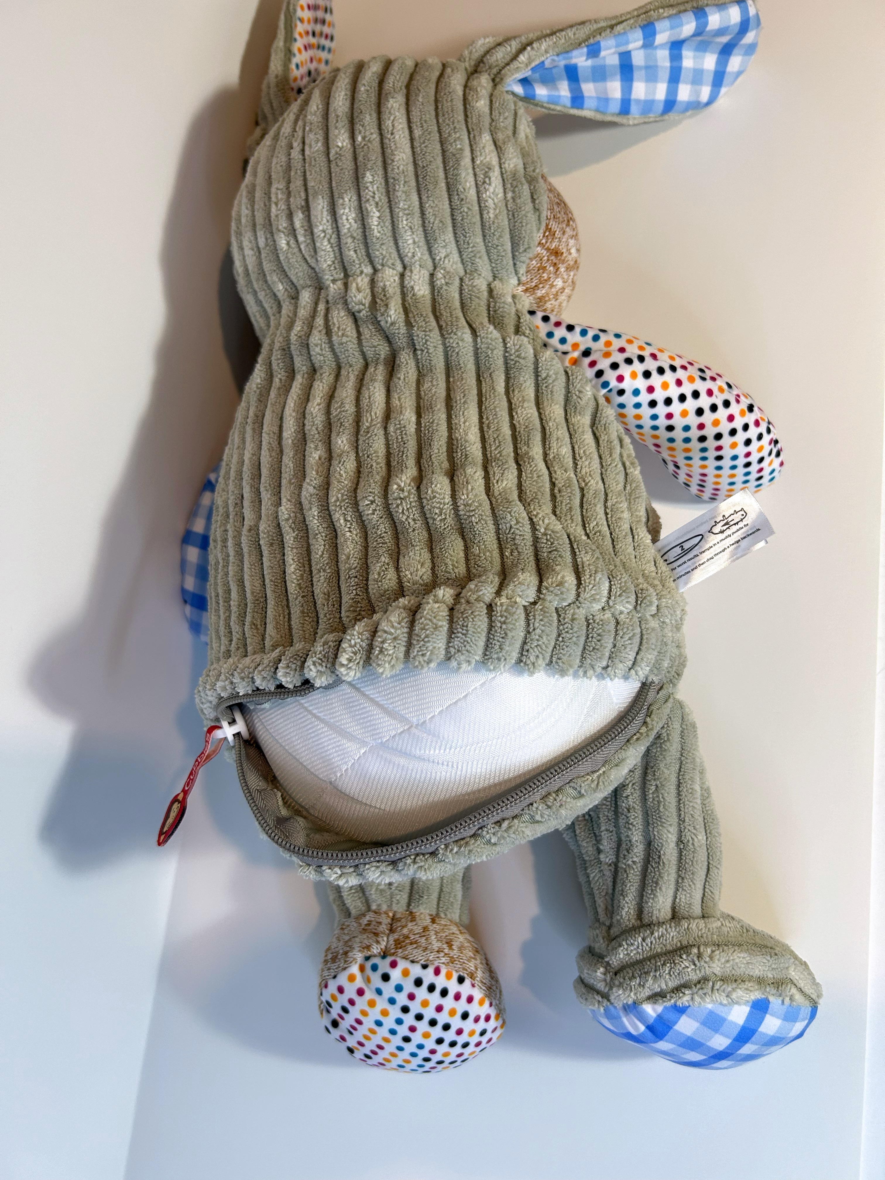 To ensure the longevity of all Original Cubbies® toys, they are designed with a zip that can be used to remove each toy stuffing pod and place the teddy in the wash. This means that no matter how often this soft toy is washed, it will not become misshapen over time.