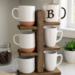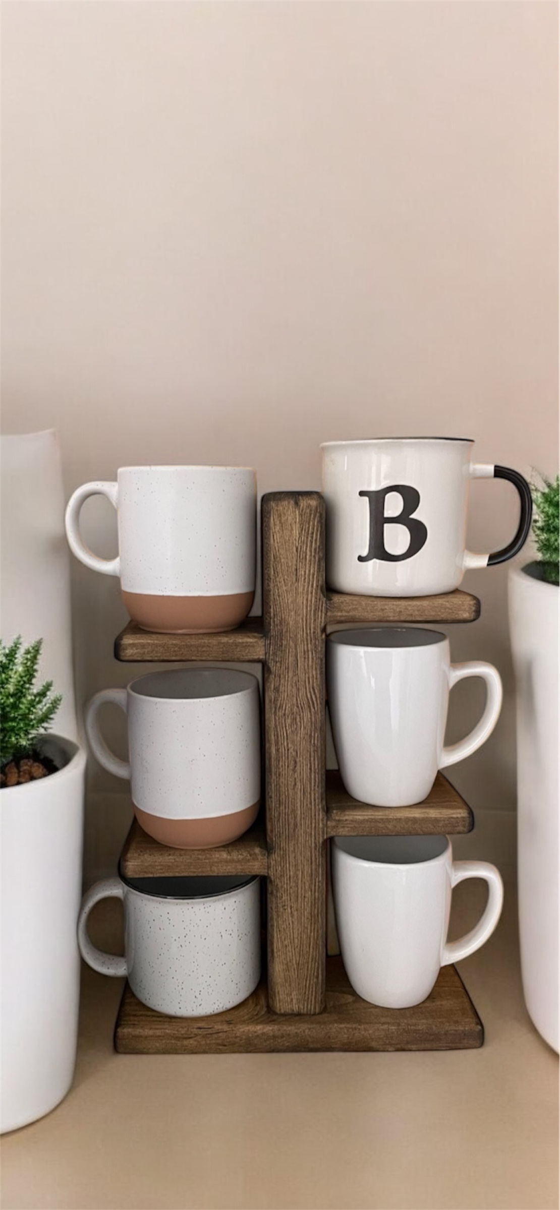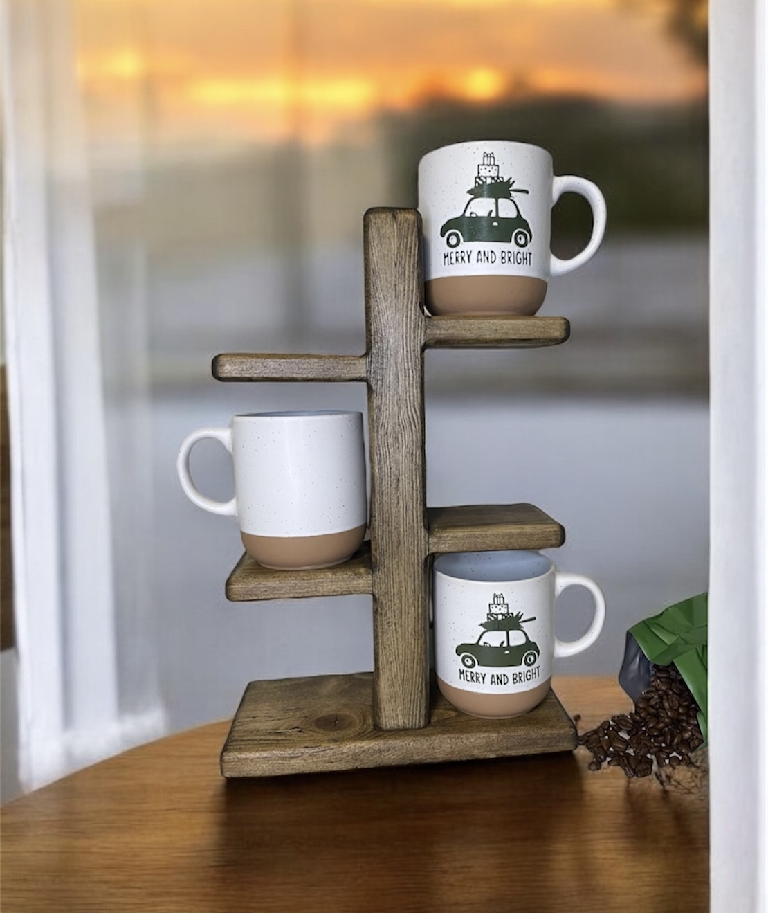 Coffee Mug Holder Stand Handcrafted wooden cup holder.Display your mugs in style with our wooden coffee cup holder. Crafted from pine wood, this tiered stand allows you to showcase your favorite cups while keeping them organized and easily accessible. Perfect for home or office use, elevate your coffee routine with this elegant display shelf.
