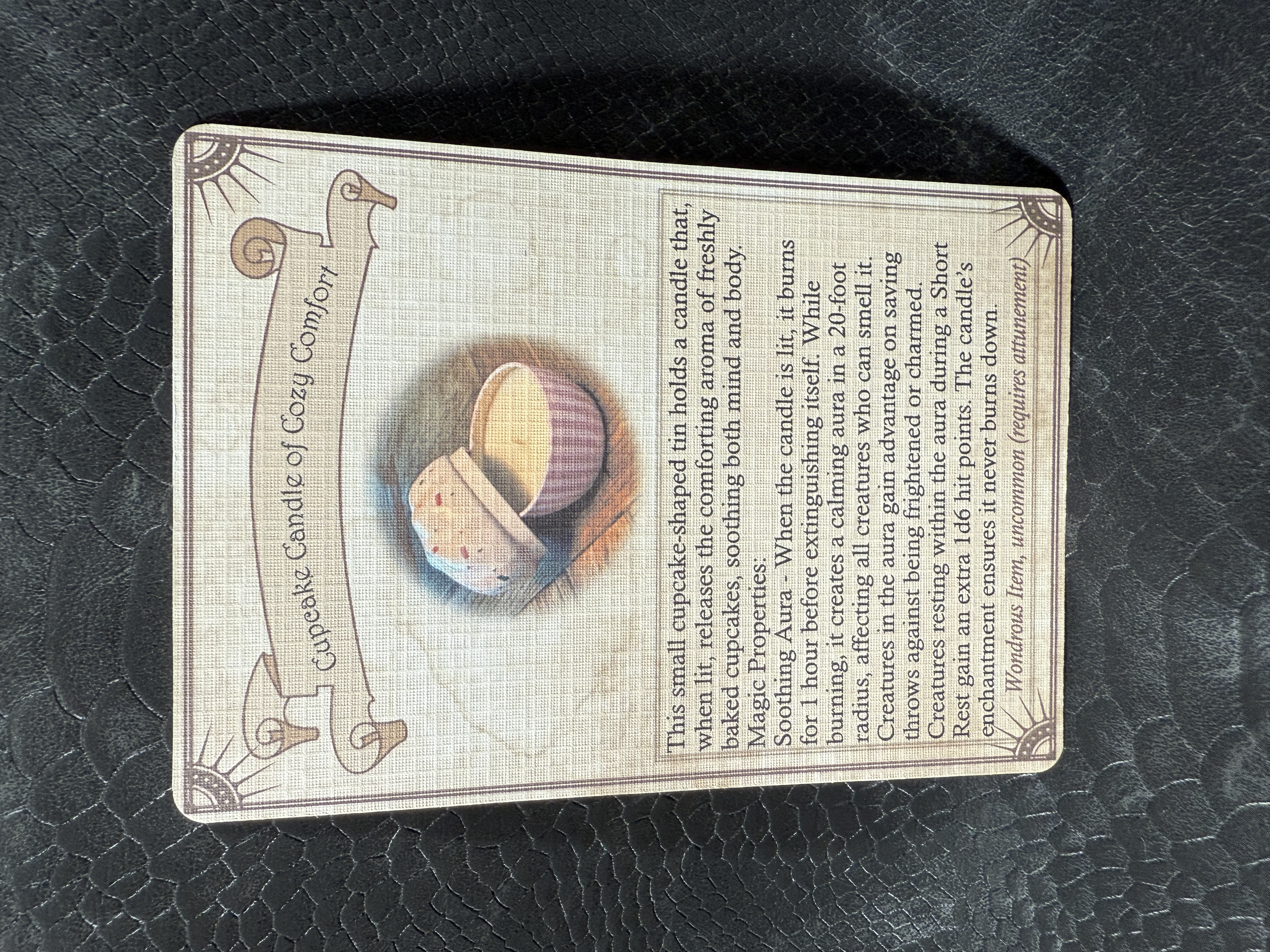 The Cupcake Candle of Cozy Comfort comes with a cupcake-themed sharp edge dice set, a magic item card (also accessible on D&D Beyond), and a cupcake-shaped tin candle, to bring both warmth and whimsy to your gaming table. The candle releases the comforting aroma of freshly baked cupcakes, a scent so sweet, even the fiercest dragon might pause for a sniff.