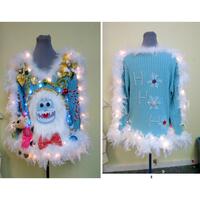 Tacky Ugly Christmas Sweater Don we now our Ugly Christmas Sweater. From rummage sales to grandma's closet, we search out the best in the Tackiest Christmas apparel. This is for a custom bumble sweater, we will make you one in the size of your choice. It will include the bumble made from furry fabric, A light up star, Merry Xmas across the sleeve. Your sweater will include 2 plush characters from the island of Misfit toys (santa, snowman, elves or one of the toys). Colors of the sweater and garland may vary, as well other decorations due to availability. If you have a size preference for women or men include that with the order or convo me. You can also put a color choice for the sweater, but we may not be able to always accommodate, since every sweater is done on pre-owned sweaters. All items ship via priority mail. For size, these are men's sizes, if you need a womens- just include a message as to what women's size you need.