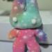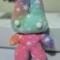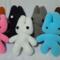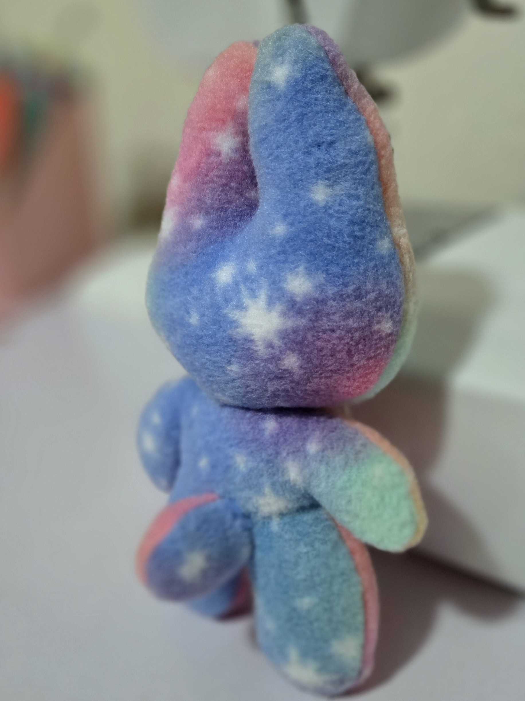 This plush toy stands at about 7 inches or 18 cm from toe to ear, and is made entirely out of soft, huggable fleece and polyester stuffing. The eyes are soft pompoms. The design is entirely original.
