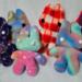These plushies are made with super soft fleece, polyester thread, Polyfill stuffing, pompoms, and optional plastic squeakers. A sewing machine is used for the larger stitches, but the head and tail are sewn on by hand!