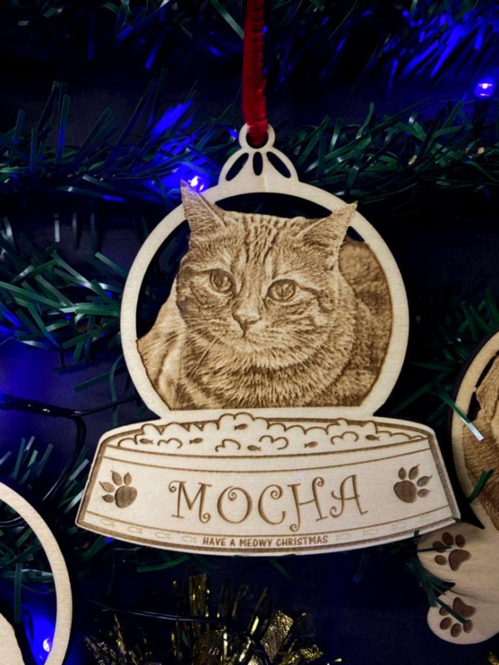 We will put your cats photo on a custom designed Christmas ornament engraved with your pets name! Ornament is 5" tall and about 4-1/2" wide.