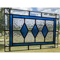 This lovely Stained Glass Panel Measures 14." x 20". This panel is in stock with 43 bevels. All other sizes are a custom order and no two are exactly alike.