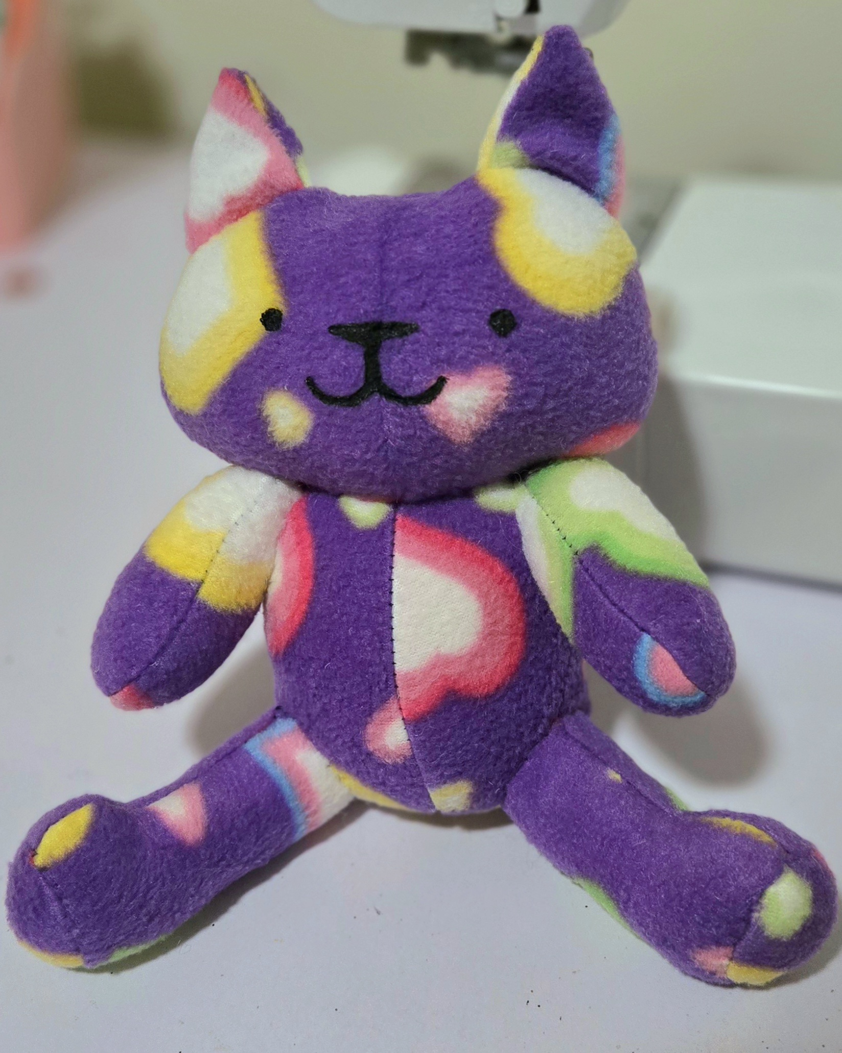 These plushies are made with super soft fleece, polyester thread, Polyfill stuffing, fabric paint details, and optional plastic squeakers. A sewing machine is used for the larger stitches, but the smaller parts are sewn on by hand - including the head, paw pads, legs, arms, and tail!