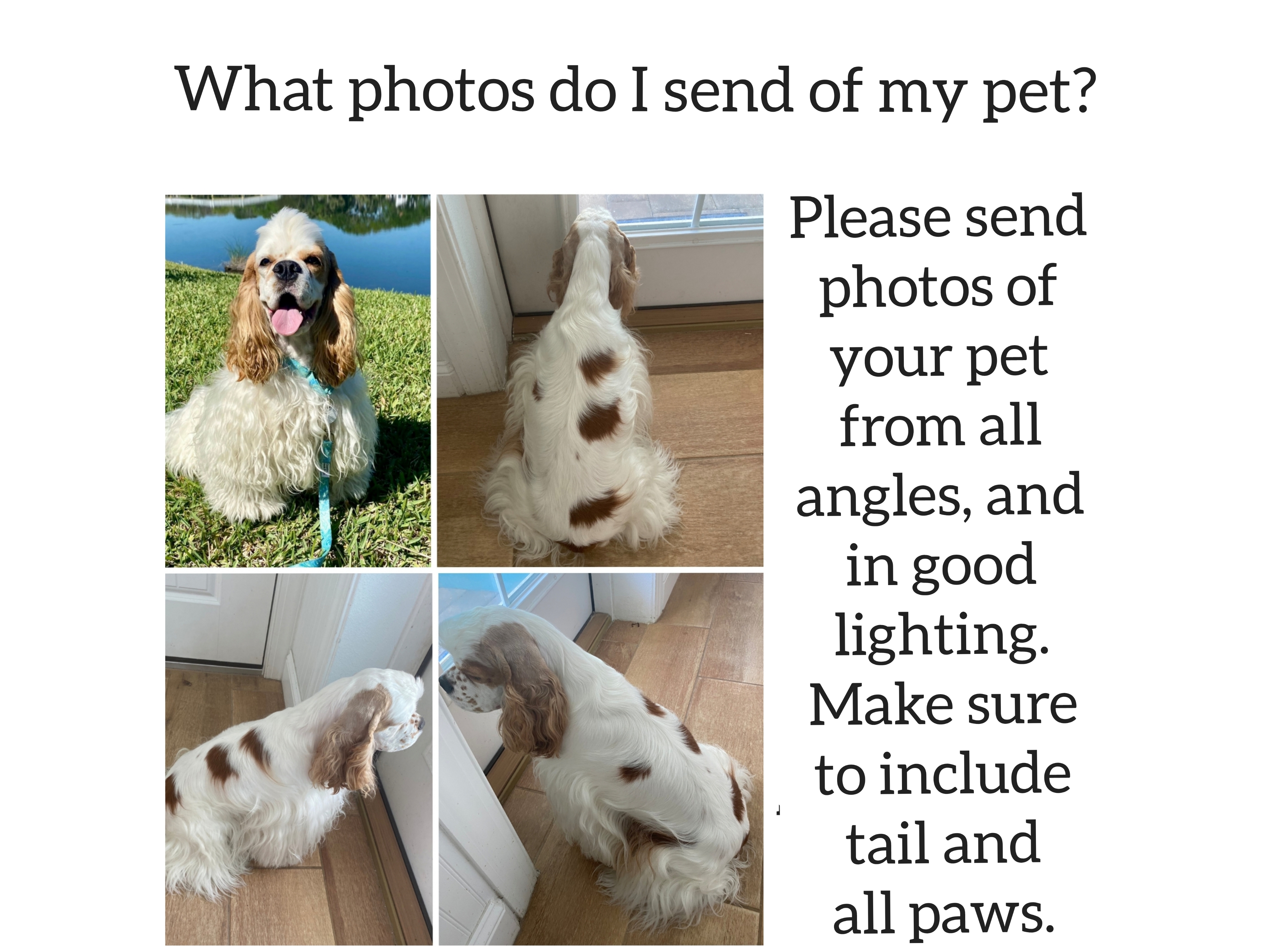Please upload photos of your pet here. You can also send additional photos/angles of your pet(s) in a message