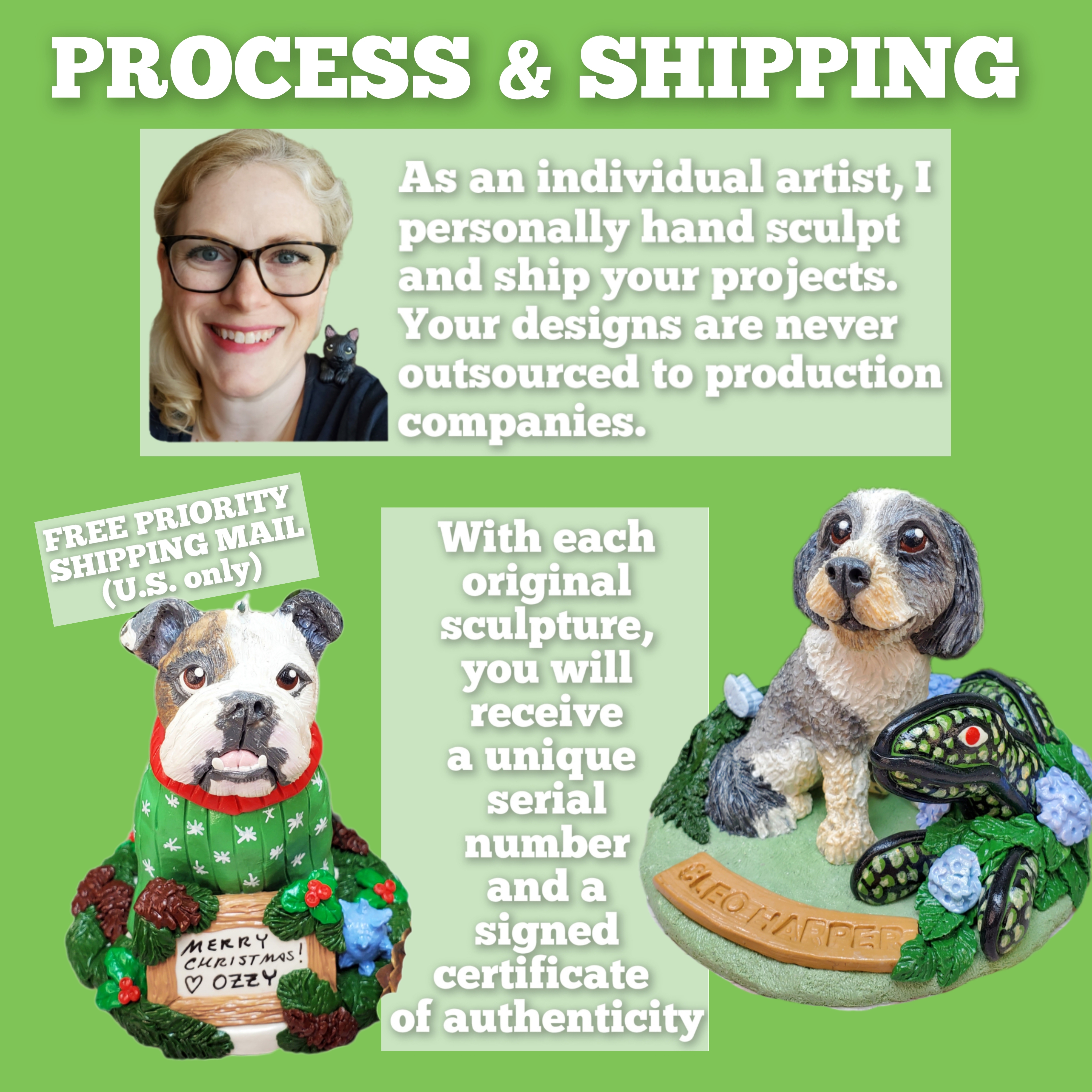 I have been sculpting and selling custom pets online since 2007. All of your orders are handmade by me, and only me, in the USA. I sign and date each custom project, and you will receive a signed Certificate of Authenticity with a unique serial number for your one of a kind original sculpture.