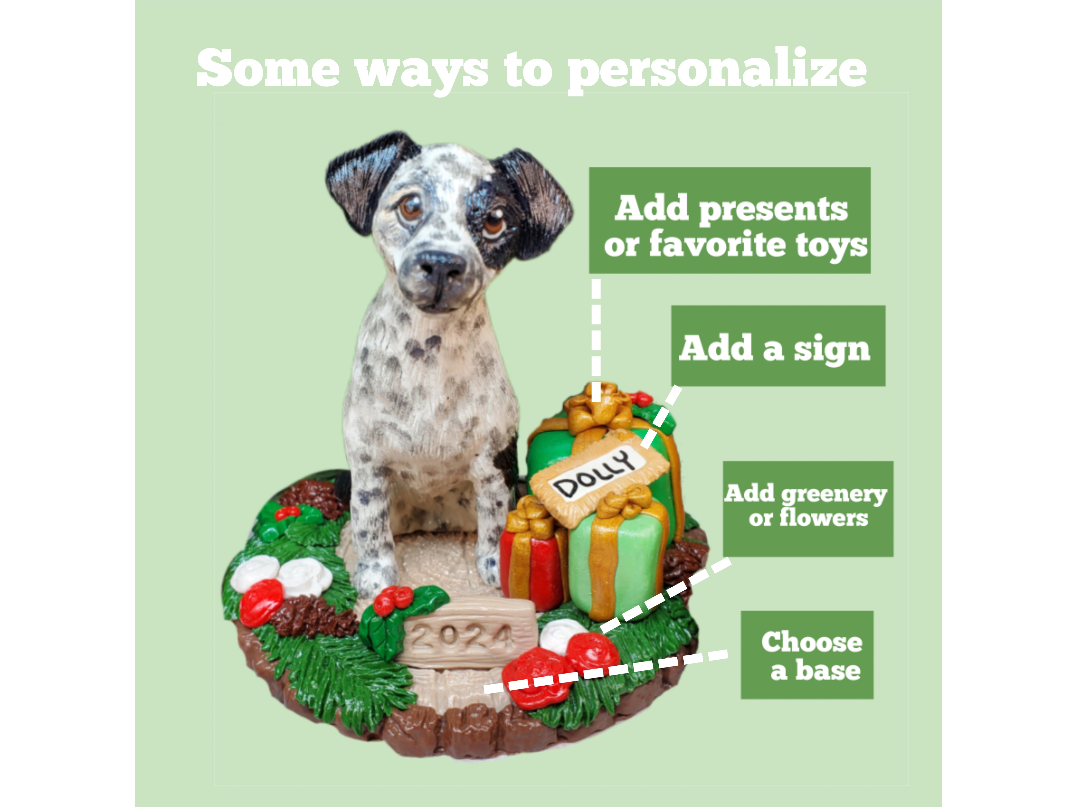 Please specify preferences for pet's pose, accessories, and colors. Single pets may be ordered free-standing or with a base. For multiple pets on one ornament, a base is needed.