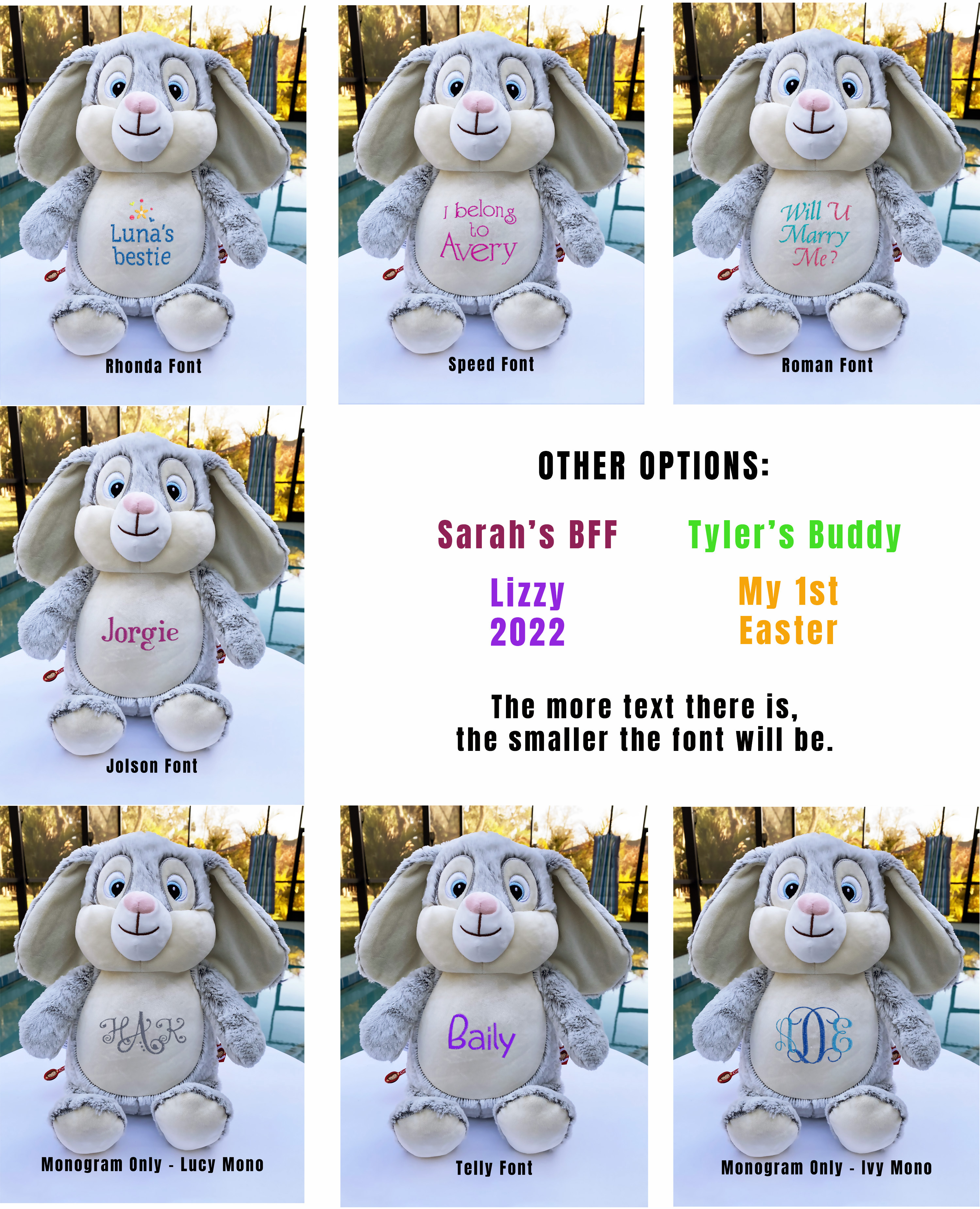 Every plushie can be personalized with any name and you can choose between the other options for an added fee: