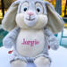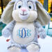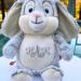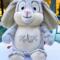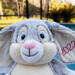 This adorable bunny is 17" from the top of the head to the bottom of its little feet, and can be customized to fit your special occasion. When sitting, the bunny is about 14" tall, and sooo soft and smooshy and huggable!!