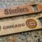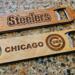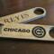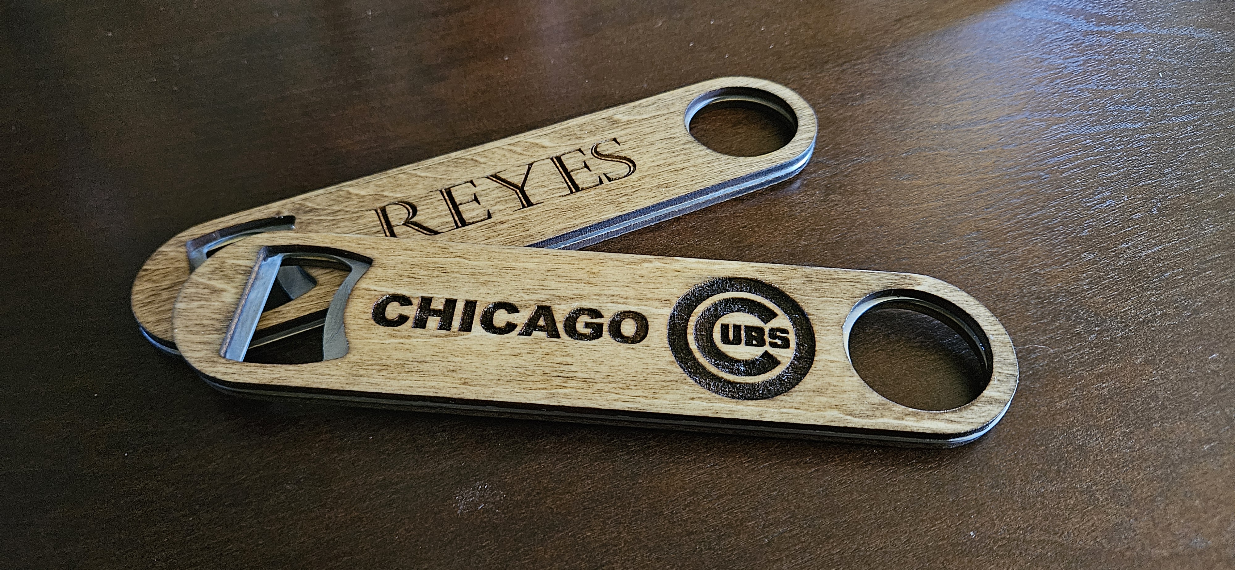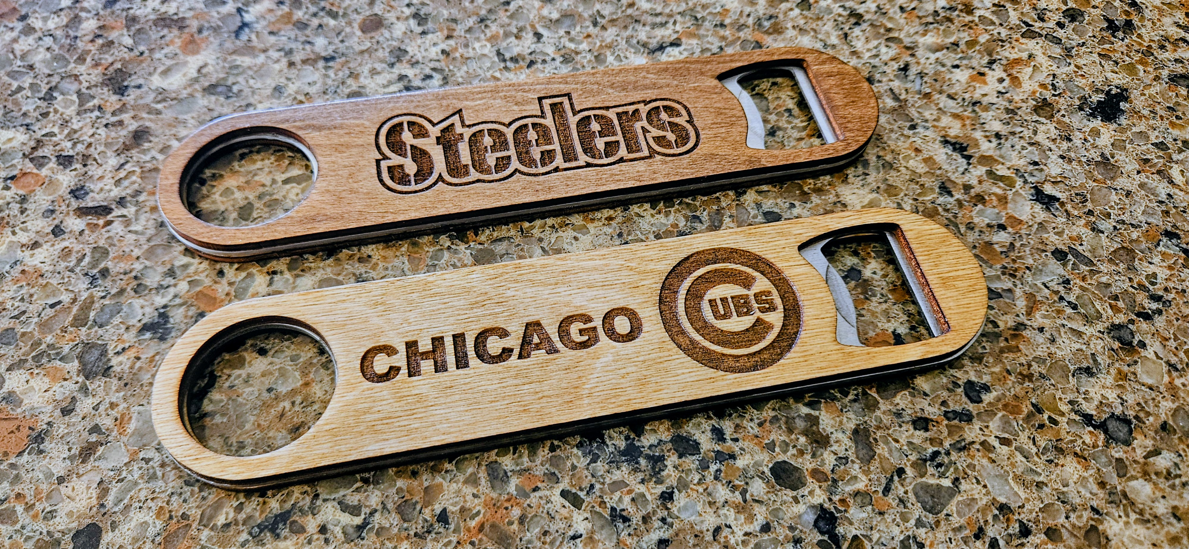 Steel 7 inch bottle openers with custom engraved wood covers.