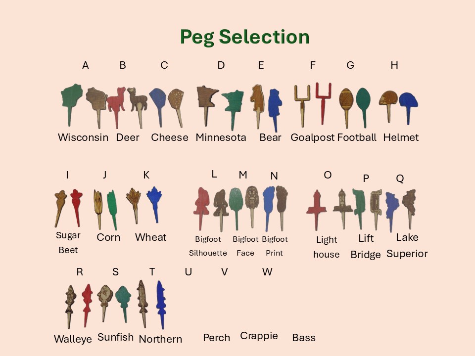 Crafted with precision and care, each set includes six pegs made from durable wood and carefully engraved with a variety of themes. Choose from options like Bigfoot, wildlife, sports, and state shapes—or request a custom design to make your cribbage game truly your own! These pegs also make wonderful gifts for cribbage enthusiasts, campers, and collectors.