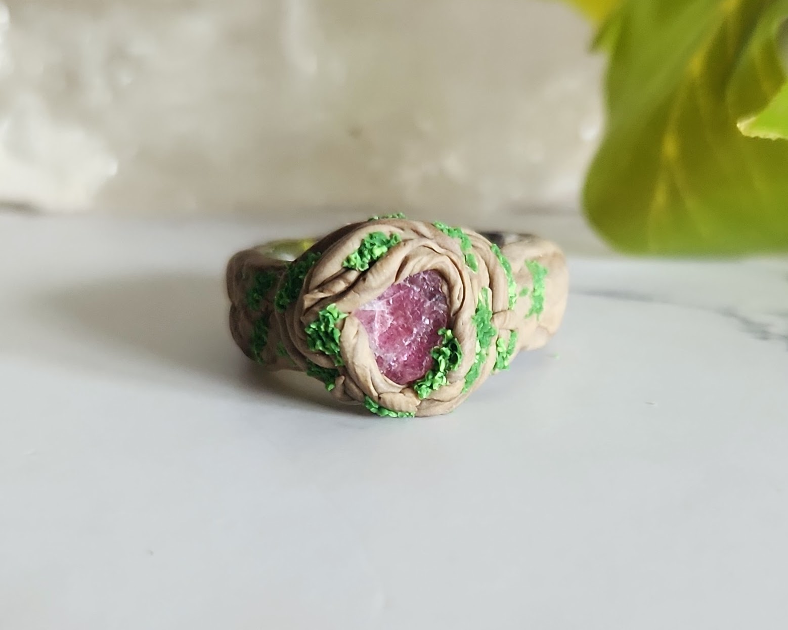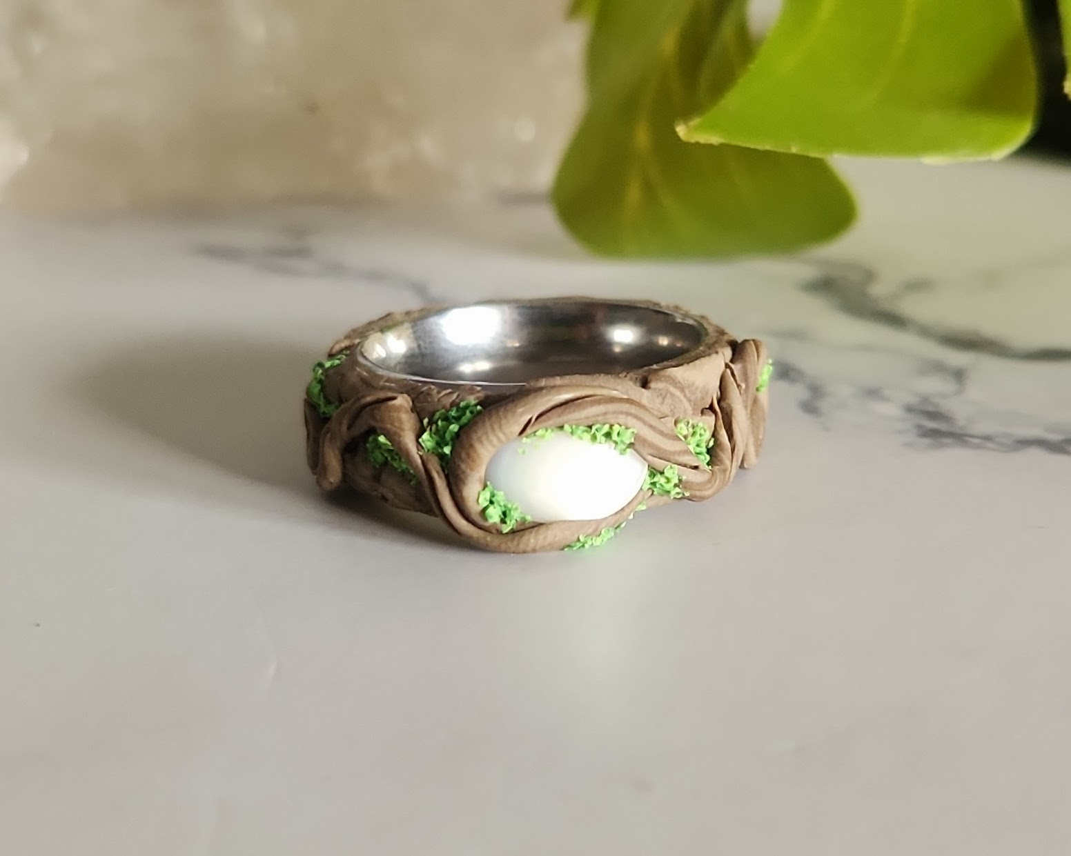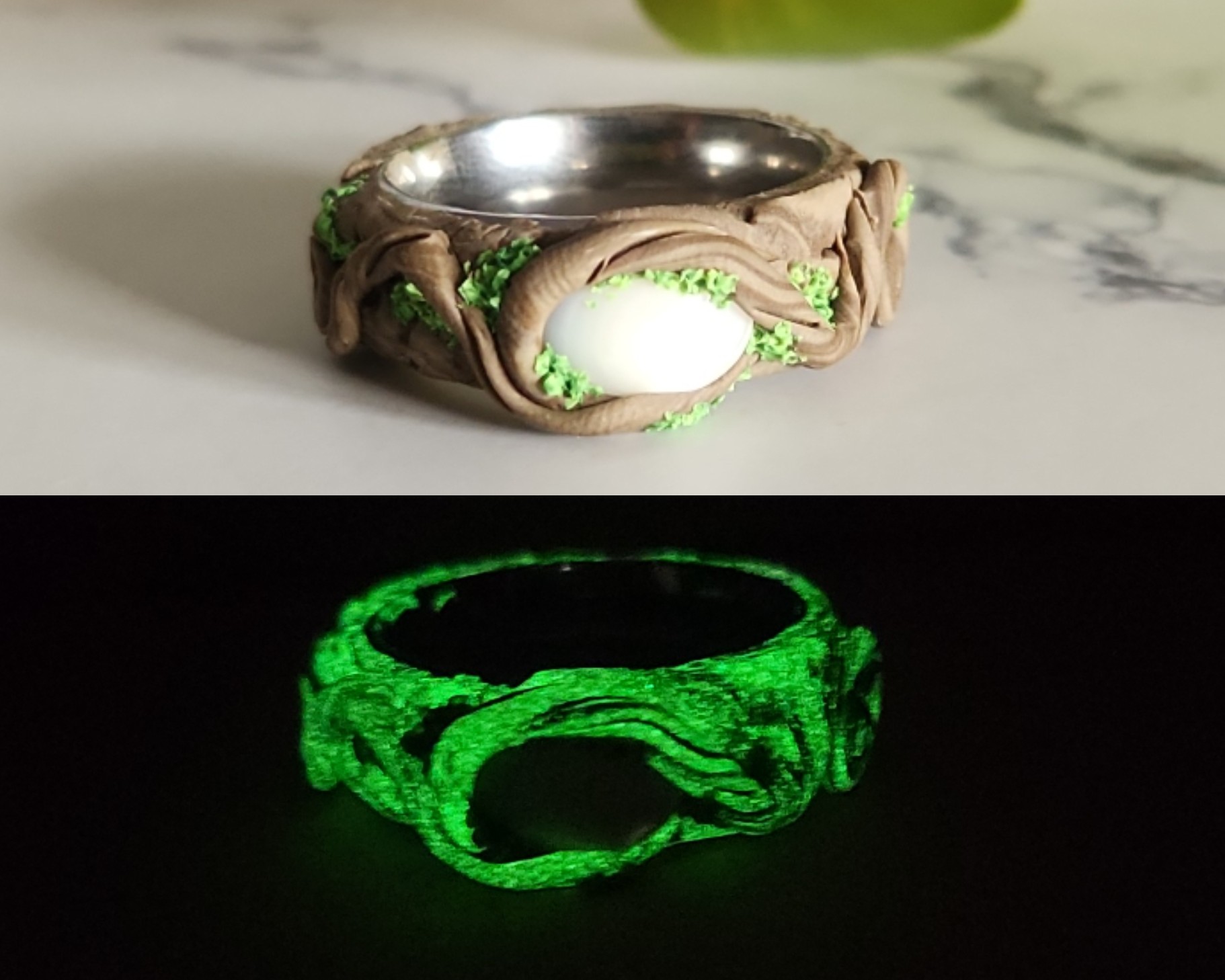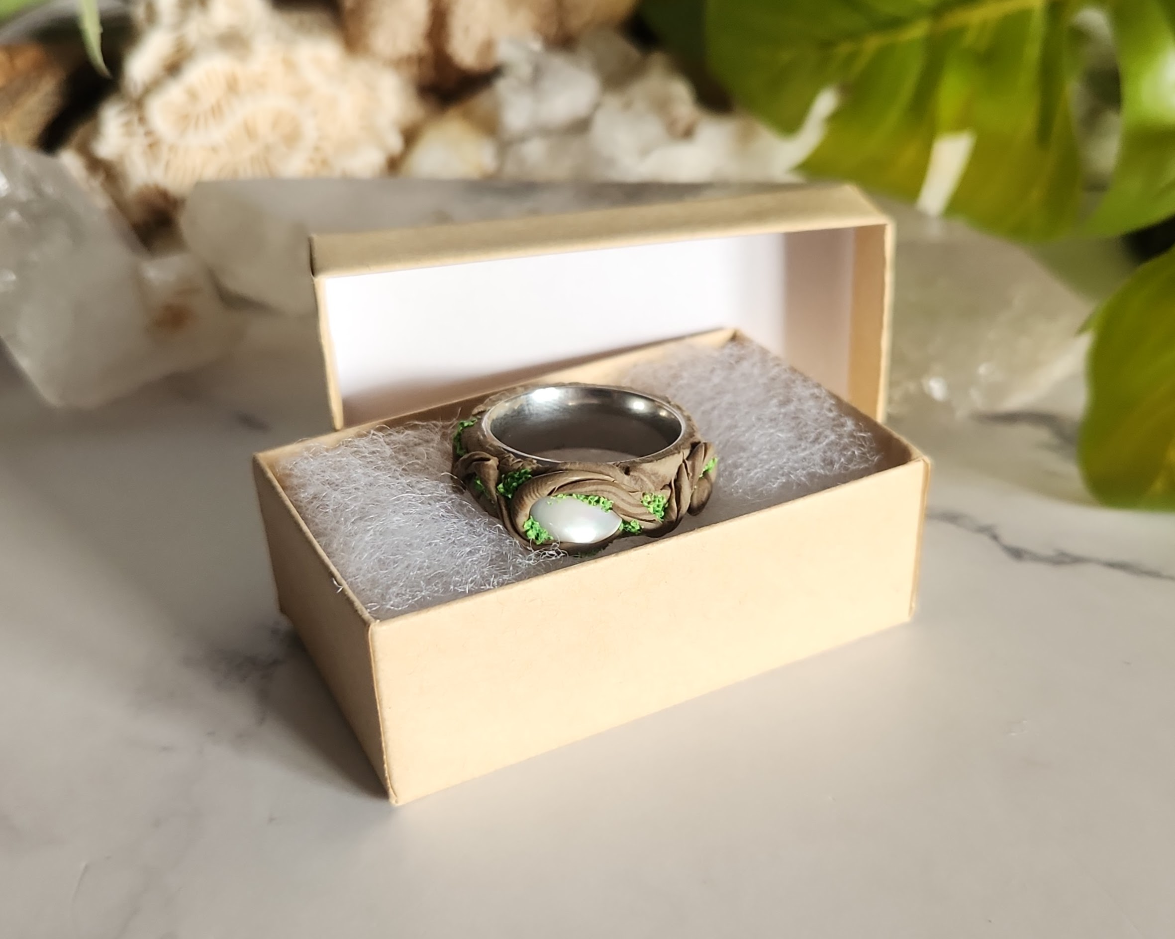 Mother of Pearl and Pink Tourmaline rings, both size 9.5, comfort fit Stainless Steel band with Polymer Clay (glow-in-the-dark).