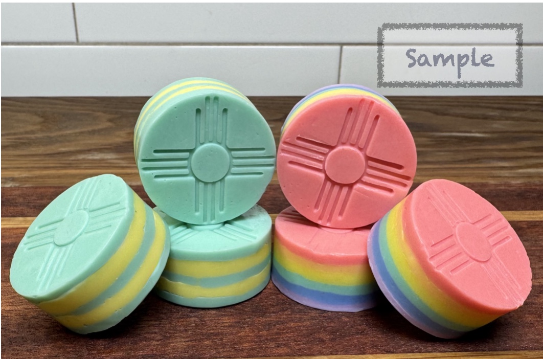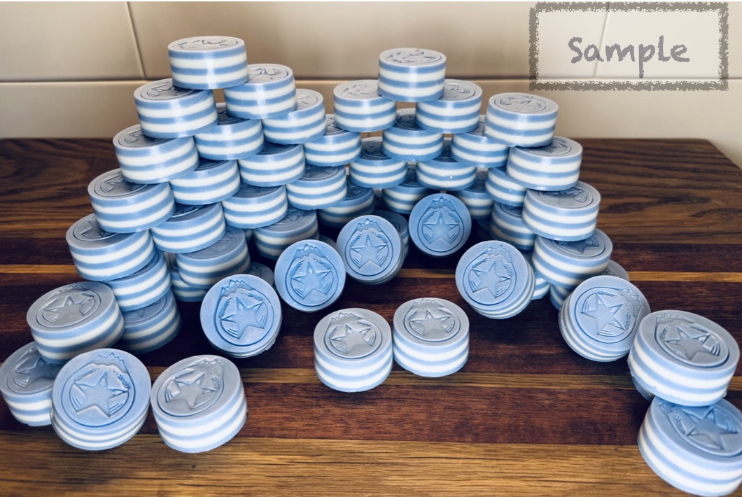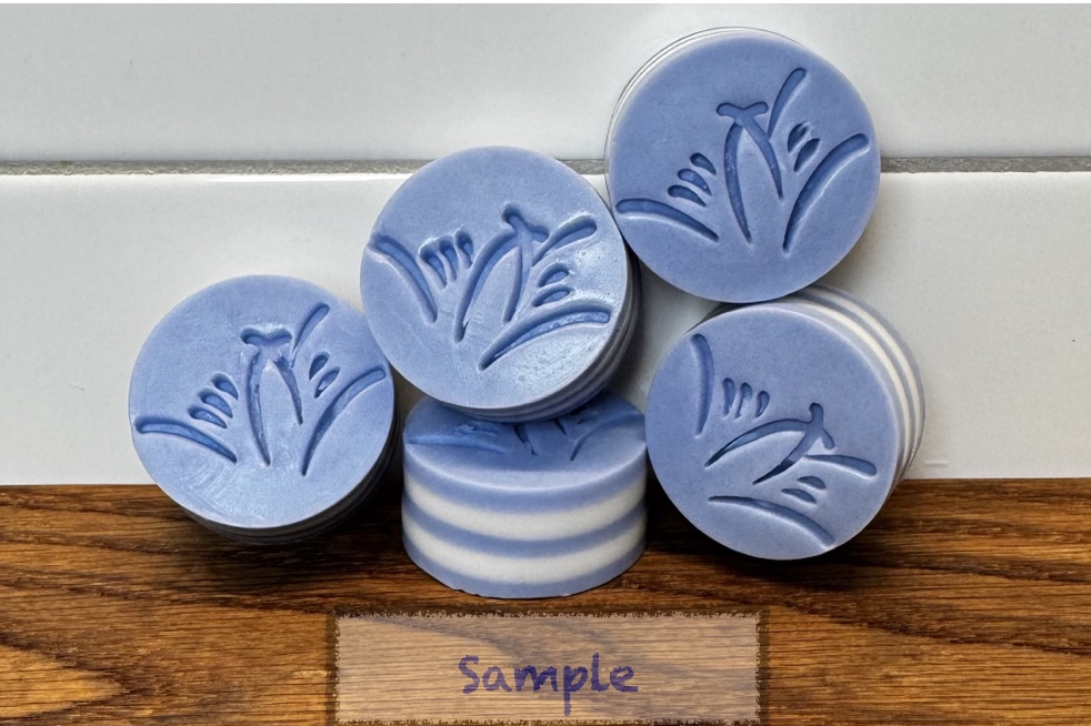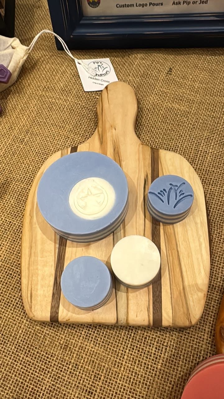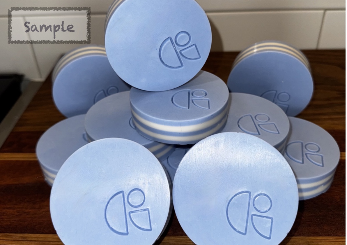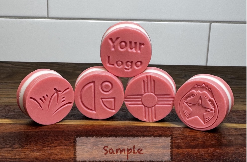 After we create your custom logo stamp, we'll brand your soap using your logo for no additional charge. We can also create a logo inlay for the Full-size pours for an extra $1.00 per bar. Please email us at pipspours@gmail.com so we can discuss your details. You provide black and white line art of your logo, we'll take care of the stamp. We cannot create or modify logos.