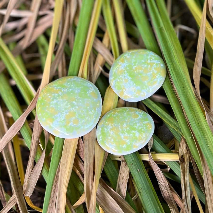 The glaze reacts uniquely with the cremains, creating organic textures and variations that makes each piece truly one of a kind. The touchstones shown here were made in honor of a woman remembered for her love of daffodils, reflected in the soft yellow and light green glaze tones.