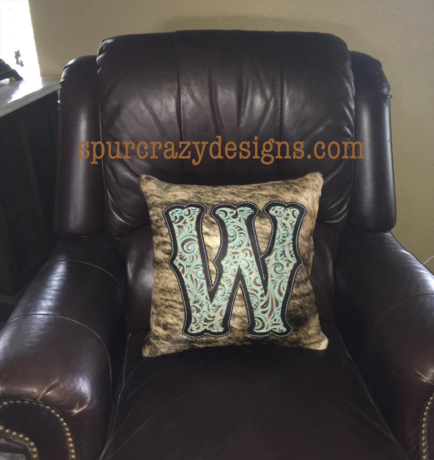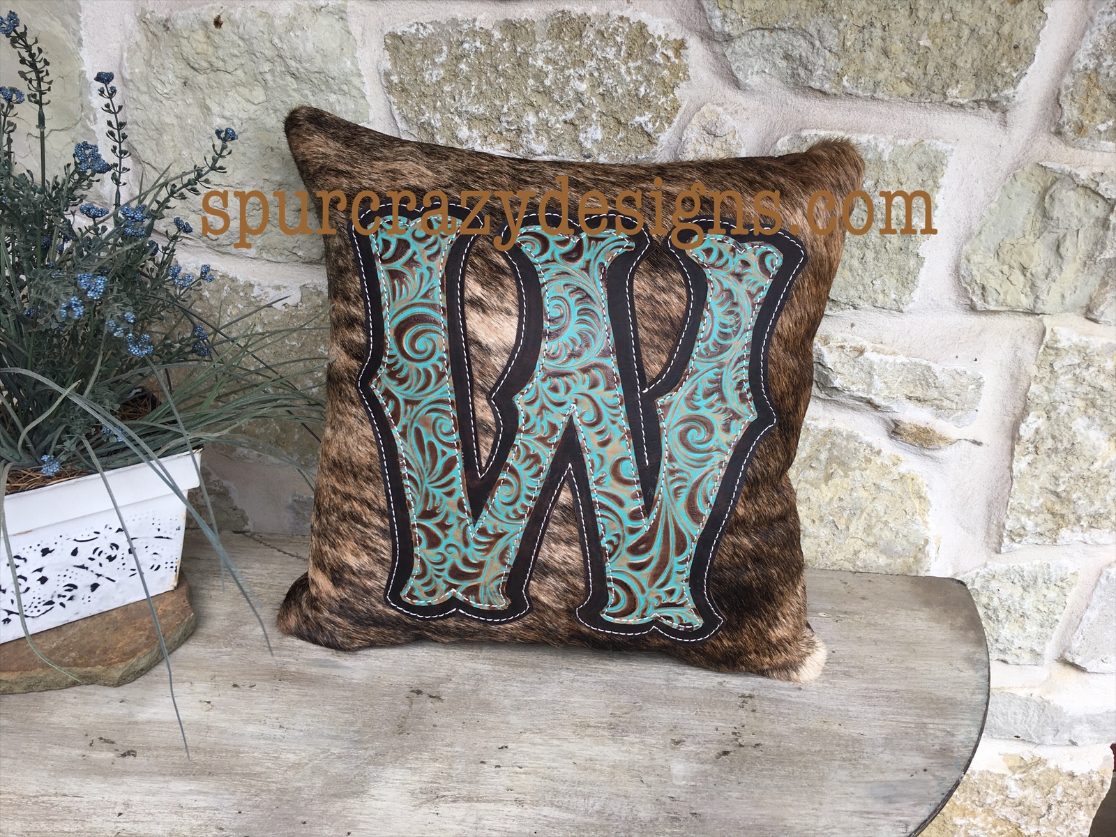 Custom Monogram Cowhide Pillow Brindle/Turquoise Caracol