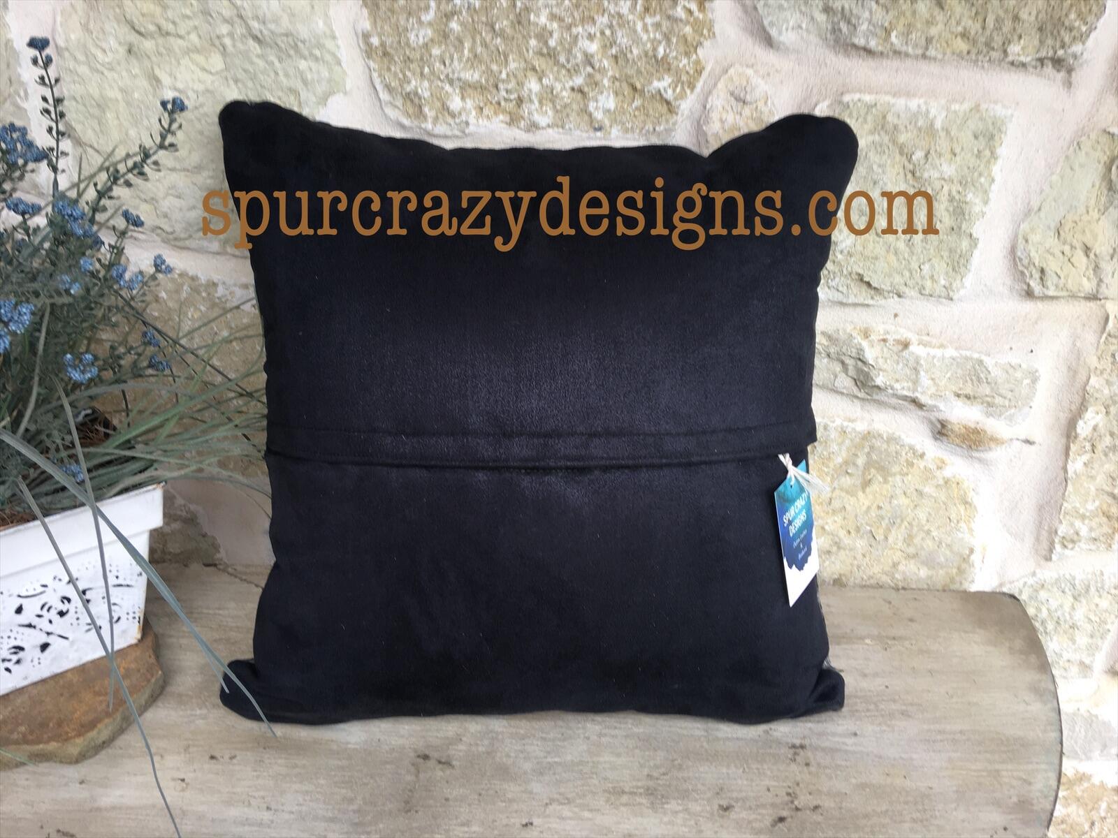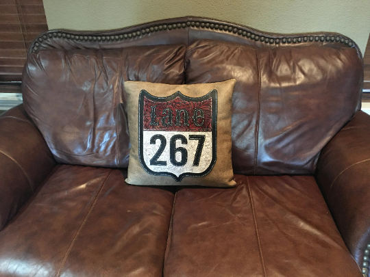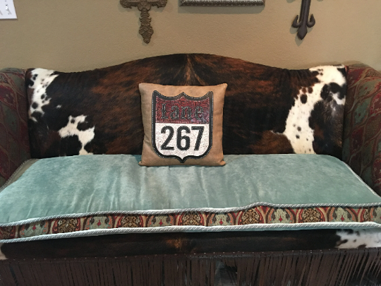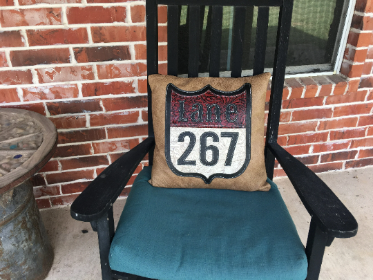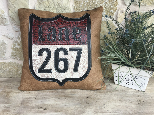 Are you a Lane fan? How about a pillow representing his legacy? 267 was the last rodeo number he wore. What a way to show a tribute to such a legend! The top of the shield is a red floral embossed leather, and the bottom is an oyster pearl embossed leather. The name and number are smooth black leather. The pillow is made of tan smooth leather with the rodeo shield applique that is outlined in smooth black leather. The white stitching really makes this design stand out! The back has a black faux suede material with a hook and loop opening so the insert can be removed for cleaning. It goes with ANY home decor style, not just western or rustic.