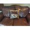 The monogram pillows are 18"x18" and have a 20"x20" pillow insert to help maintain the fullness. The front of the pillow is brindle cowhide. The monogram is made of embossed leather and trimmed out with a complimenting, solid colored, smooth leather. The back is made of a microfiber material and has a velcro closure. Pillows may be ordered with or without leather fringe. The fringe is 12" long. Custom orders are welcome.