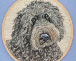 All of my custom portraits are made of 100% wool and are done by poking wool onto a background (either wool or linen) with a special barbed needle. I then layer colors to achieve a "painted" wool portrait.